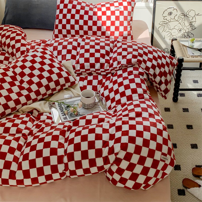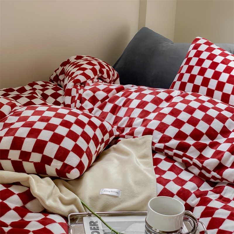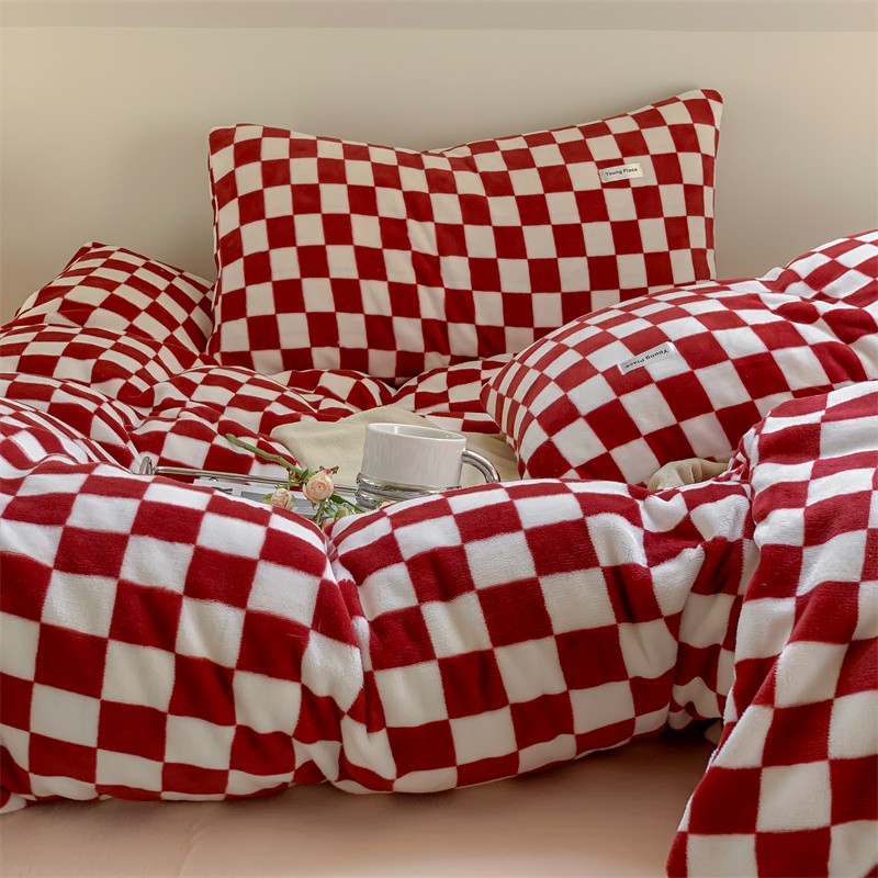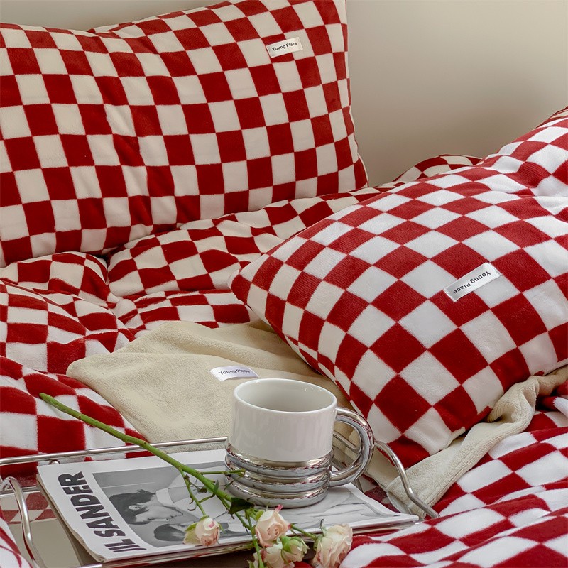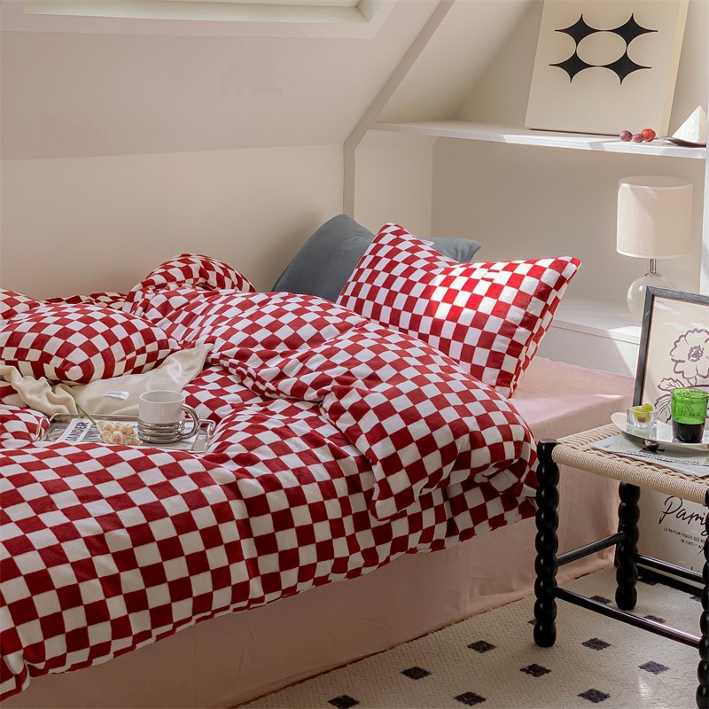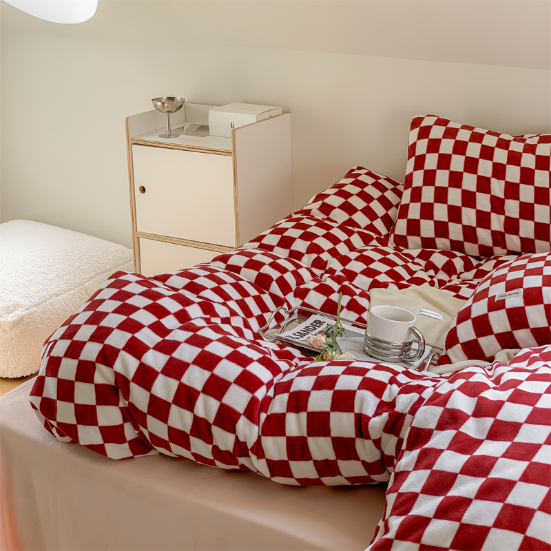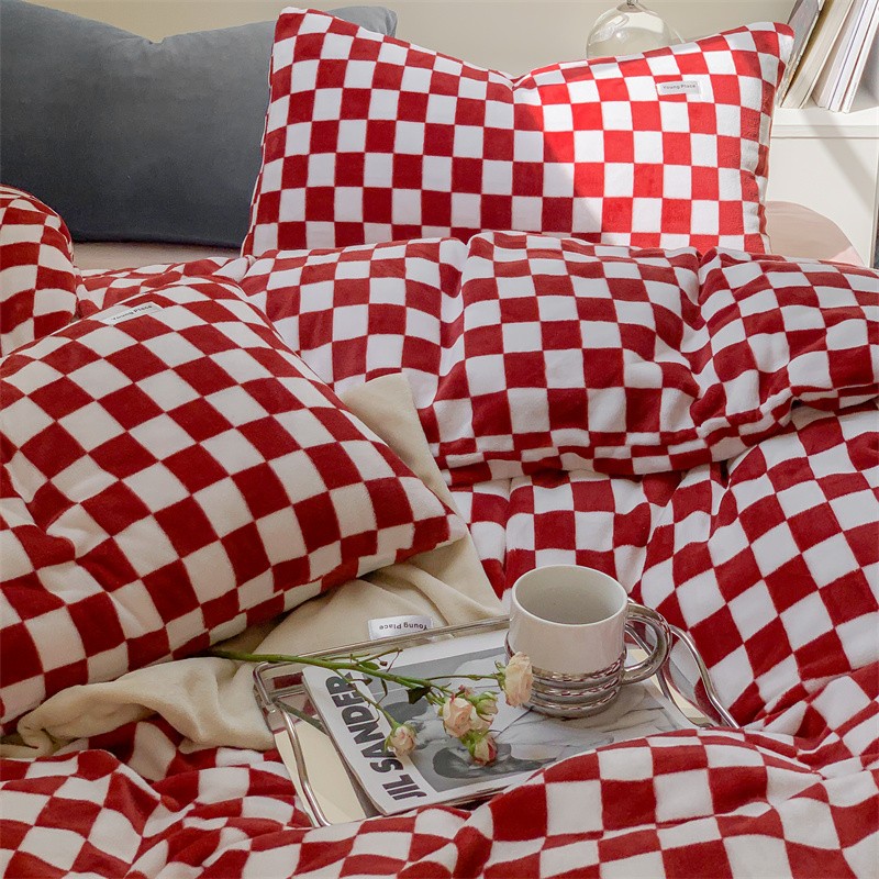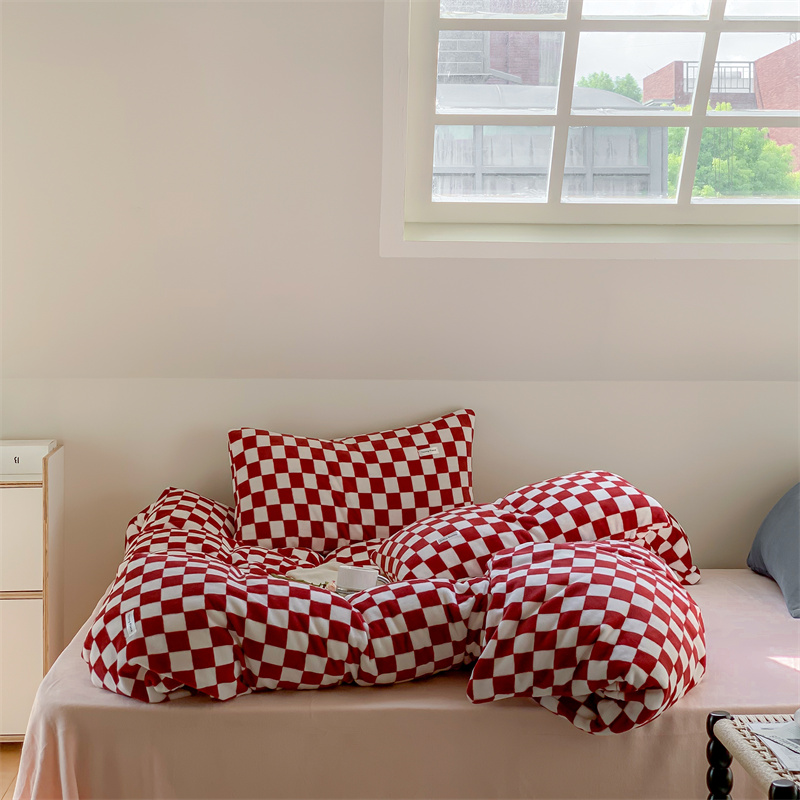 洋铭区2022新款小清新撞色系列绒四件套 棋盘格红