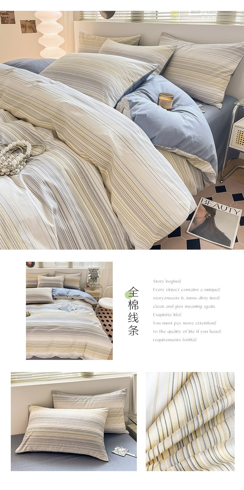 (总)小懒猪 2026新款全棉印花北欧风系列四件套,素环影,清棱,线影轻痕,铂格纹,墨旋,素律,蓝灰格序,蓝絮银织