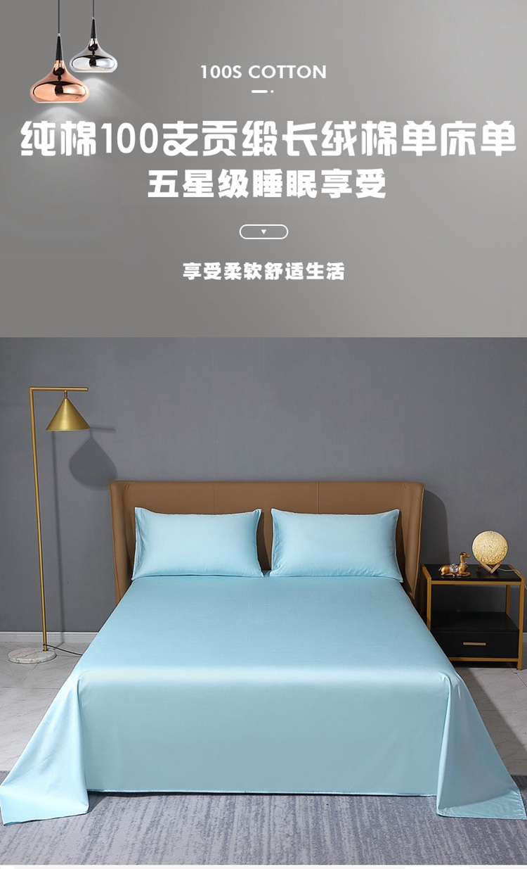 晶缦家纺2023新款纯棉50支双股贡缎长绒棉纯色单品床单 纯沐-浅天蓝