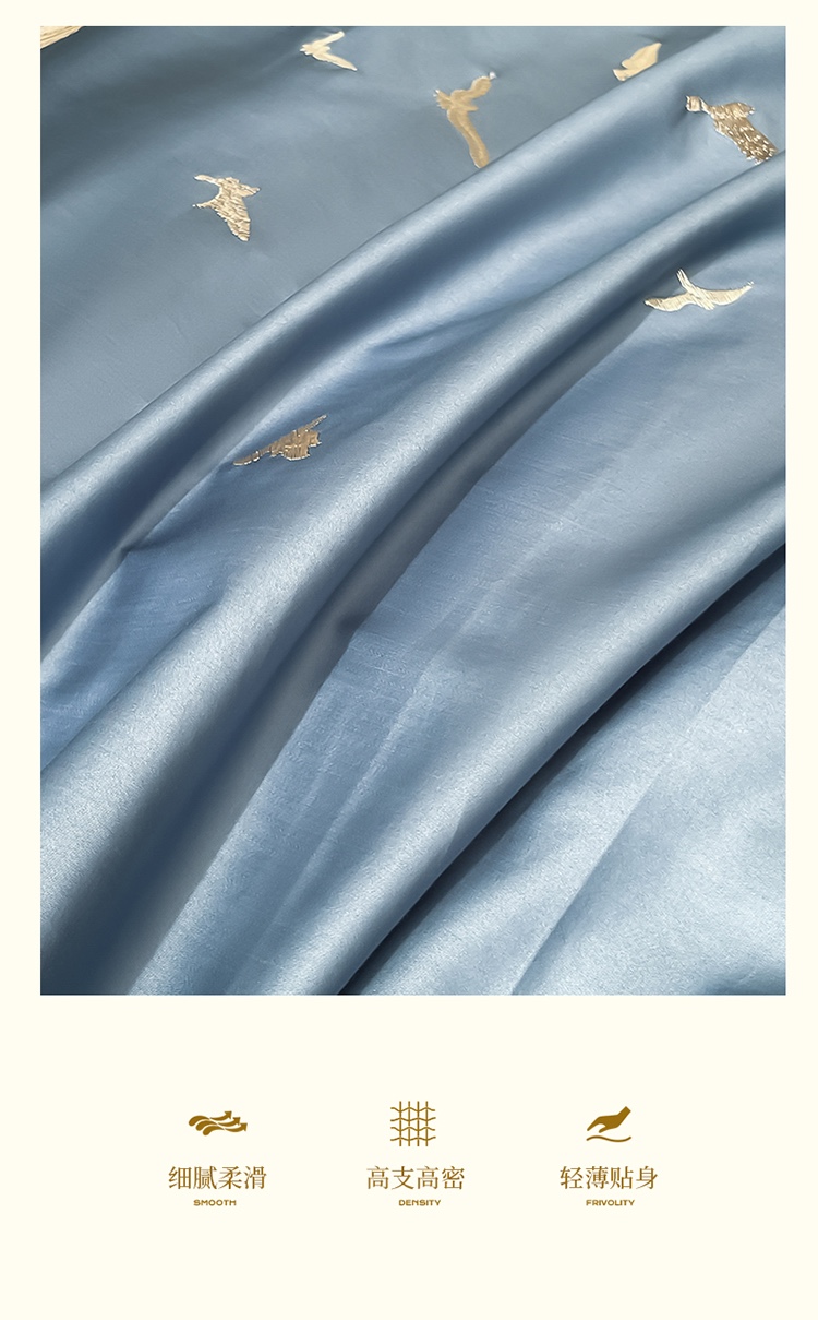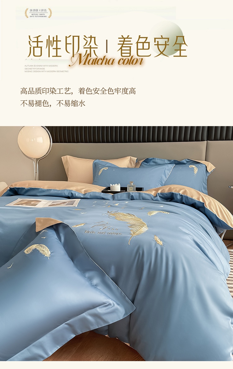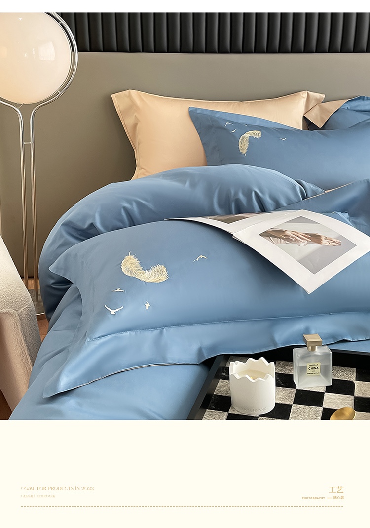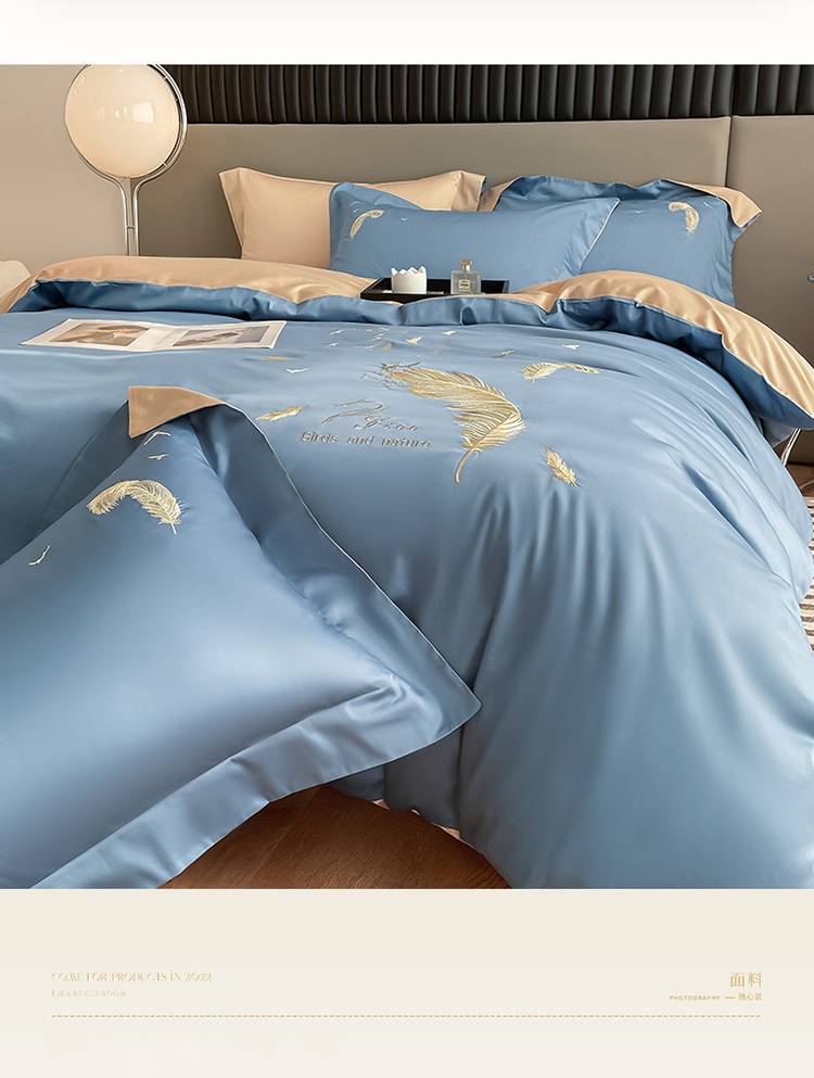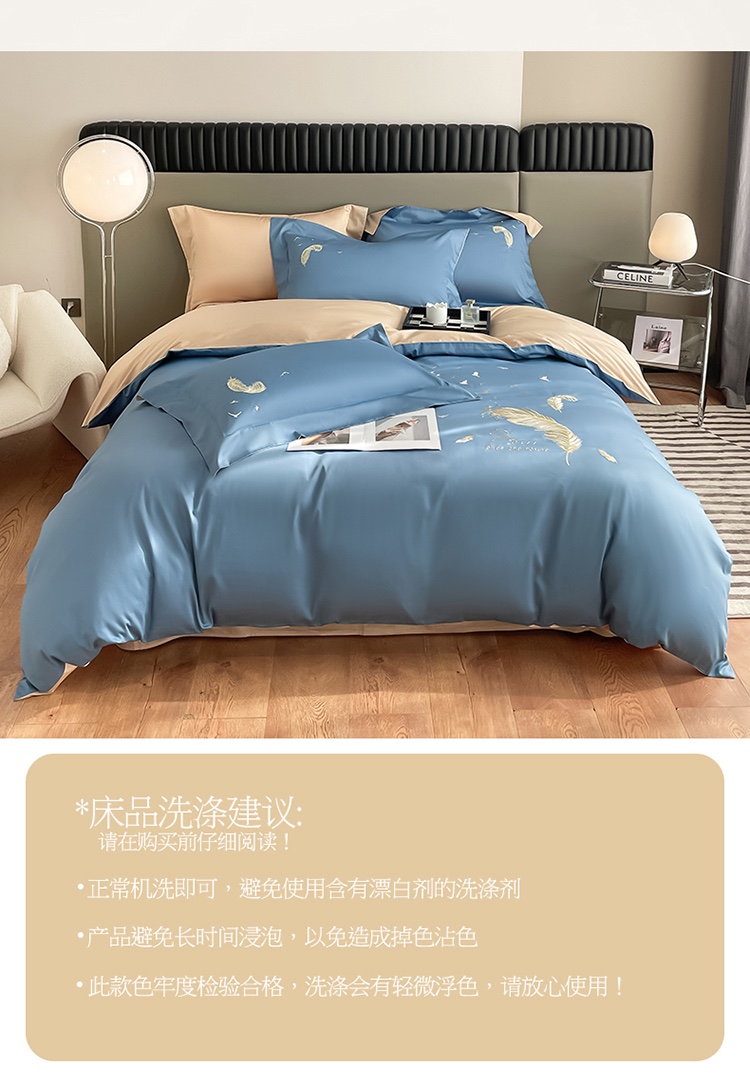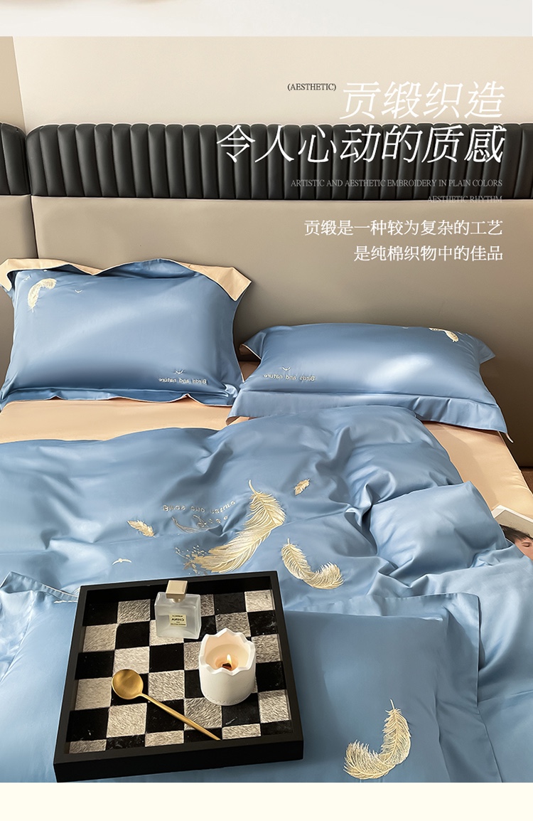 商品名称:蓝米卡夫 2024全棉高级感长绒棉刺绣兰羽系列-单被套 兰羽-宾蓝奶茶