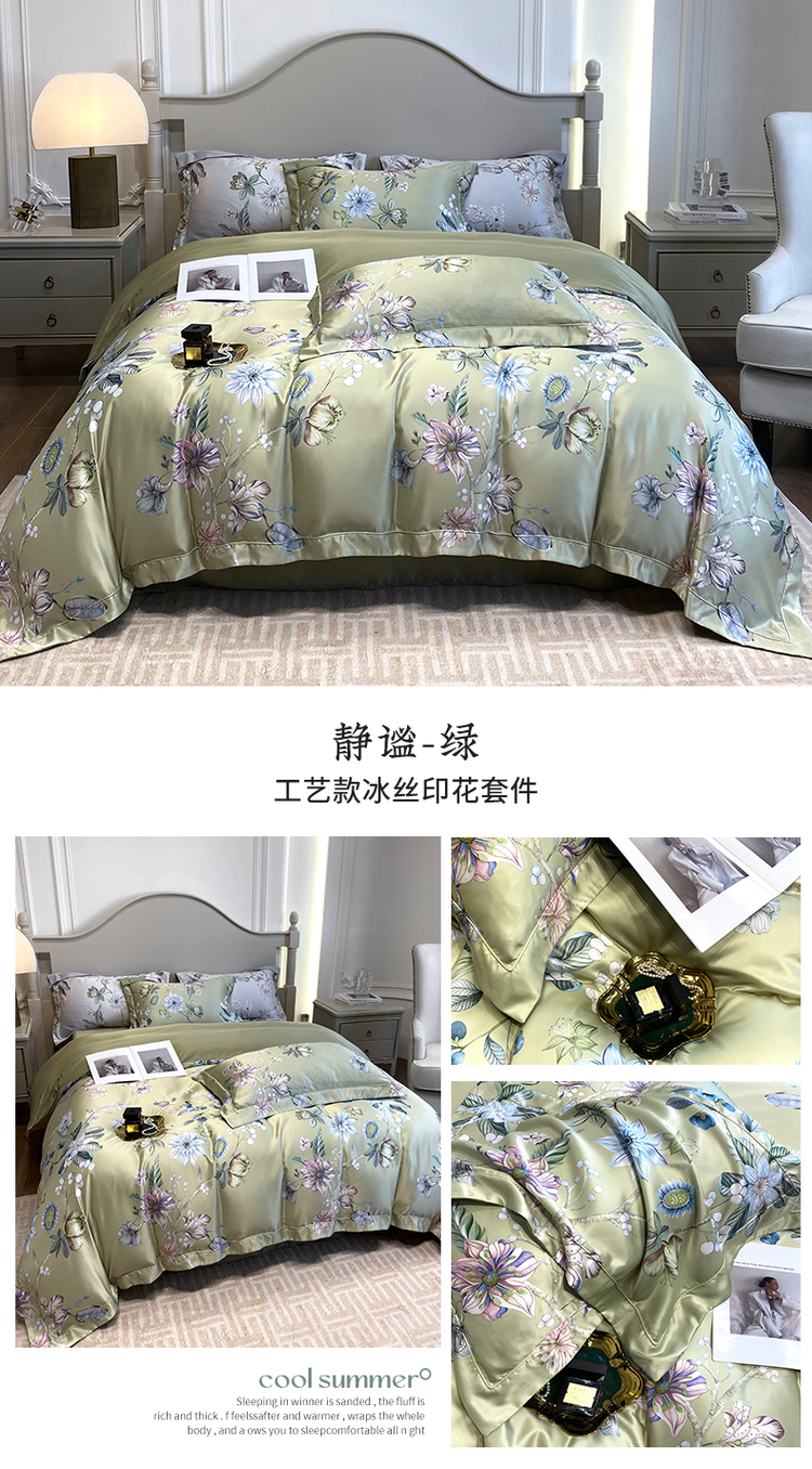 当前位置: 91家纺网 > 商品网购 > 床品套件 > 四件套 > 水洗真丝四件套 > 优悦2023新款印花美式冰丝水洗真丝四件套 静谧-绿