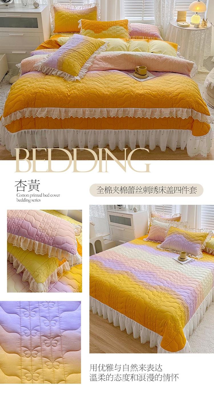 • 91家纺网 家纺一手货源 找家纺  2023新款全棉蕾丝刺绣床盖四件套(夹棉被套) 杏黄