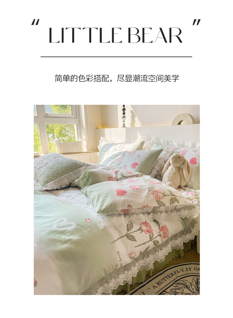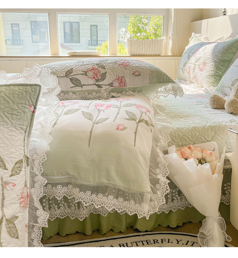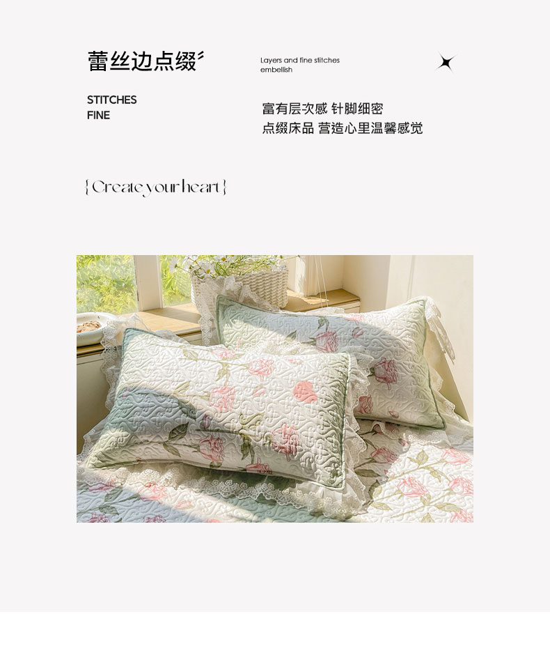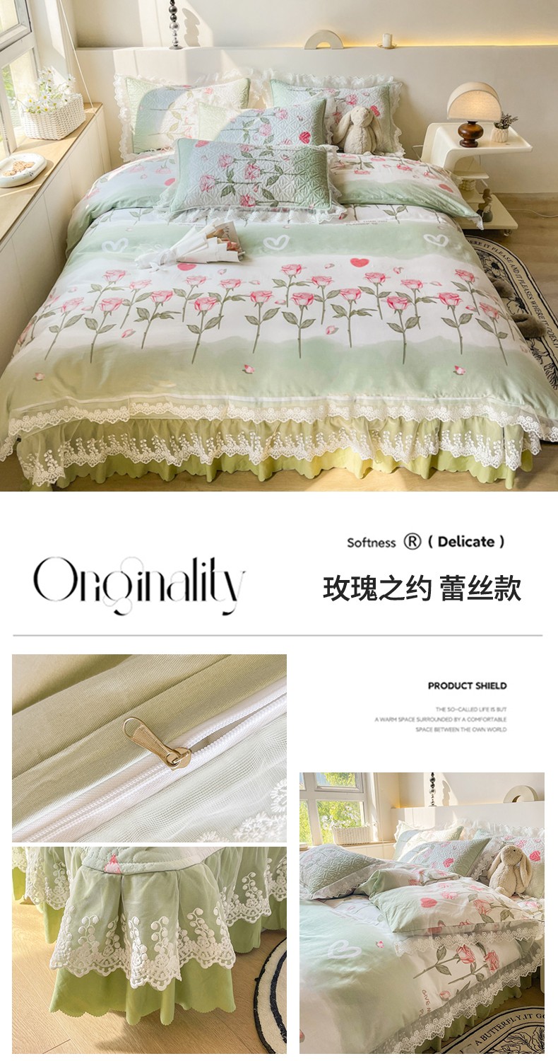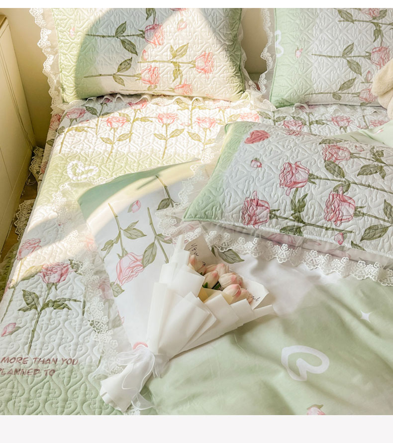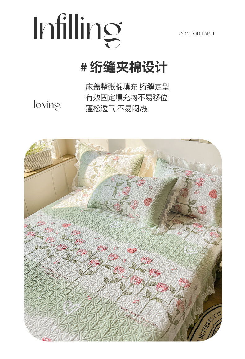 商品名称:添越2024小清新韩版蕾丝款花边纯棉夹棉床盖三件套全棉 玫瑰之约蕾丝款