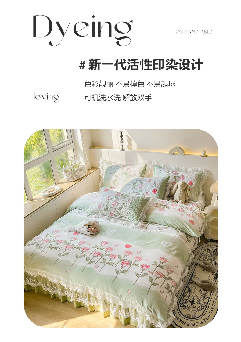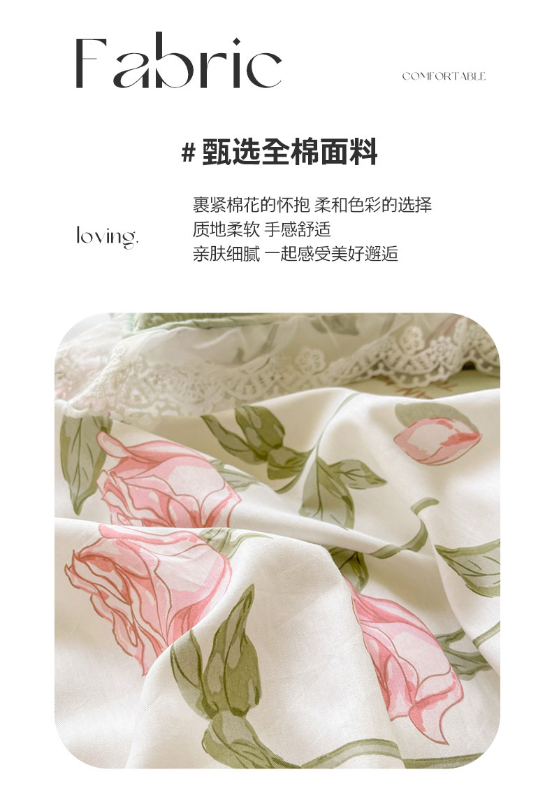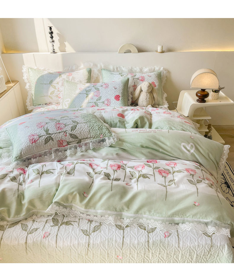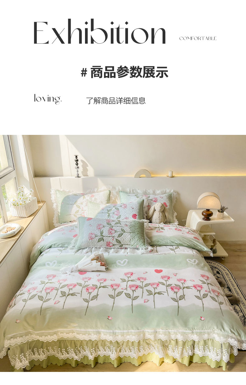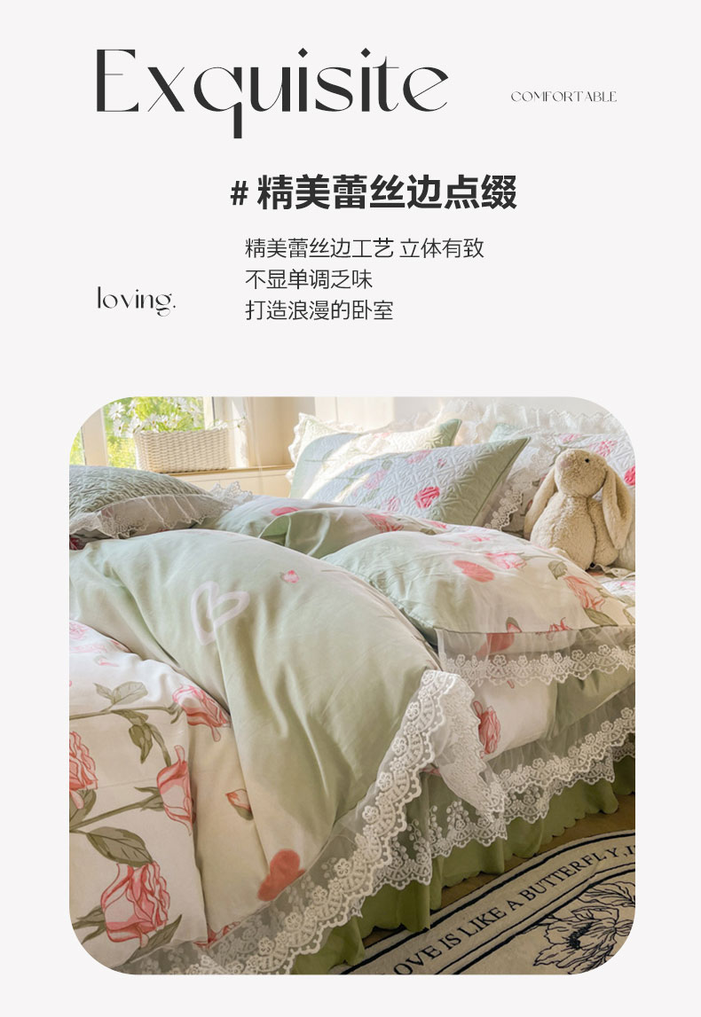 商品名称:添越2024小清新韩版蕾丝款花边纯棉夹棉床盖三件套全棉 玫瑰之约蕾丝款