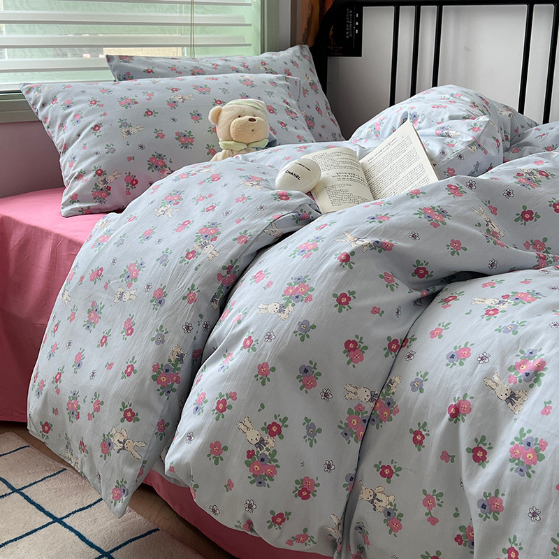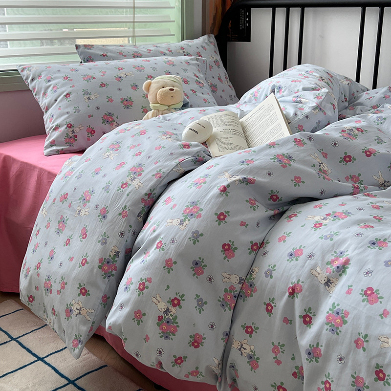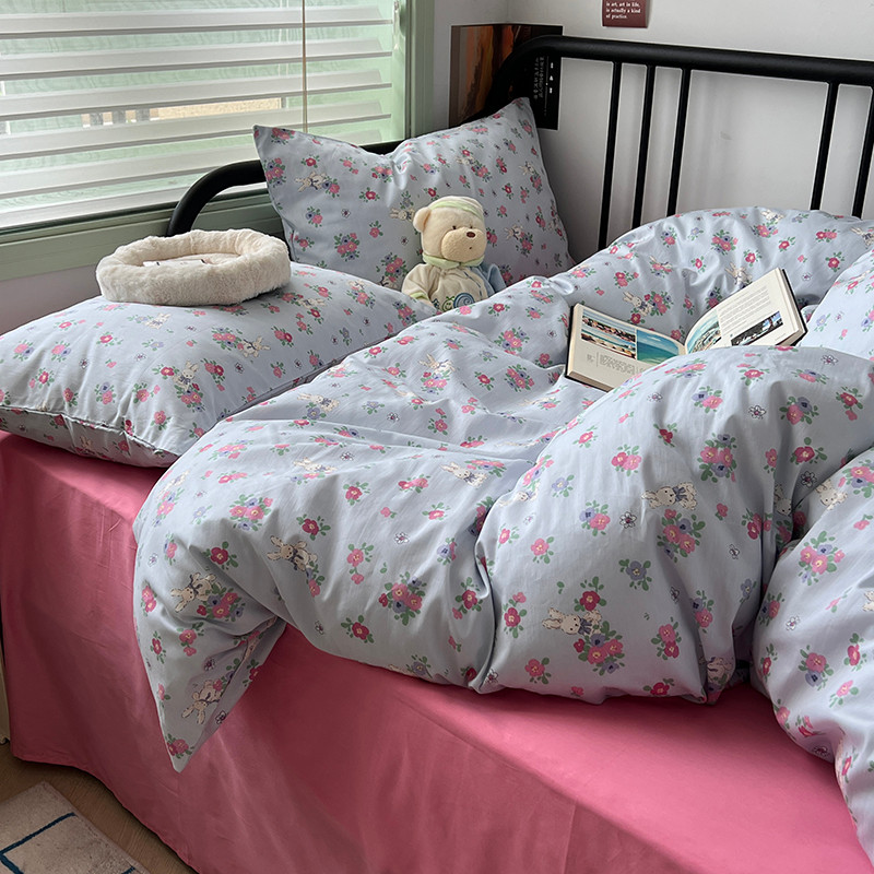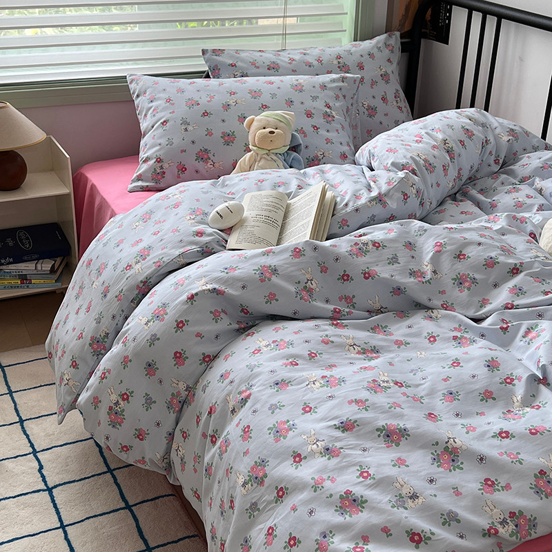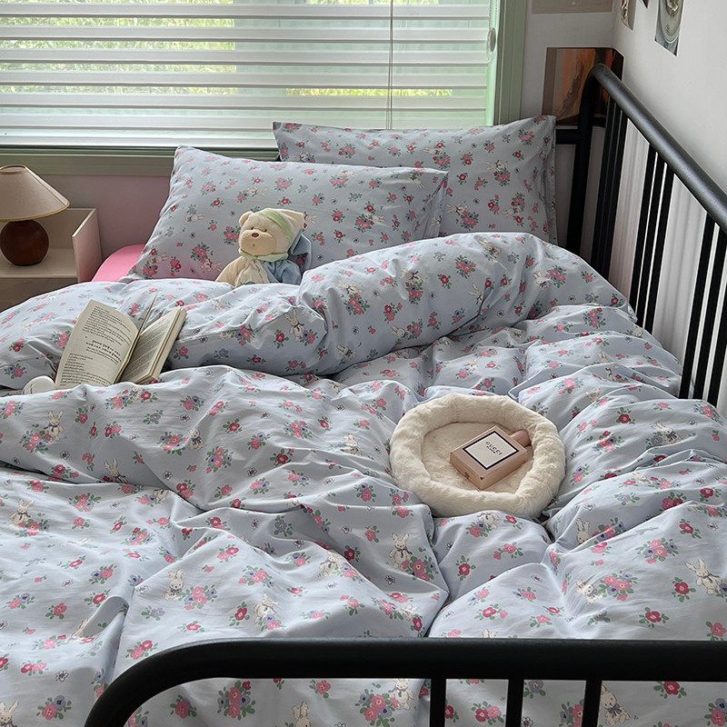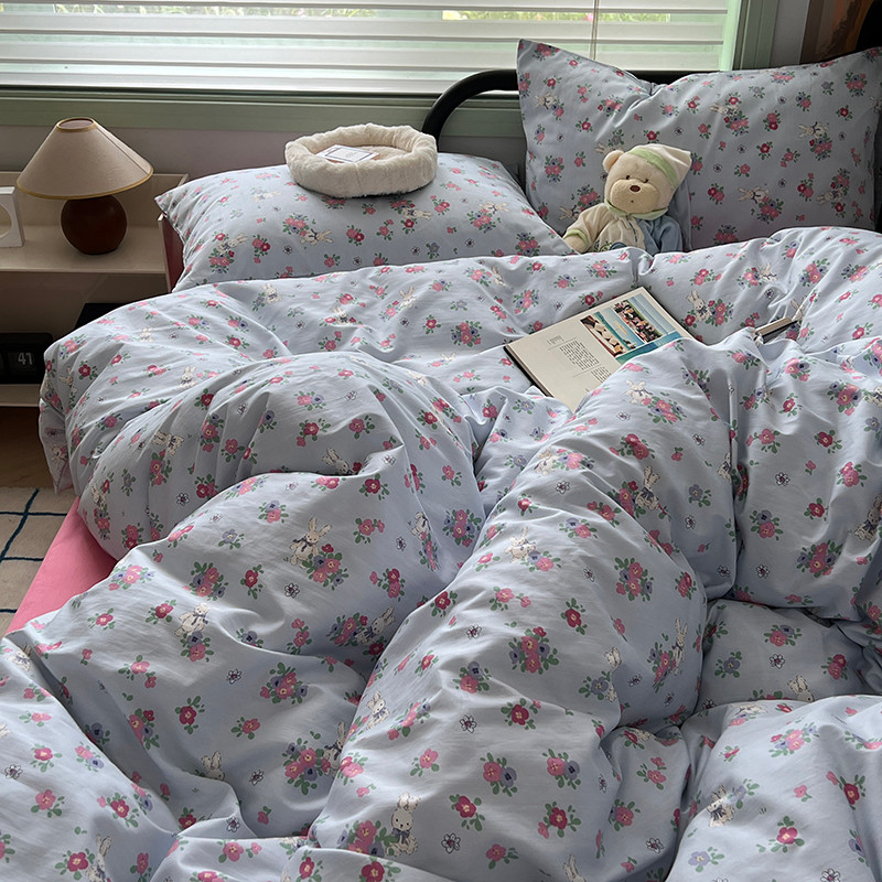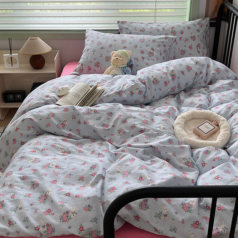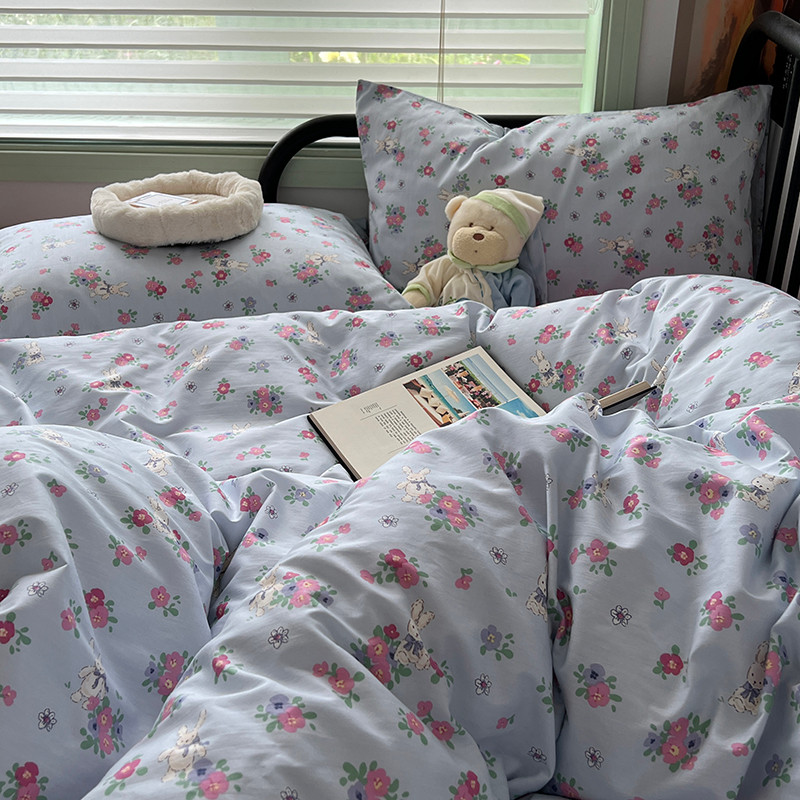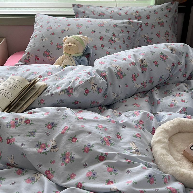 昔可 2023新款全棉卡通小清新四件套 蓝底花奶油兔