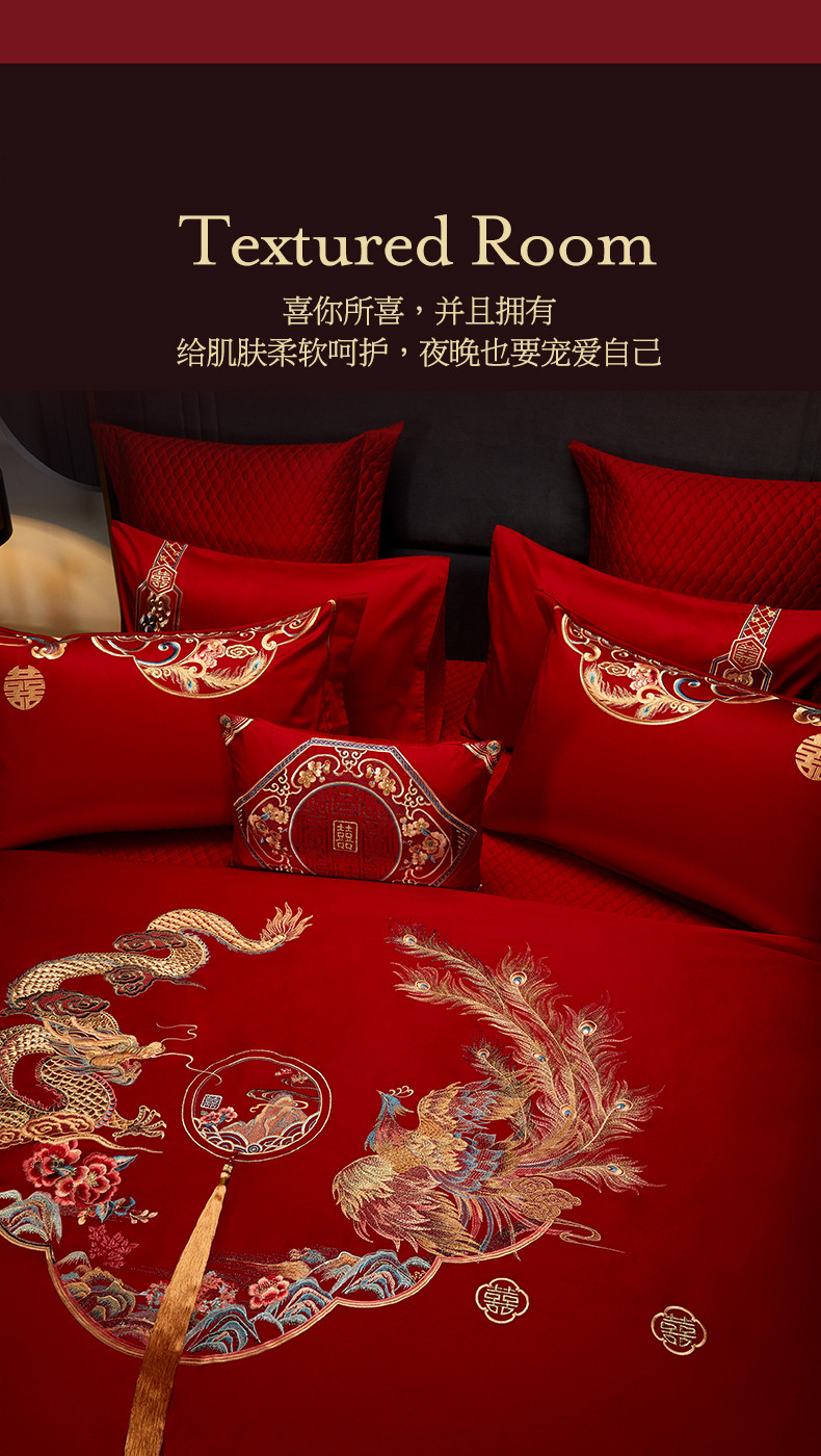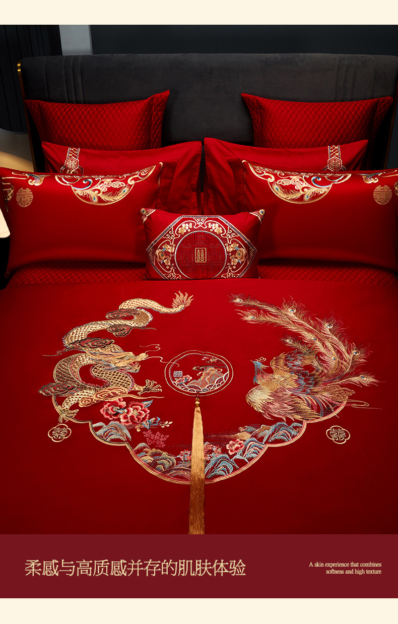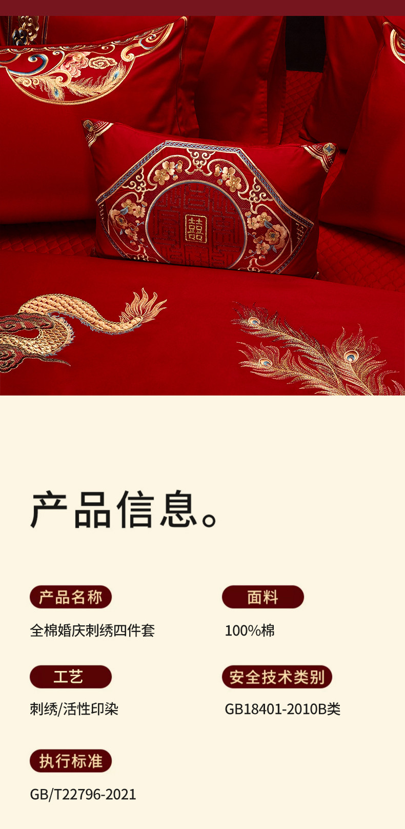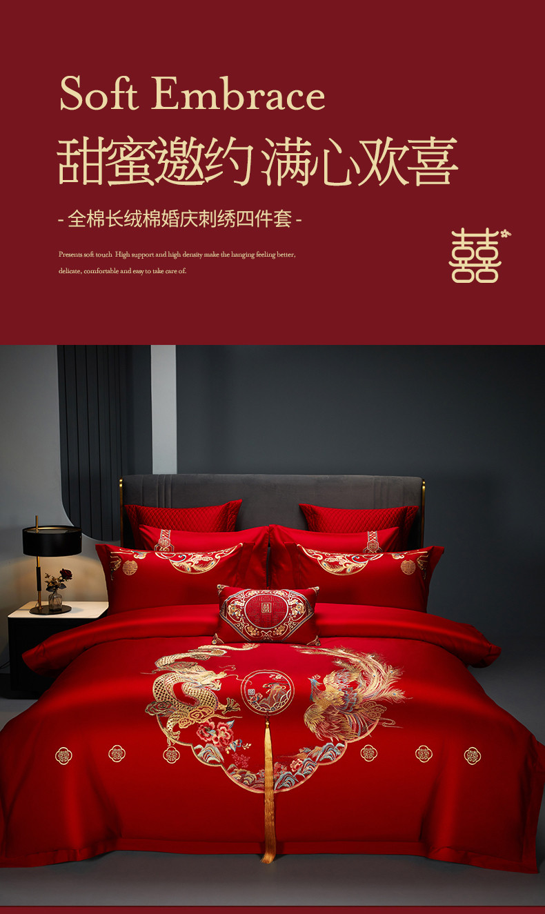 当前位置: 91家纺网 > 商品网购 > 床品套件 > 多件套 > 多件套 > 美娘阁 2023年秋冬新品长绒棉刺绣系列婚庆 四件套/多件套 龙飞凤舞