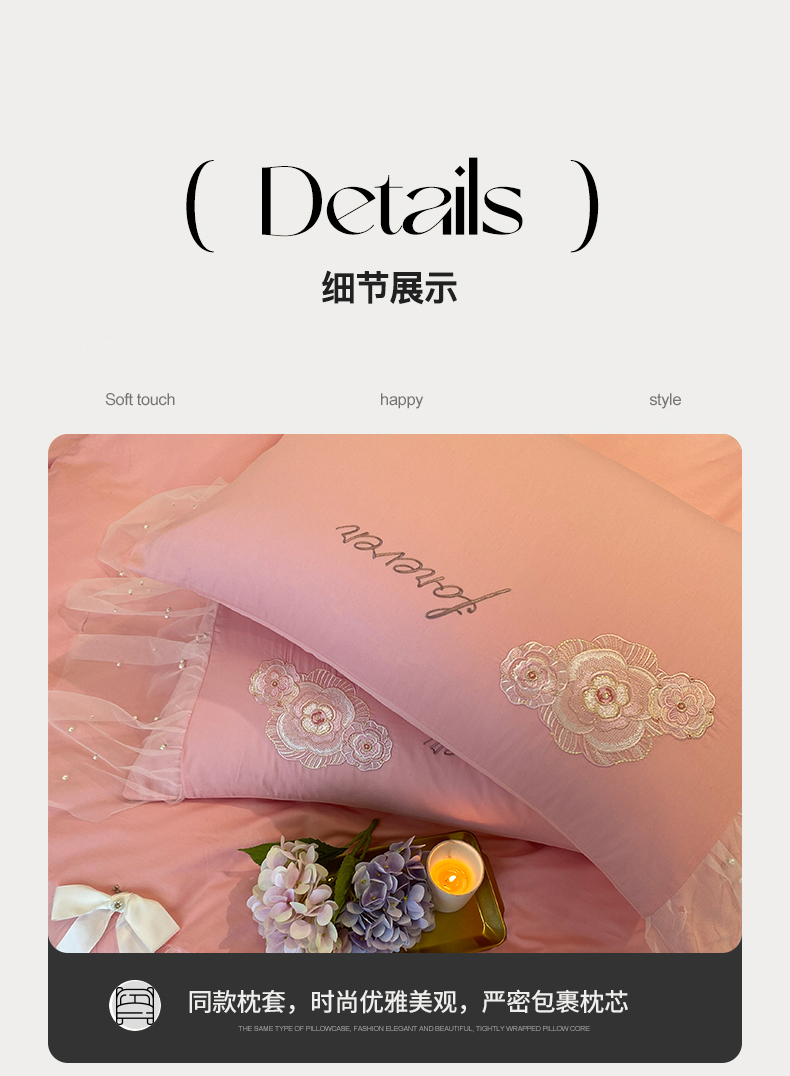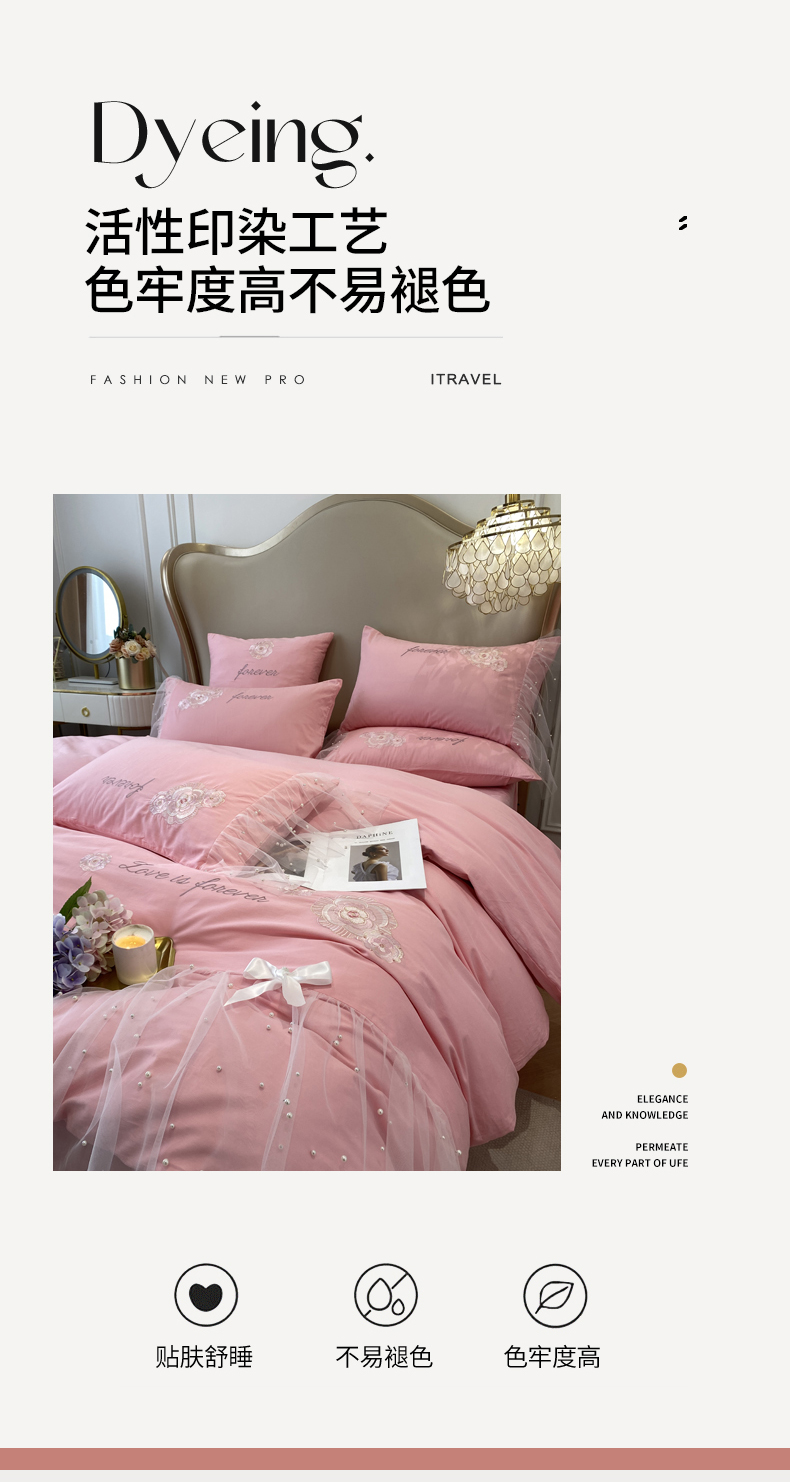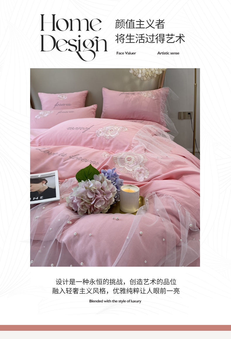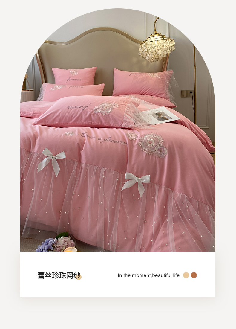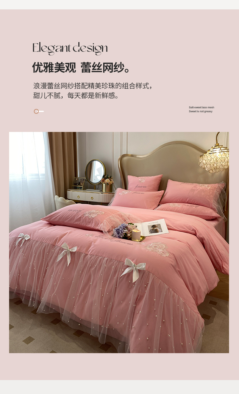 丝印良品 2023新款秋冬保暖60S全棉蕾丝刺绣丽丽贝尔系列四件套 玫瑰粉