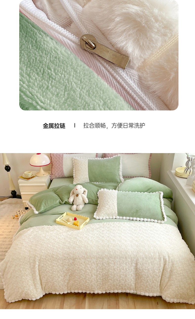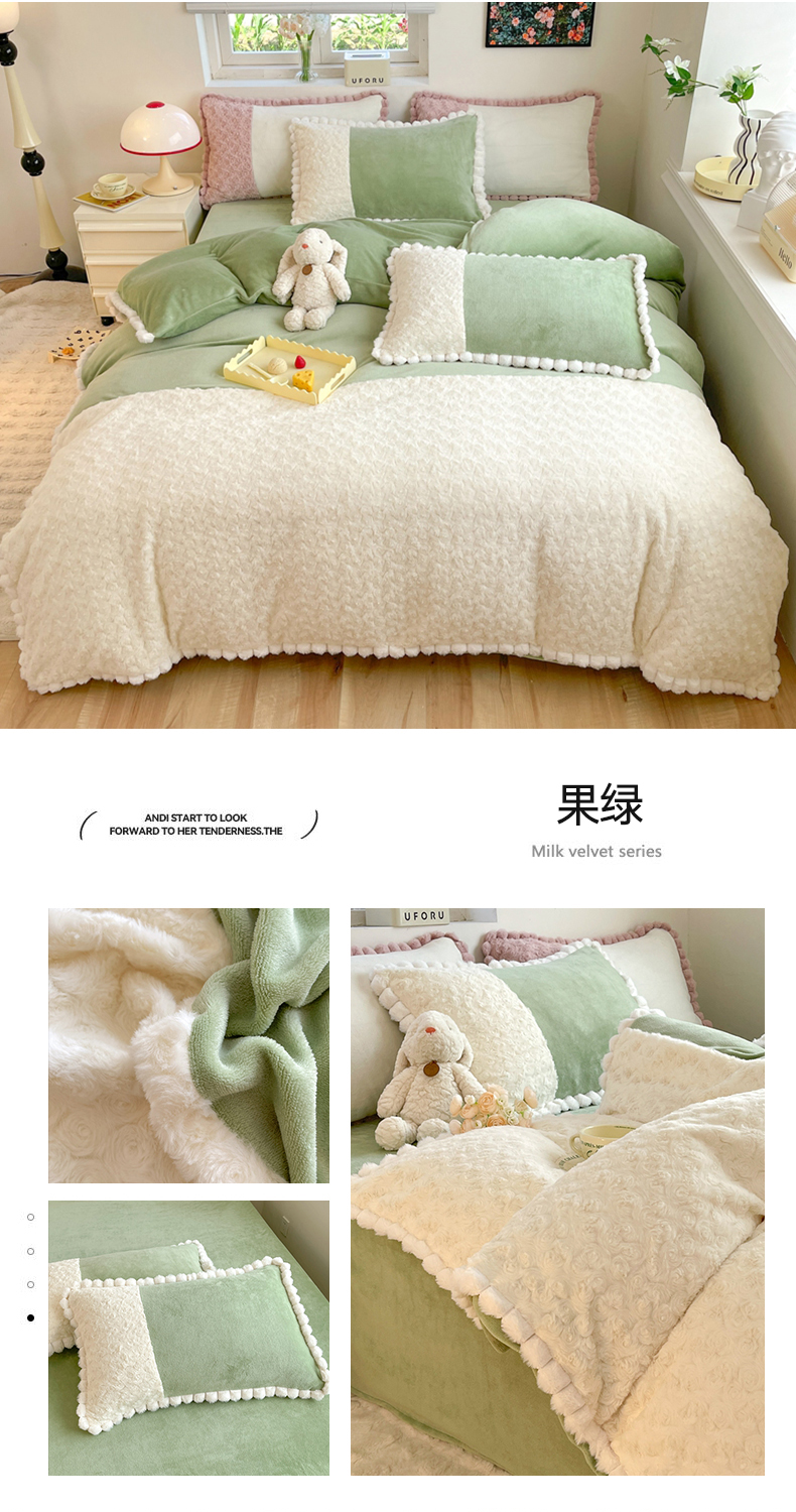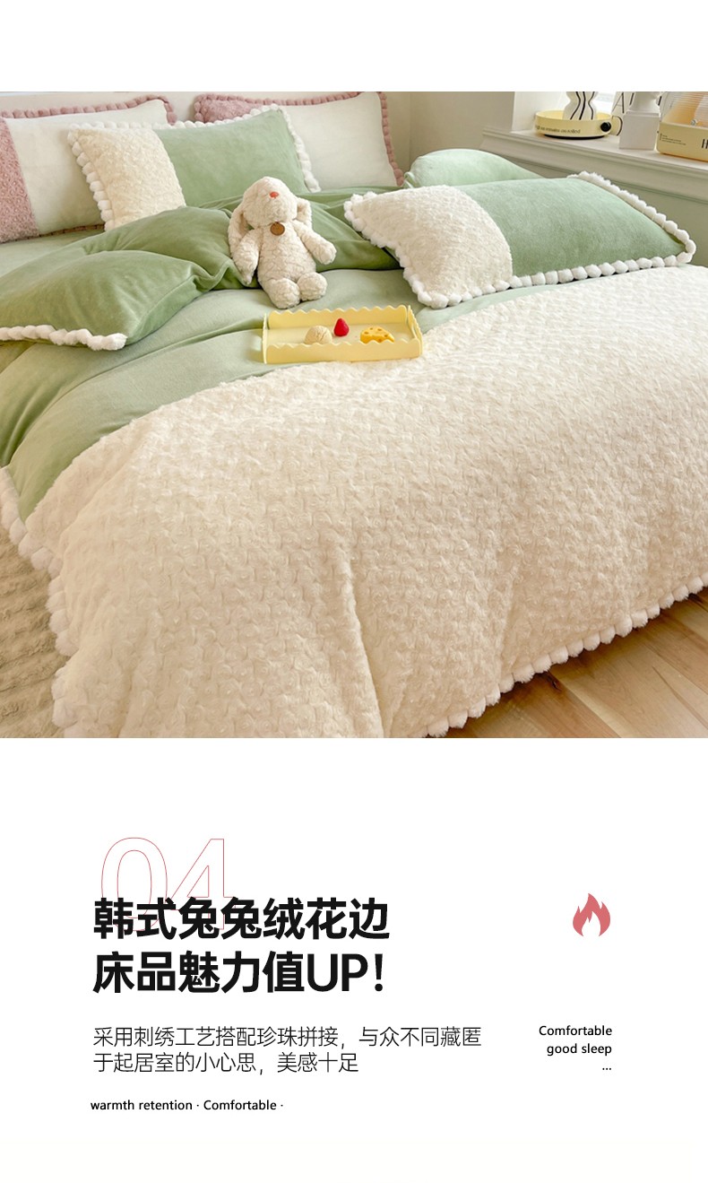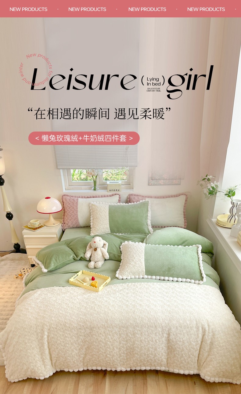 艾米家居 2023新款秋冬懒兔玫瑰绒牛奶绒四件套 果绿