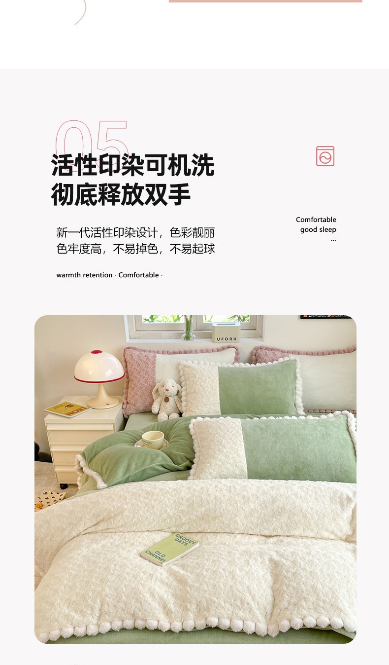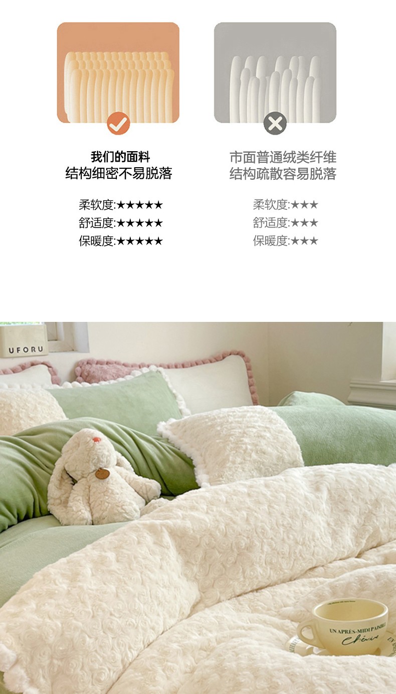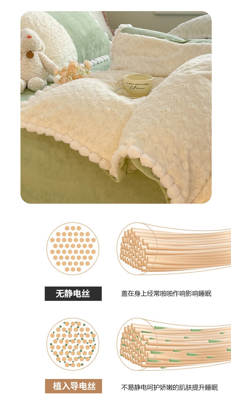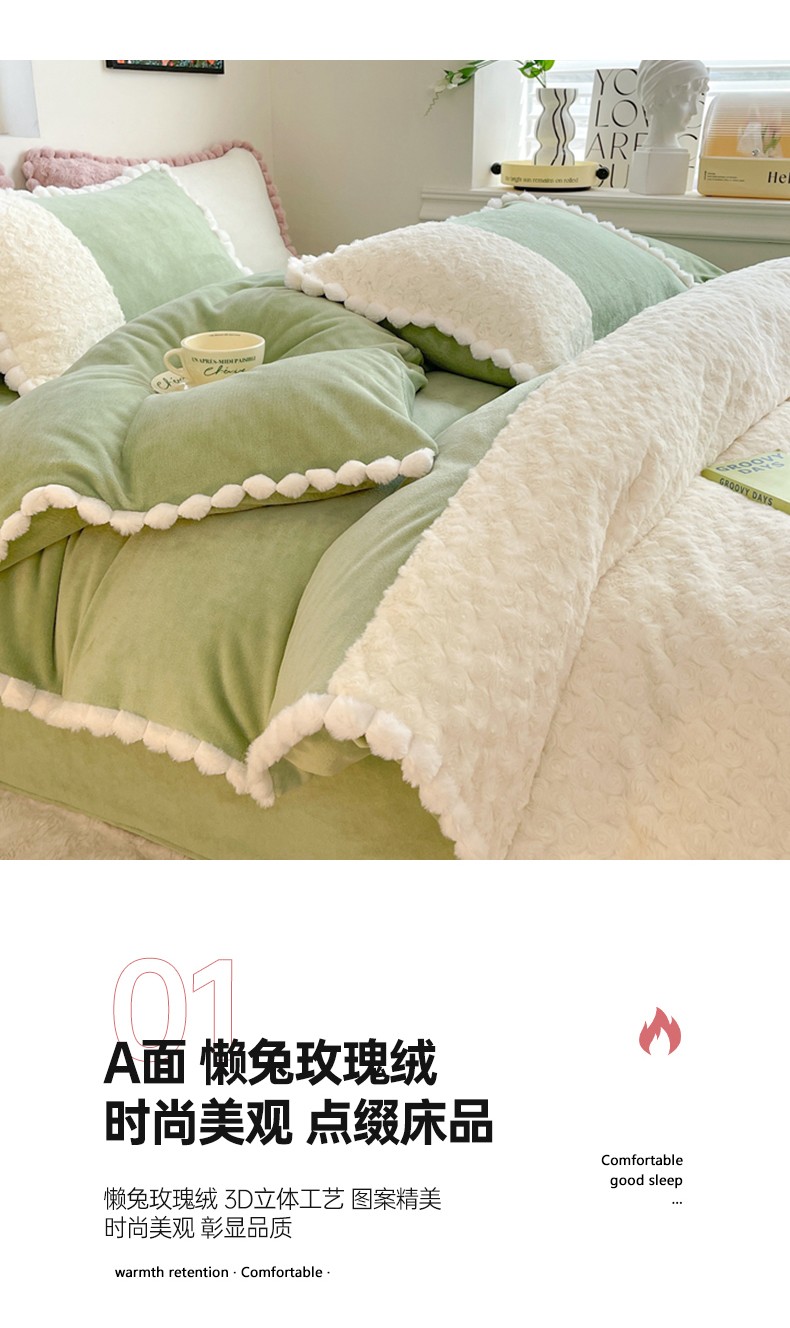 商品名称:艾米家居 2023新款秋冬懒兔玫瑰绒牛奶绒四件套 果绿