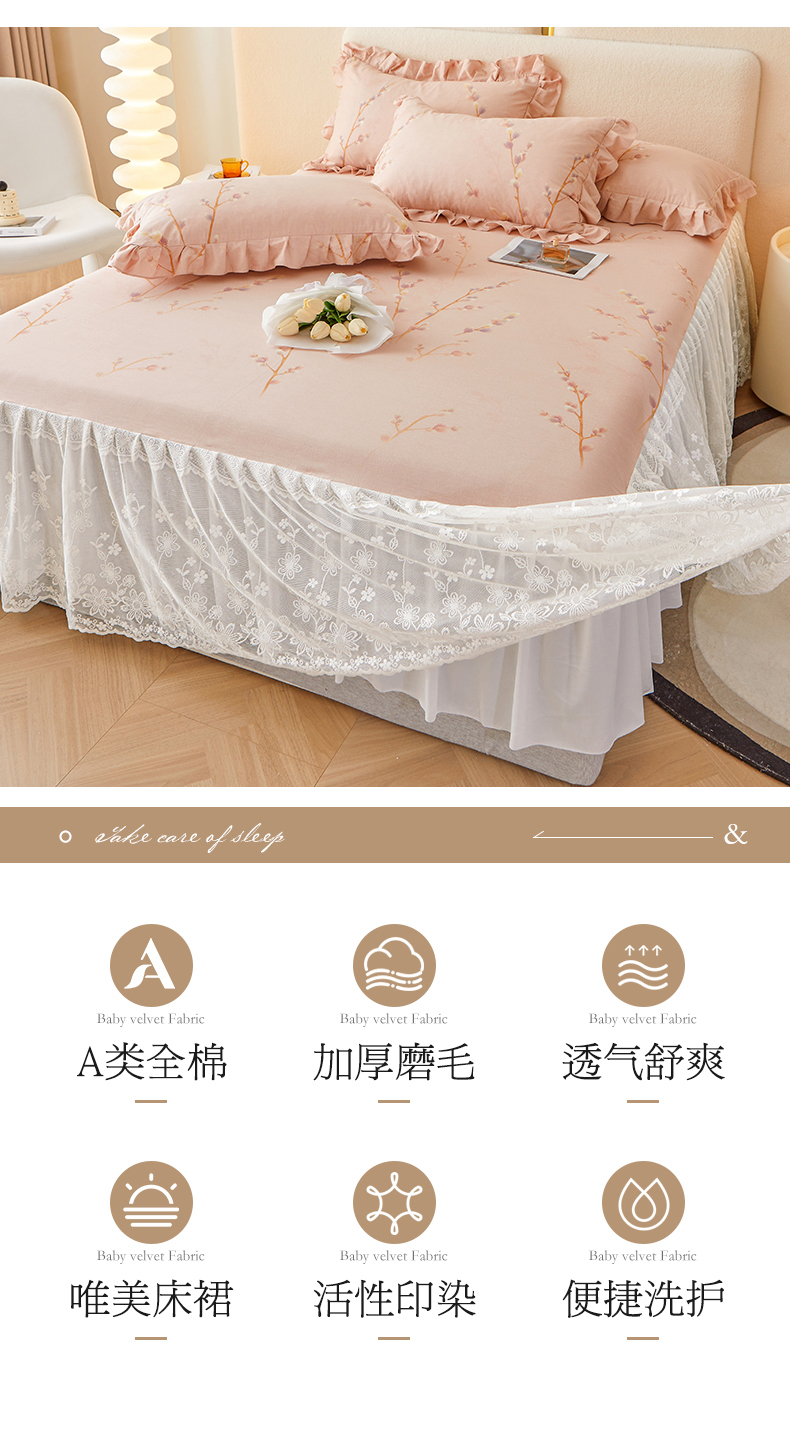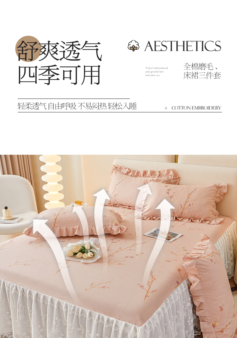 宜凡家纺 2023新款全棉加厚磨印花毛床裙三件套 梅枝