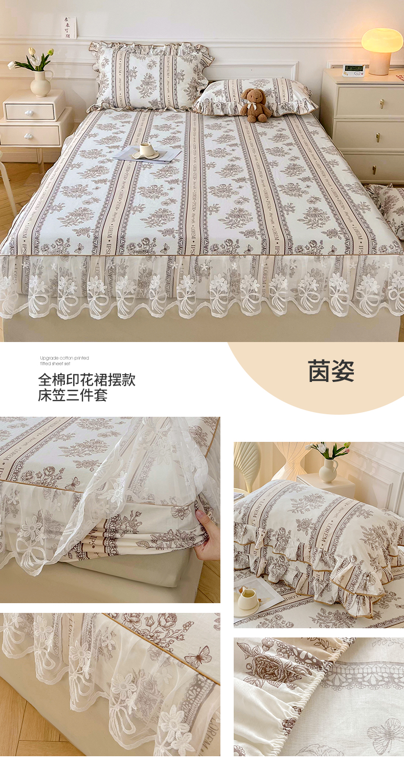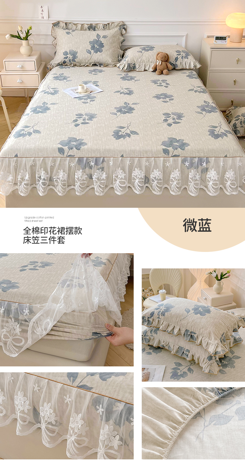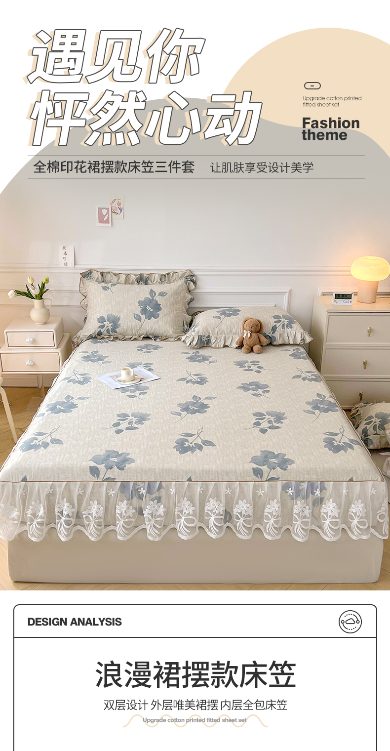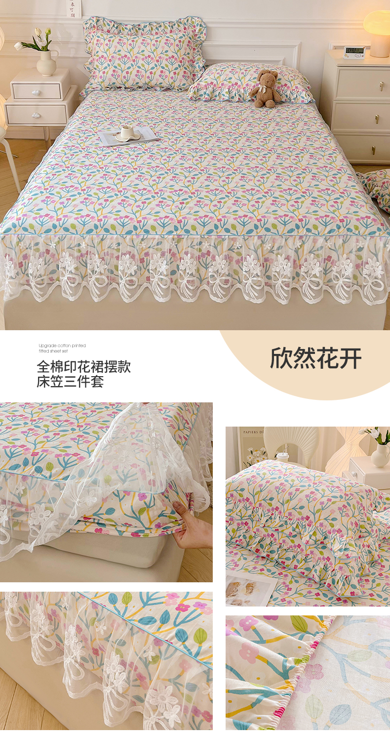 (总)宜凡家纺 2023款全棉花边裙摆款床笠三件套