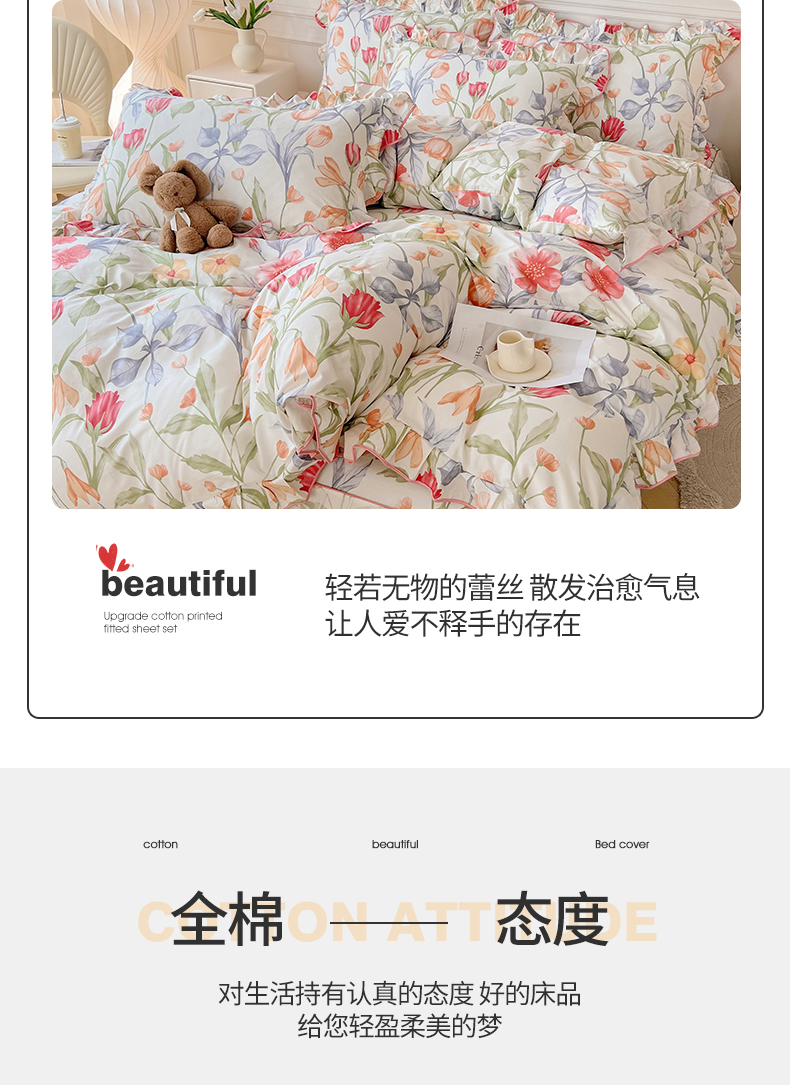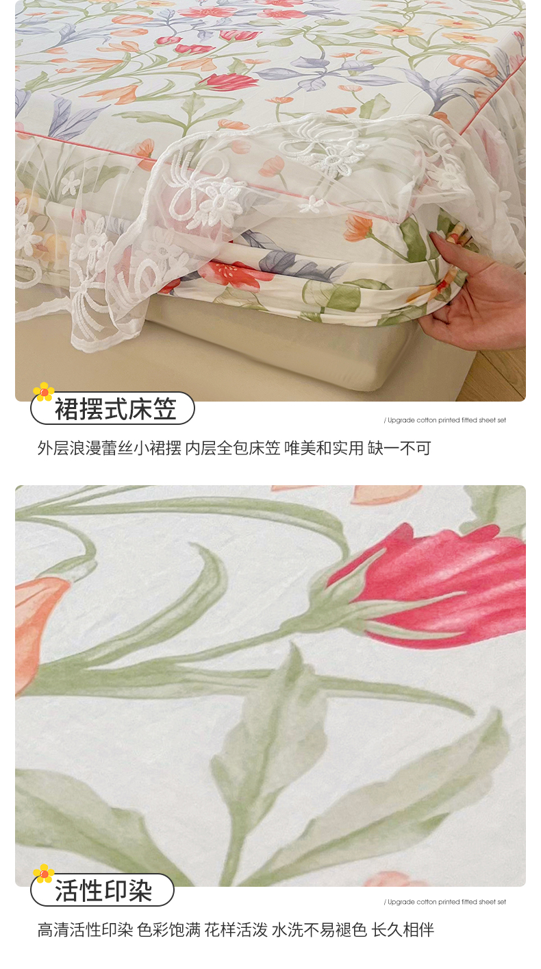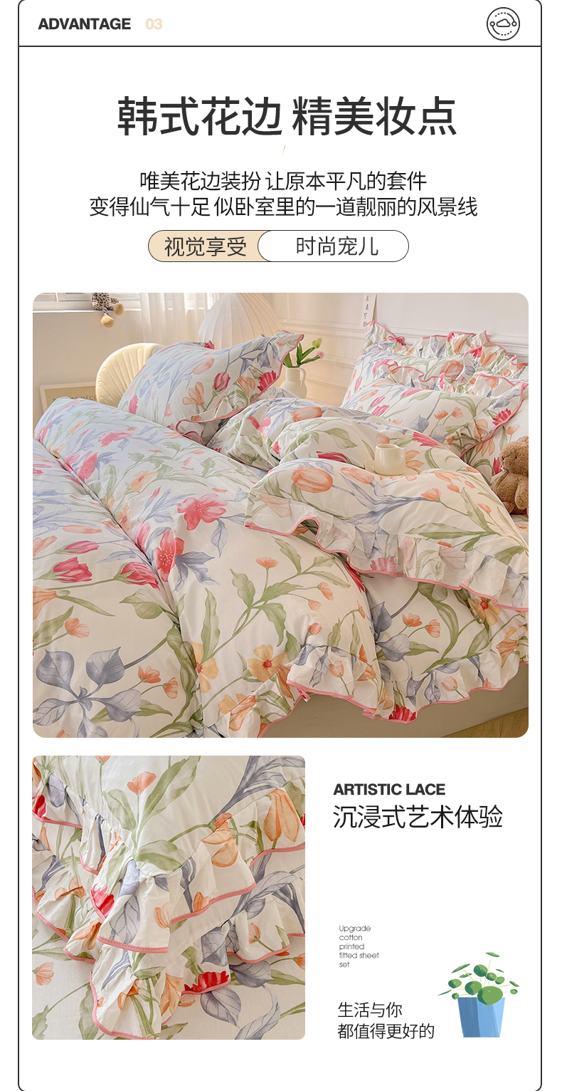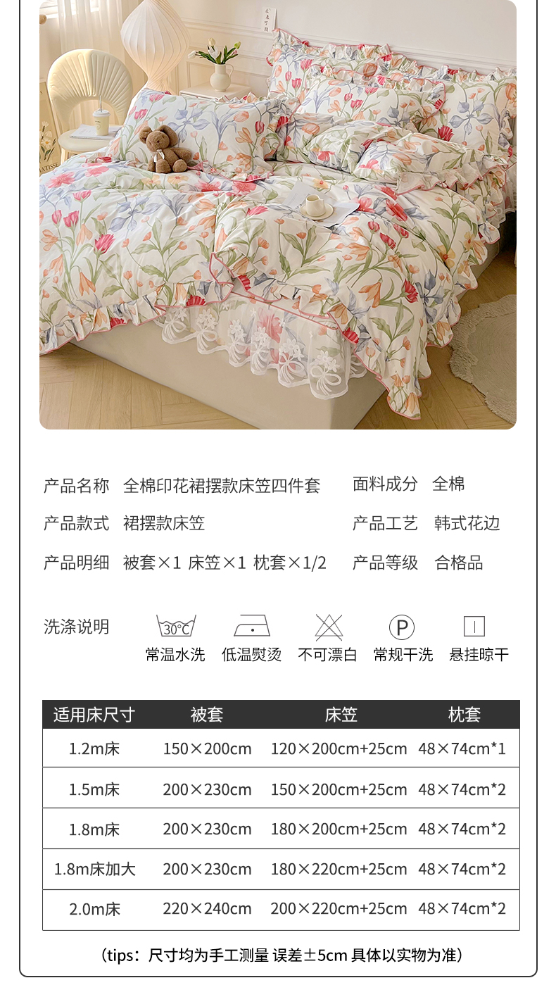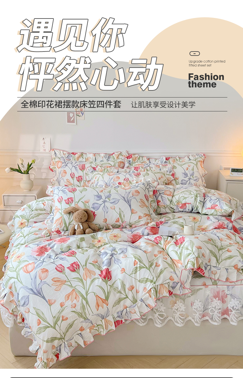 当前位置: 91家纺网 > 商品网购 > 床品套件 > 四件套 > 全棉普通四件套 > 宜凡家纺 2023款全棉花边裙摆款床笠四件套 浓情花意
