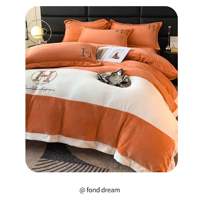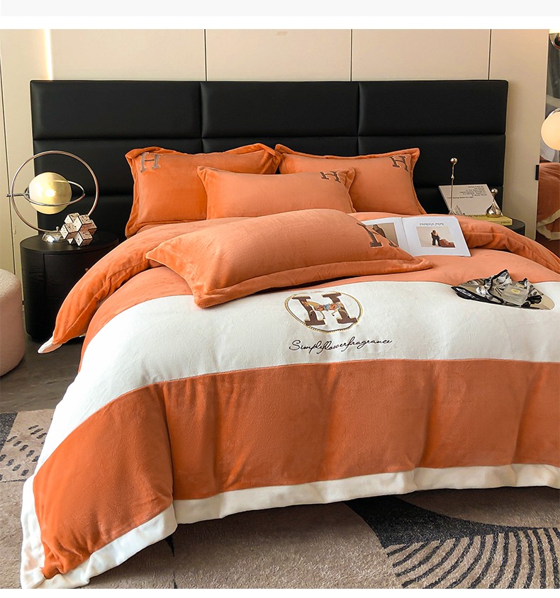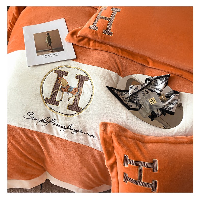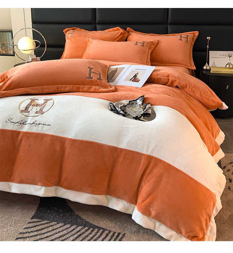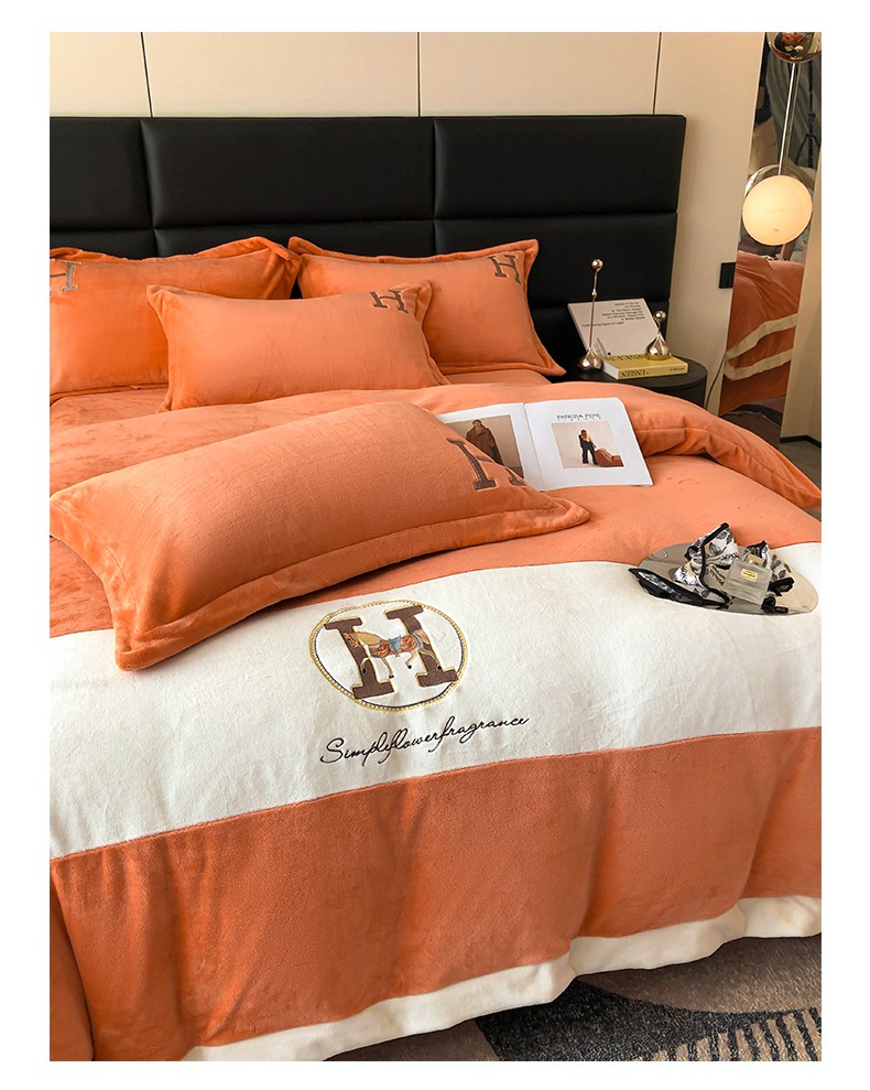 230克牛奶绒拼接刺绣四件套艾琳系列大牌刺绣四件套 暖橘