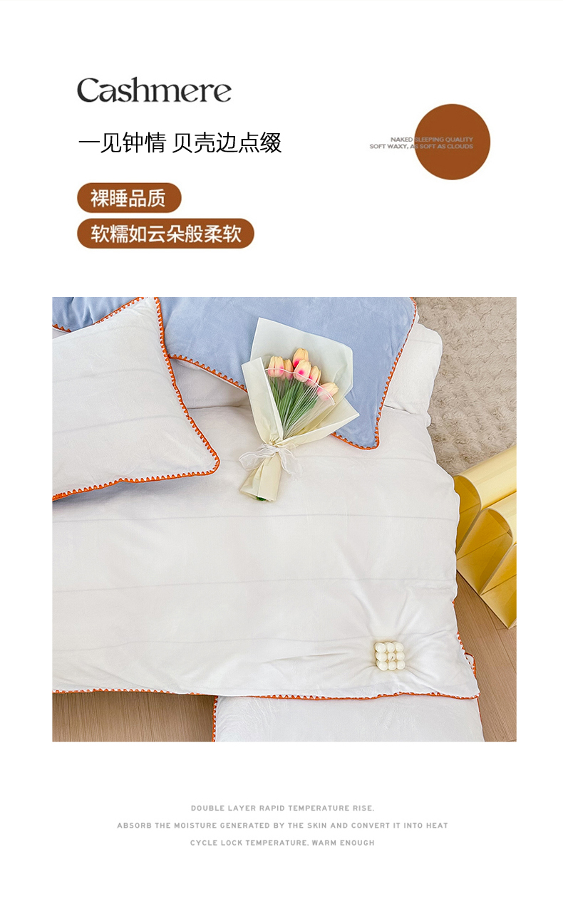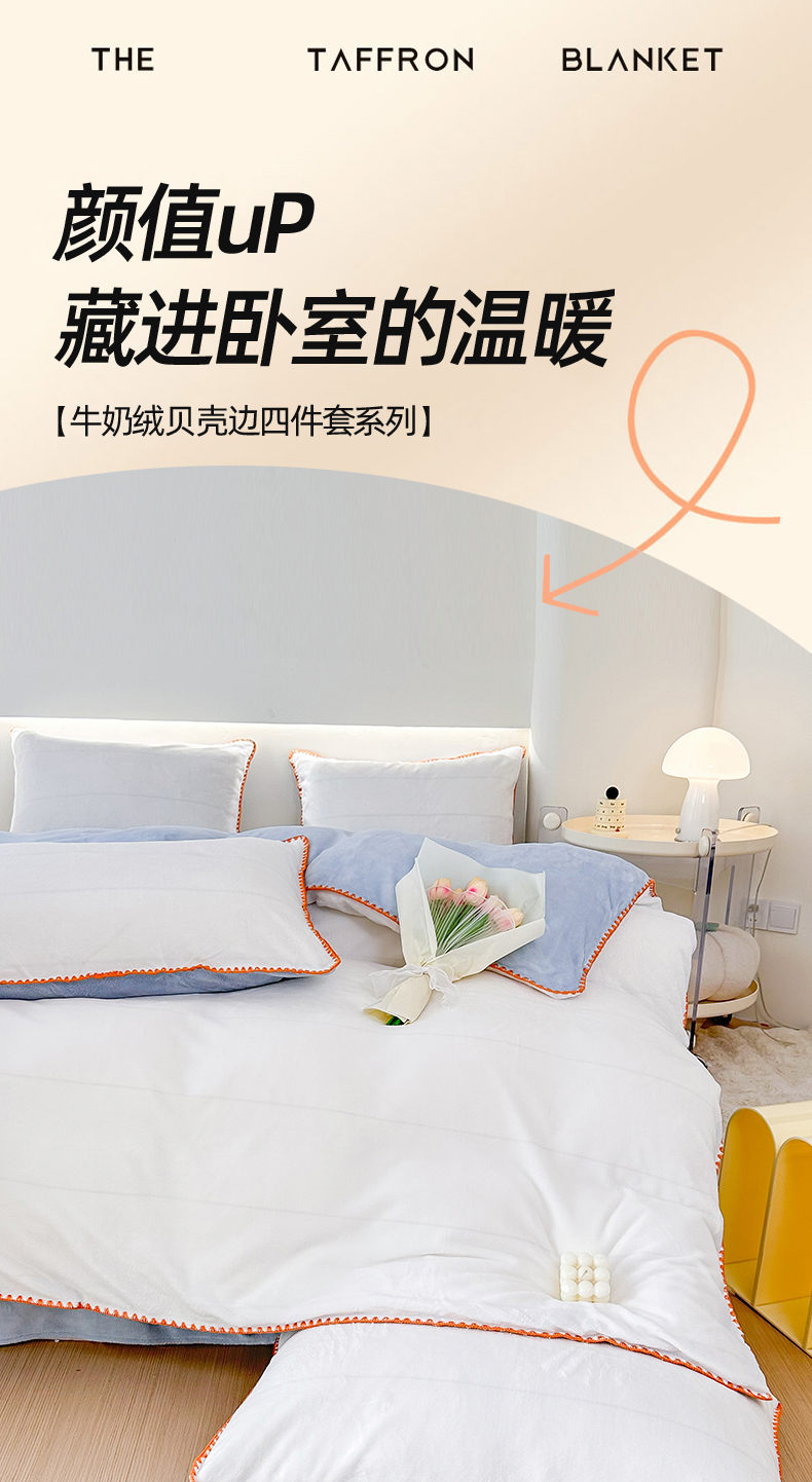 (总)迷仙巢家纺 2023新款贝壳绒四件套,白加卡其,白加天空蓝,粉玉加奶油黄,奶油黄加焦糖,奶油黄加浅紫,奶油黄加天空蓝,浅绿灰,浅紫加粉玉,天空蓝加粉玉,天空蓝加奶油黄