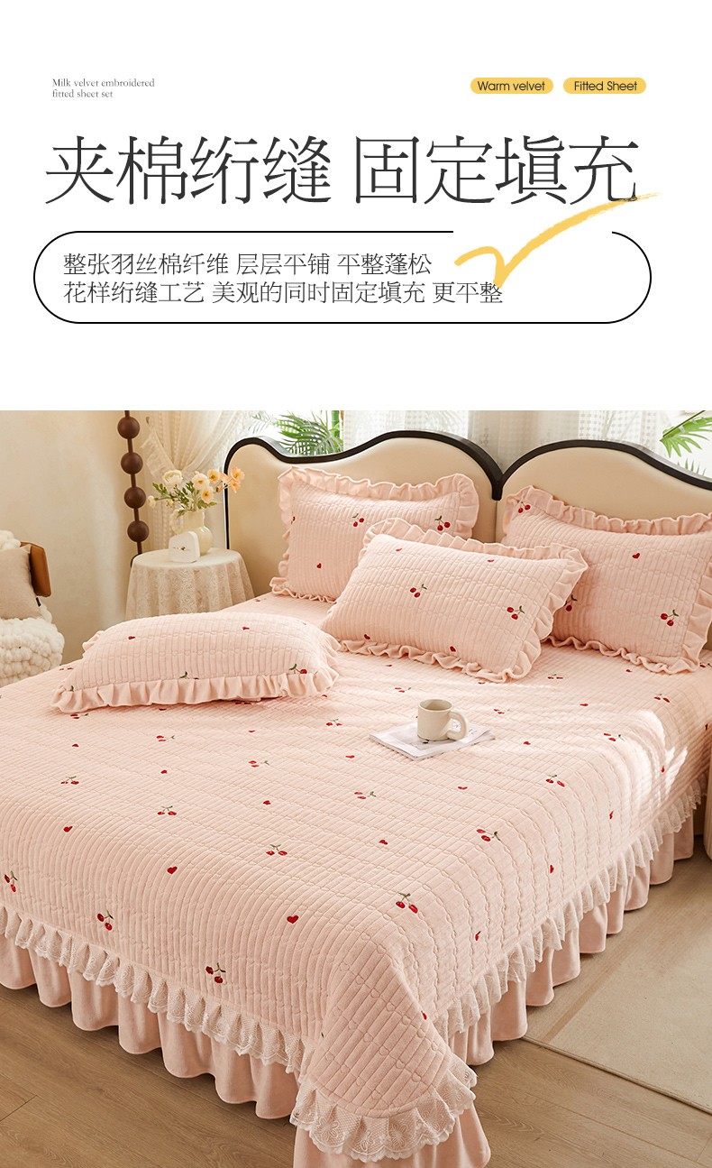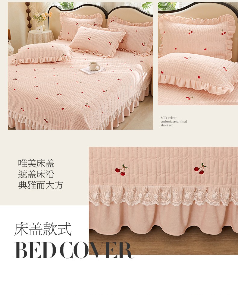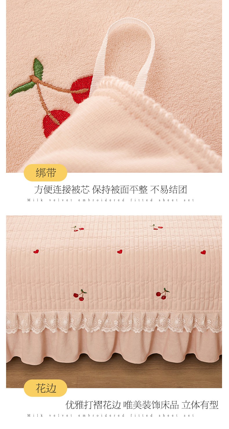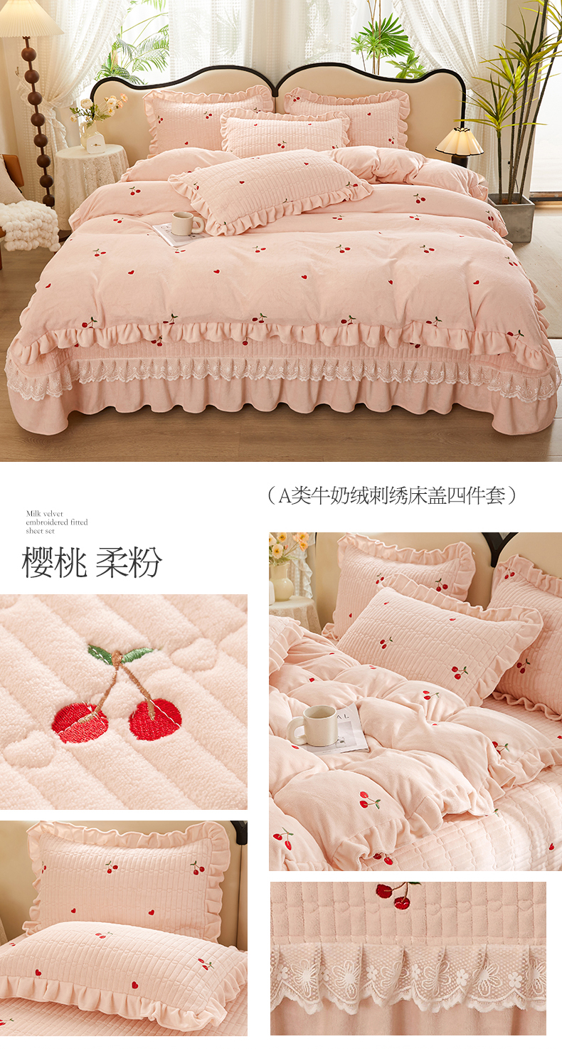商品名称:宜凡 2023新款牛奶绒夹棉绗缝绣花床盖四件套 樱桃-柔粉