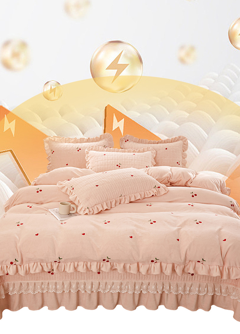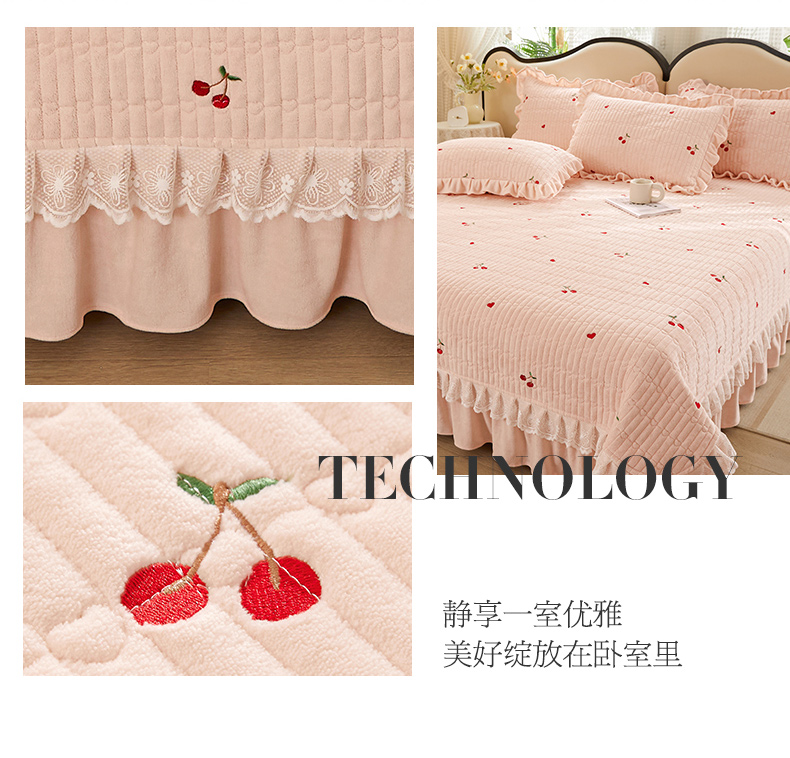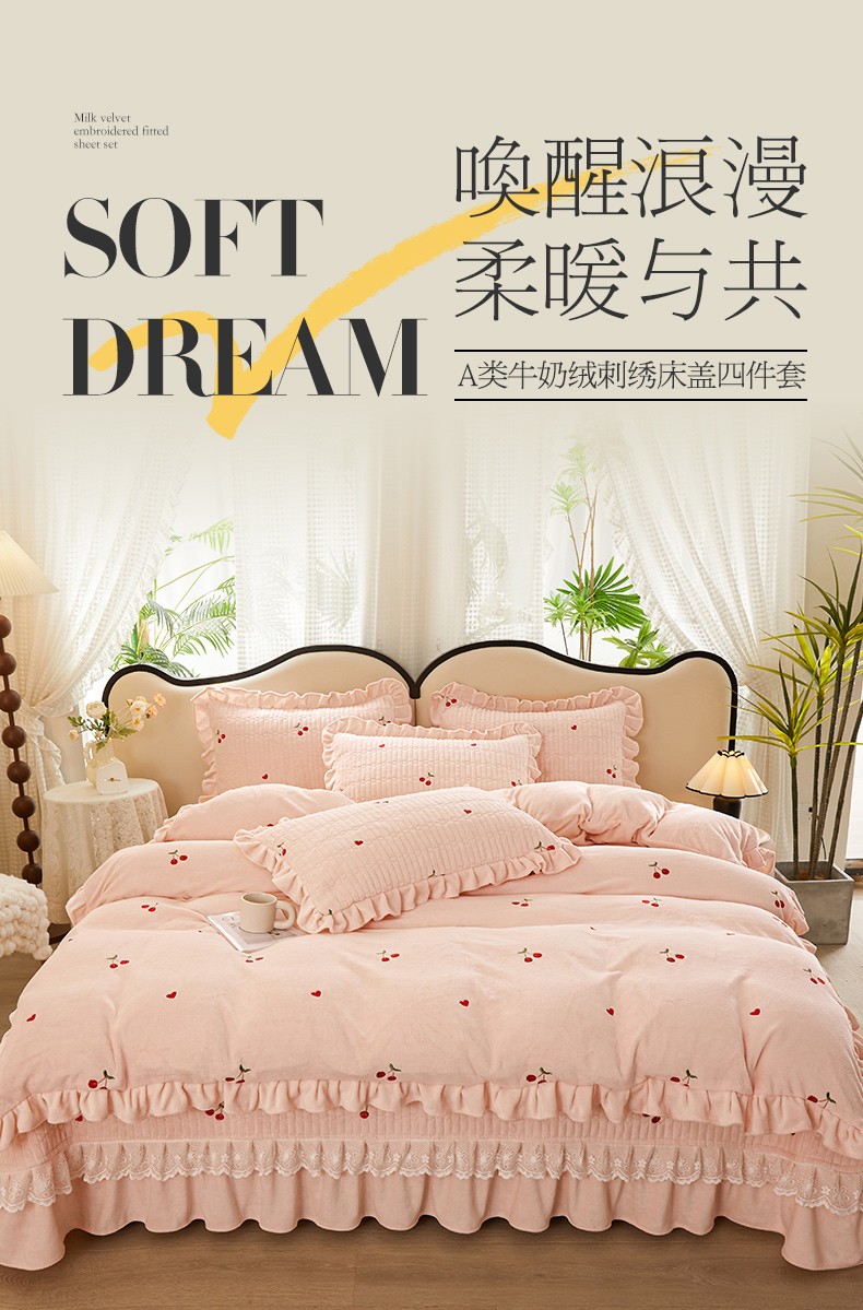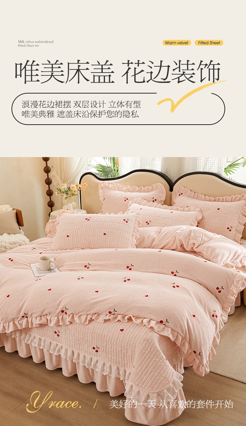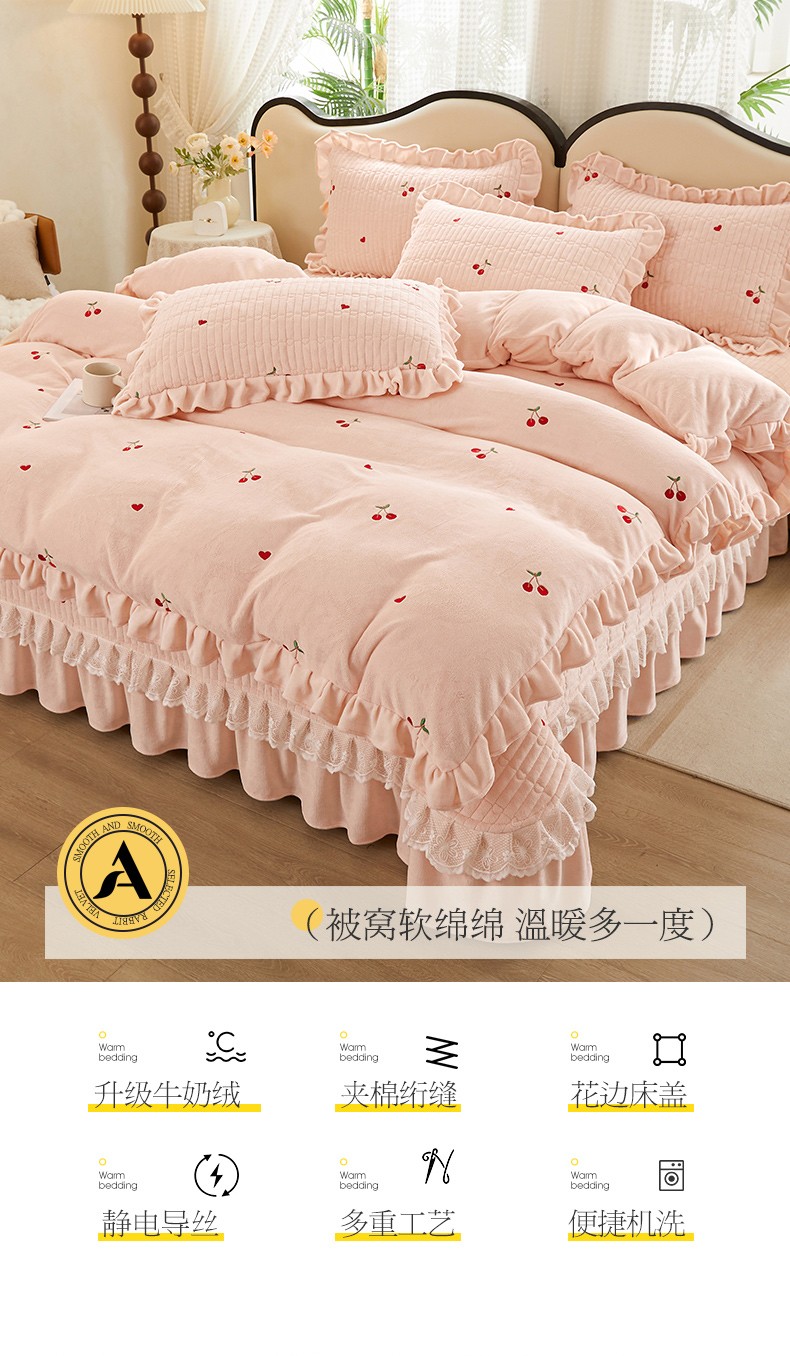 商品名称:宜凡 2023新款牛奶绒夹棉绗缝绣花床盖四件套 樱桃-柔粉