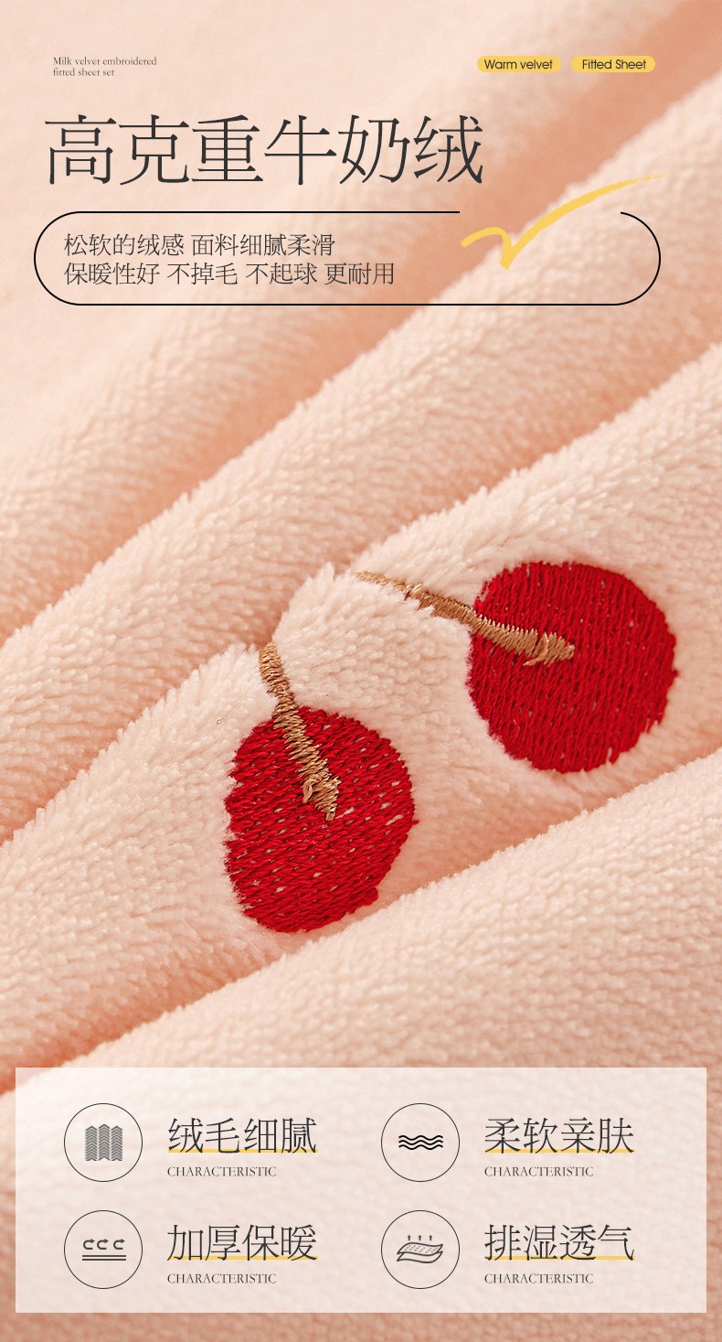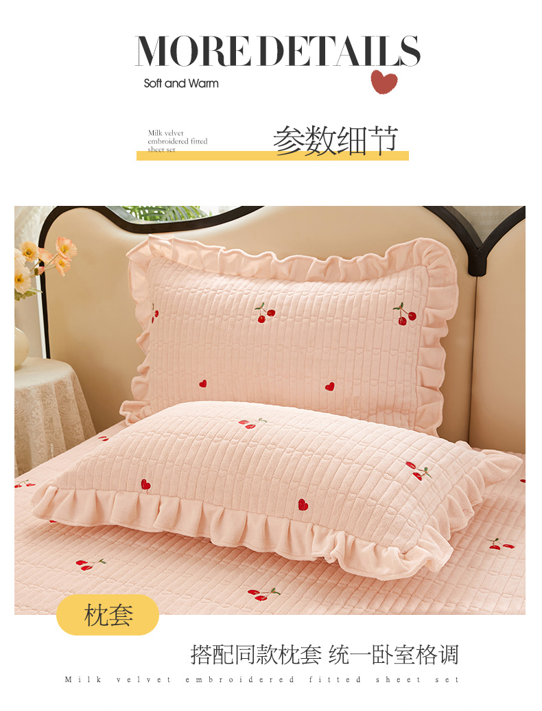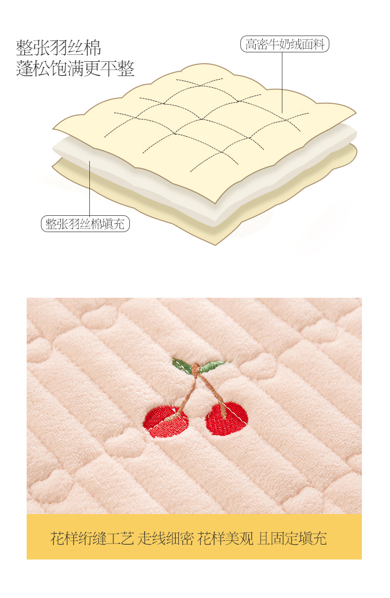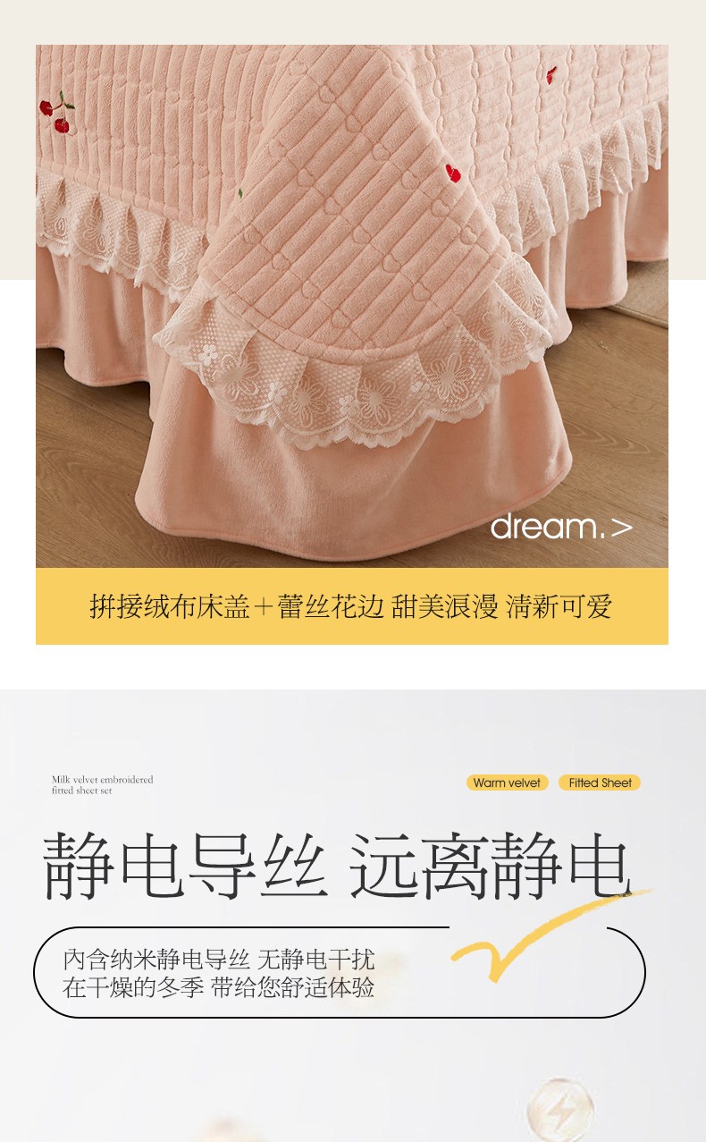 商品名称:宜凡 2023新款牛奶绒夹棉绗缝绣花床盖四件套 樱桃-柔粉