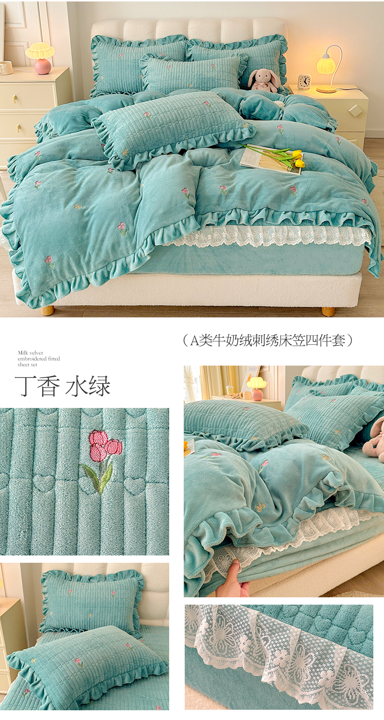 商品名称:宜凡 2023新款牛奶绒夹棉绗缝绣花床笠四件套 丁香-水绿