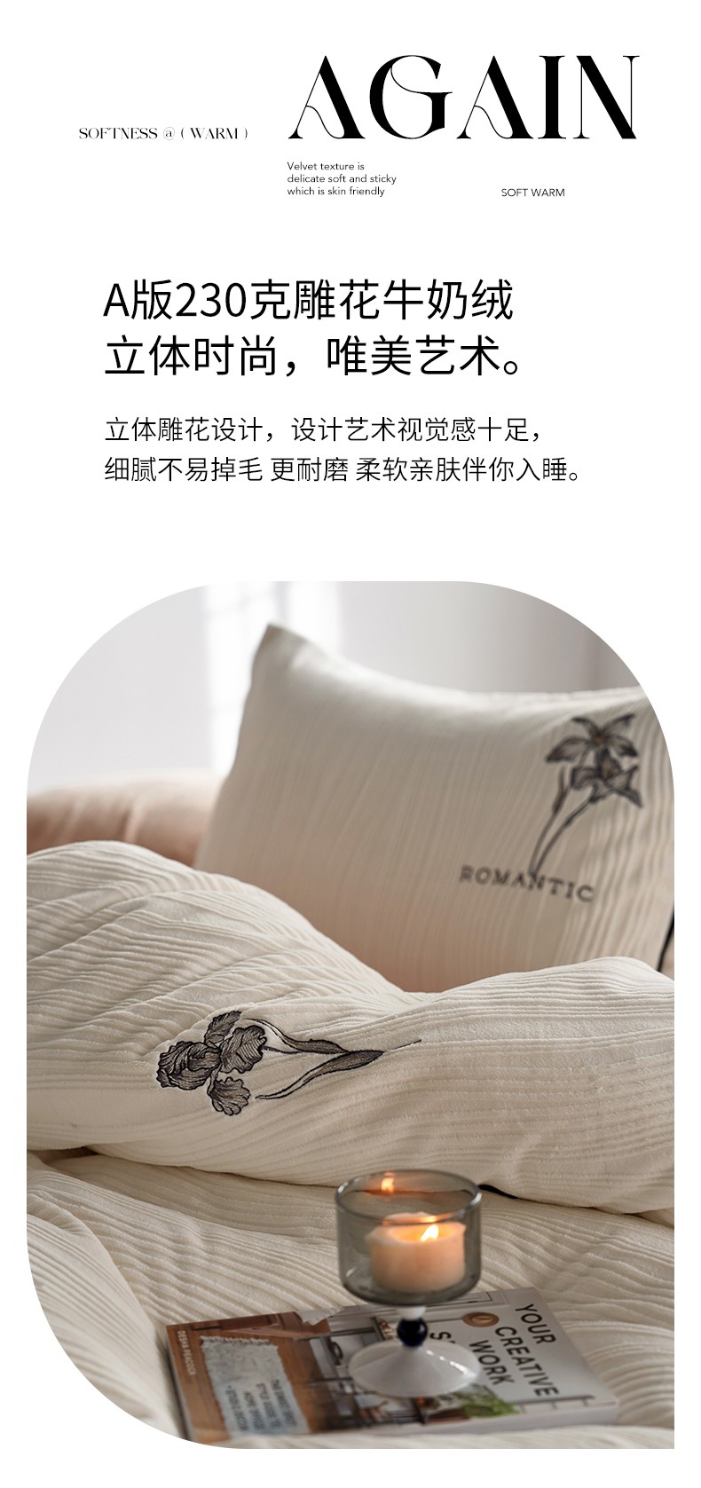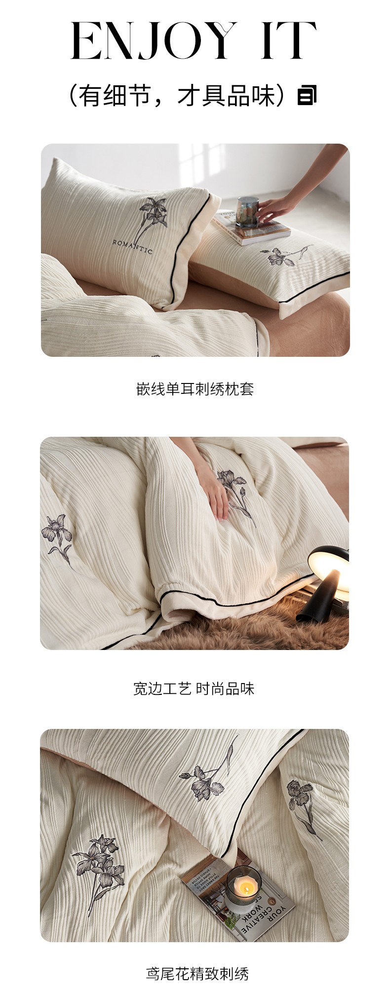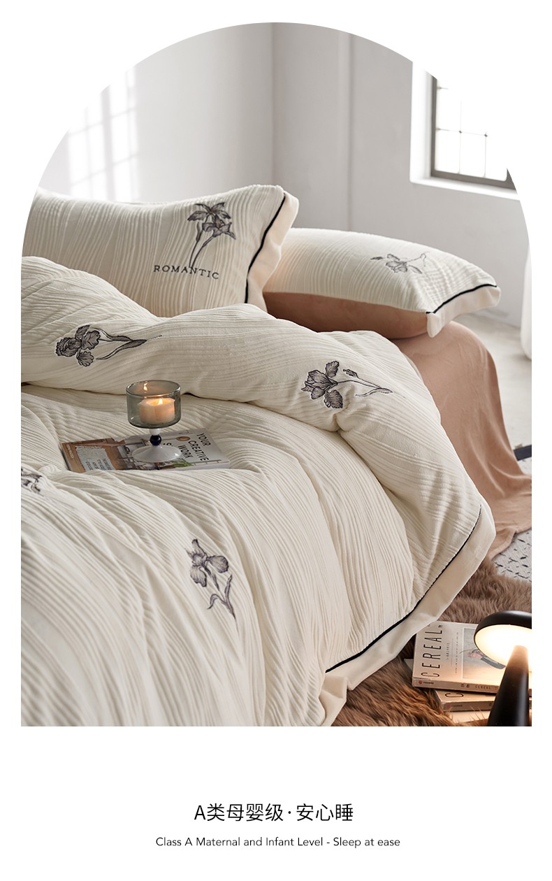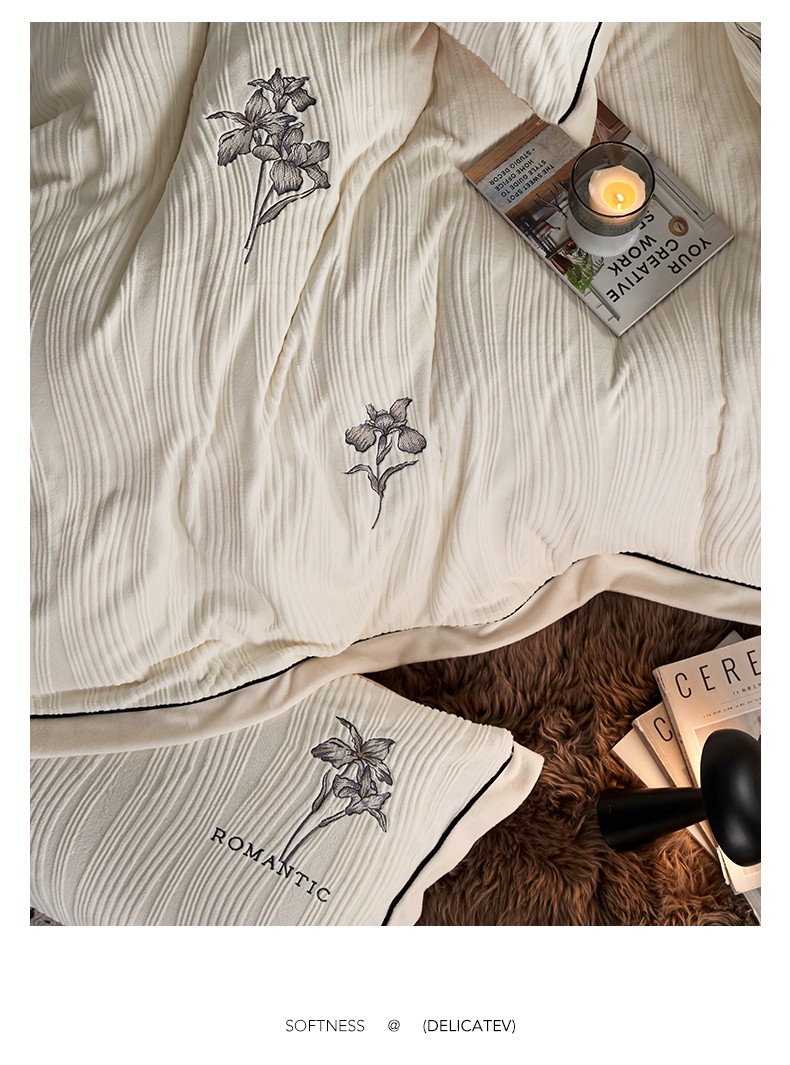 商品名称:安莱生活 2023年新品专版立体牛奶绒浮梦鸢尾系列四件套-质感棚拍 鸢尾印象-白茶
