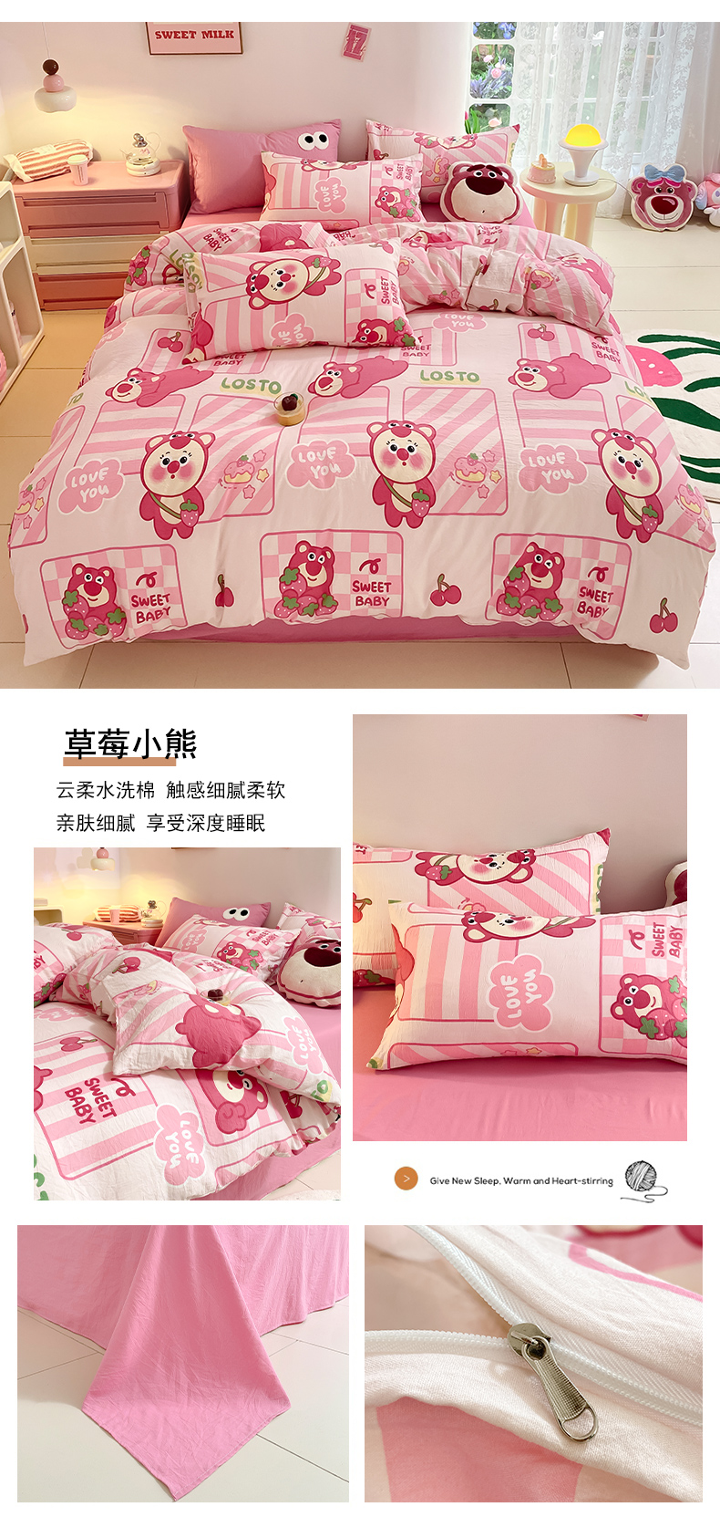 (总)葡萄家 2024新款双层纱云柔水洗棉萌趣卡通系列四件套(提供买家秀联系客服),草莓小熊,红小猫,欢乐皮皮,可爱熊猫,库洛小米,狂欢,蓝小猫,你好小狗,小羊咩咩,樱桃小猫