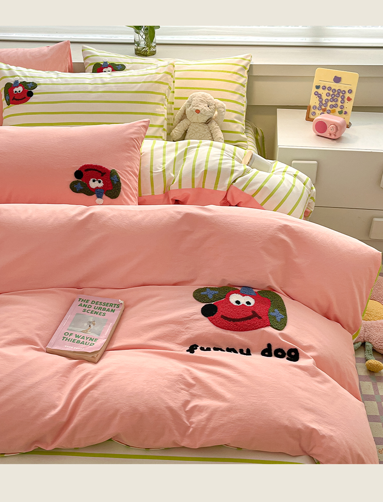 雅居纺家纺 2024新款全棉水洗棉绣花四件套 趣味狗