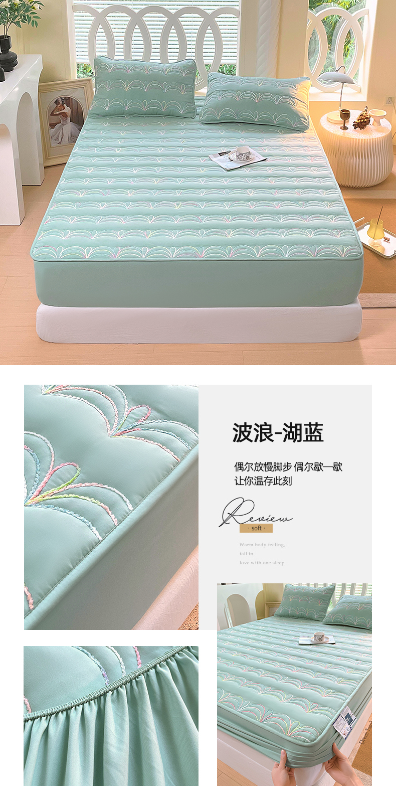 • 91家纺网 家纺一手货源 找家纺 尊康家纺(原磊科) 2024新款奶昔棉抗菌夹棉床笠-波浪 波浪-水绿