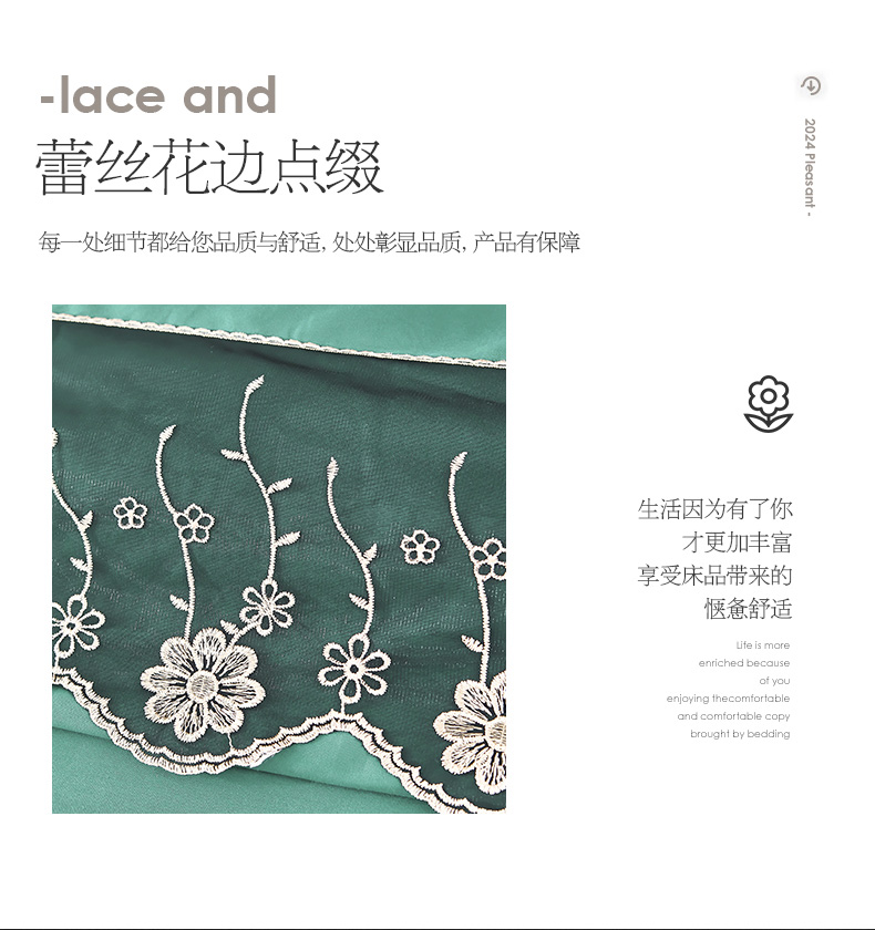 商品名称:莉莉安 2025新款亲肤磨毛蕾丝刺绣四件套-蒂欧系列 蒂欧-雅致绿
