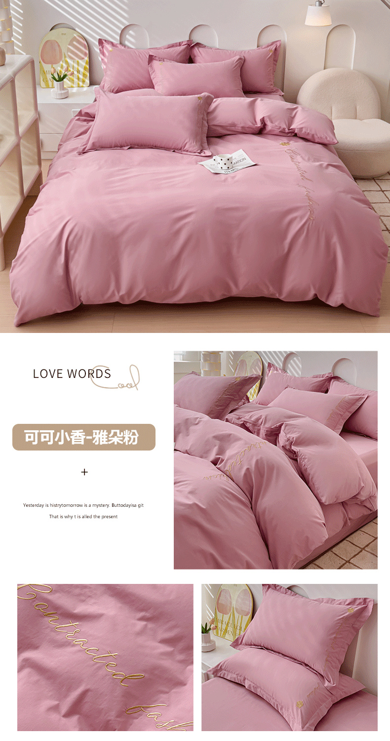 U品汇 A类全棉色织水洗棉刺绣花四件套纯棉100%床单被套 可可小香-雅朵粉