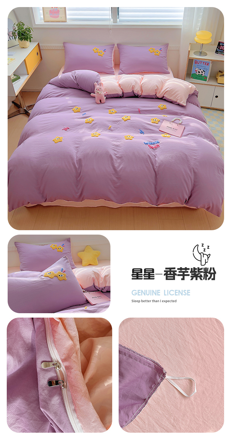 当前位置: 91家纺网 > 商品网购 > 床品套件 > 四件套 > 水洗棉四件套 > 山茶家纺 2024新款高克重水洗棉四件套 星星-香芋紫粉