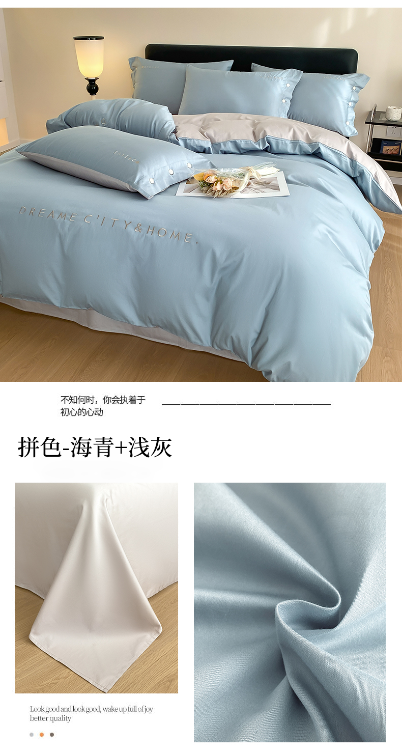 当前位置: 91家纺网 > 商品网购 > 床品套件 > 四件套 > 全棉普通四件套 > 慕色家纺 2024新款全棉刺绣拼色系列四件套 拼色-海青+浅灰