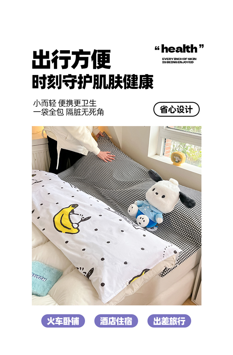 金爱家 2024新款三丽鸥正版授权纯棉旅行隔脏睡袋火车出行睡袋系列(送同款收纳袋) 纯棉睡袋-香蕉帕恰狗