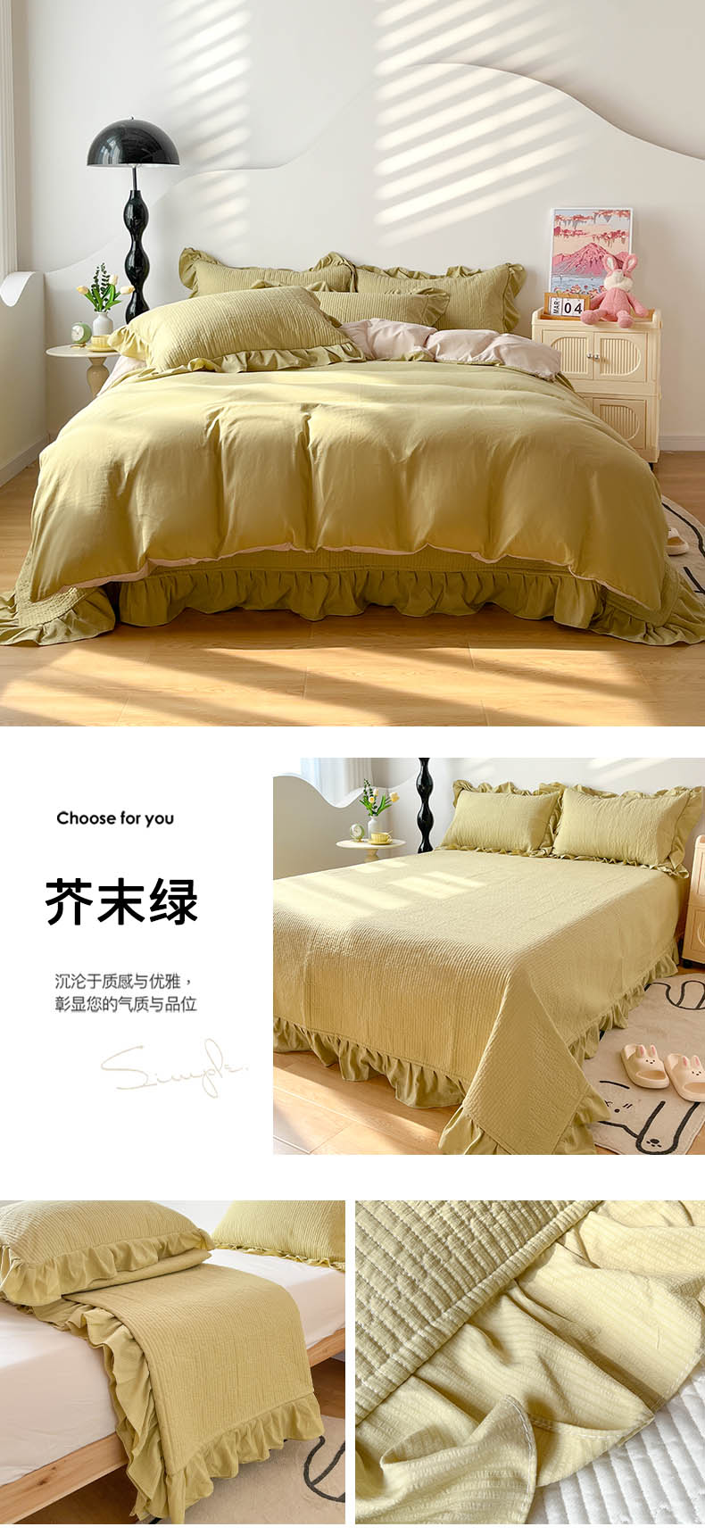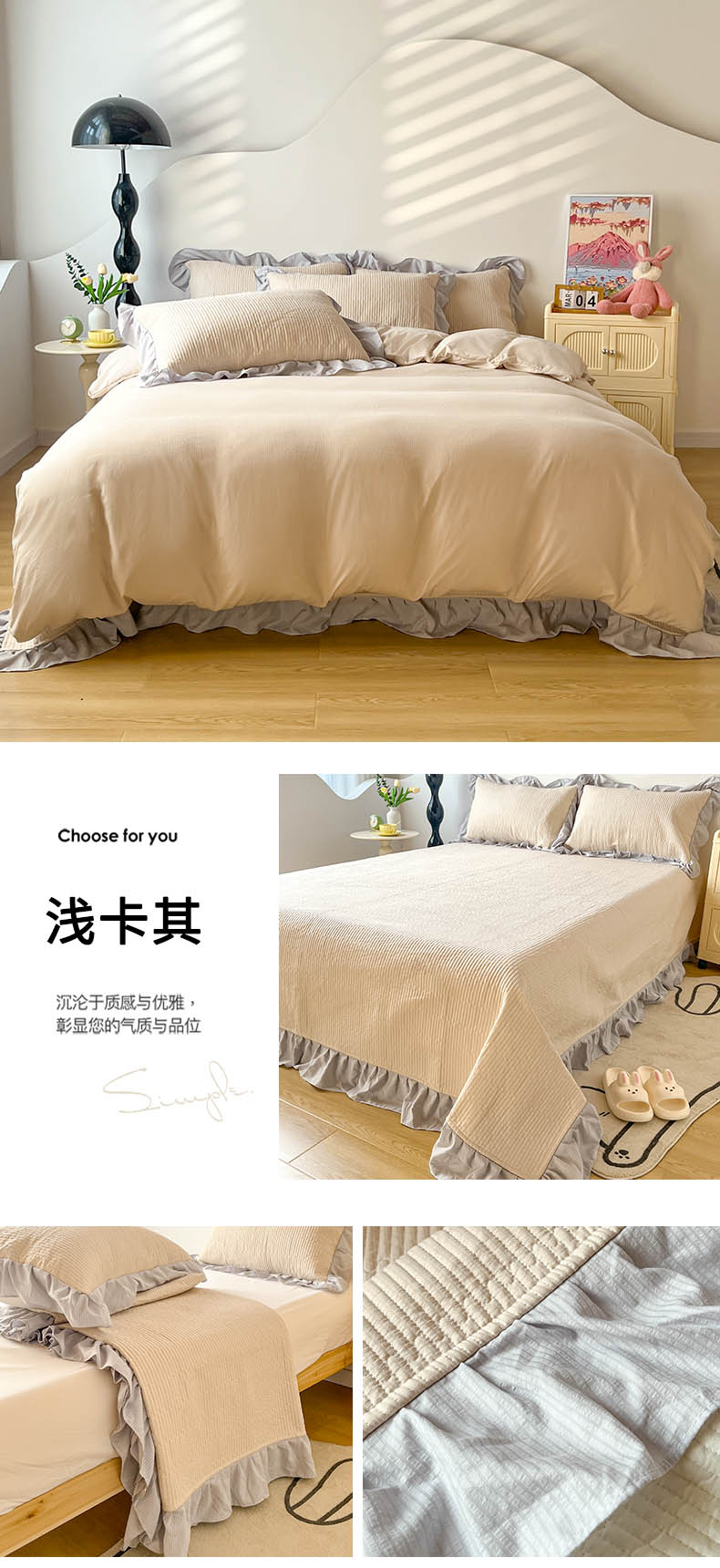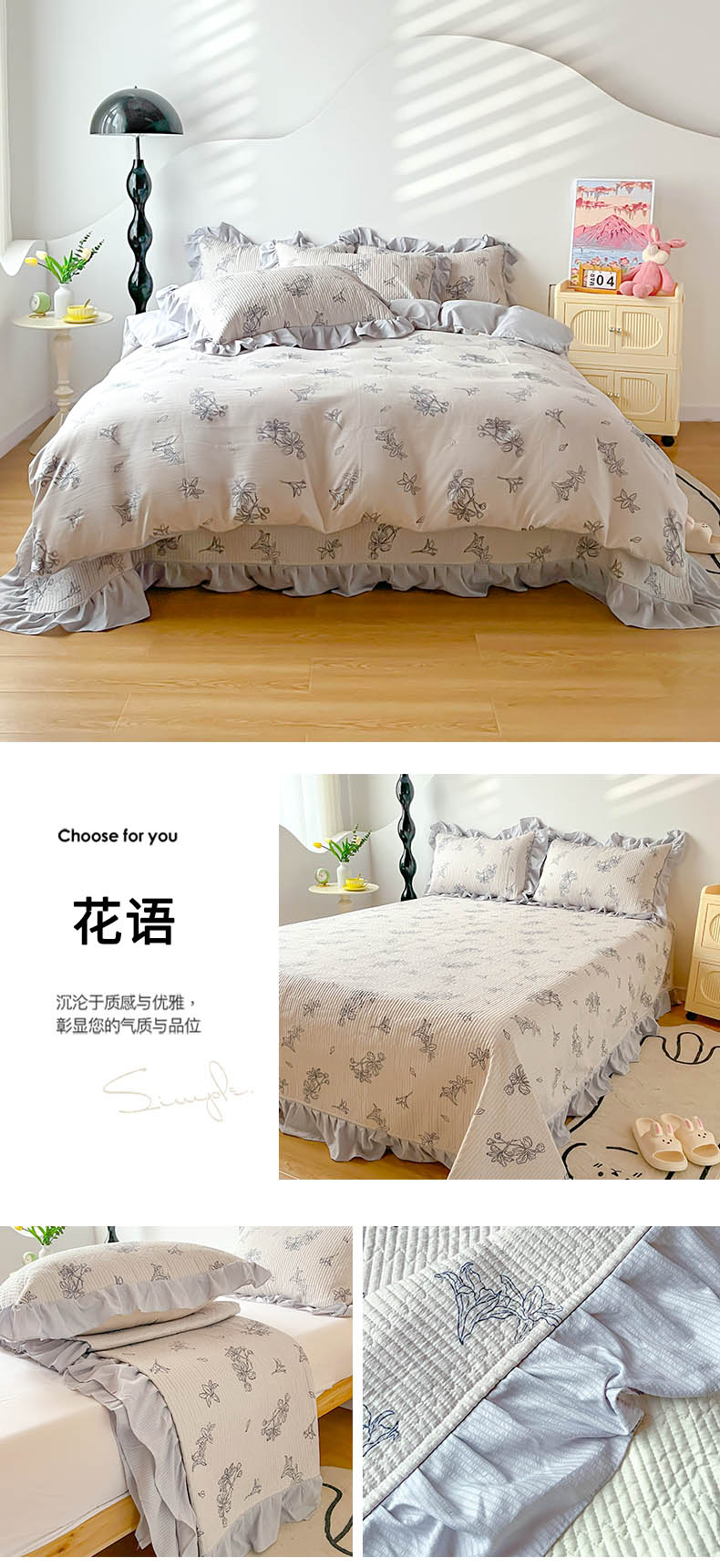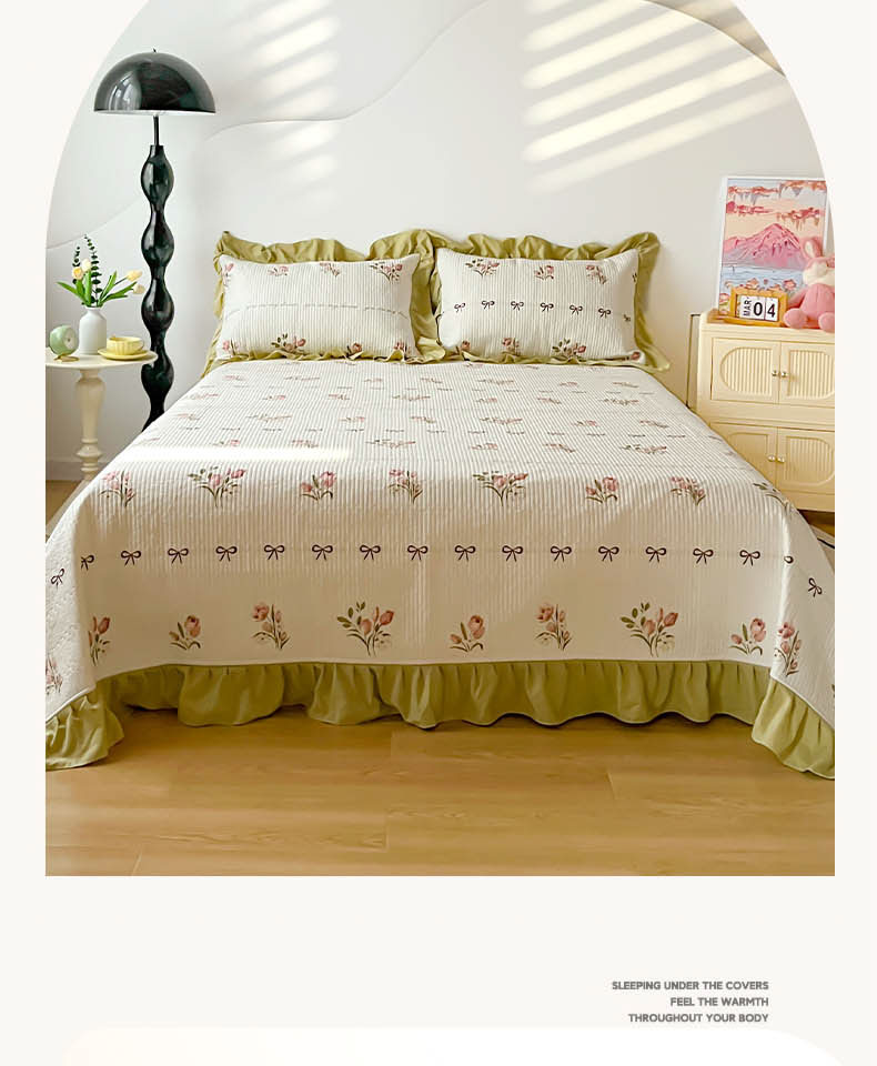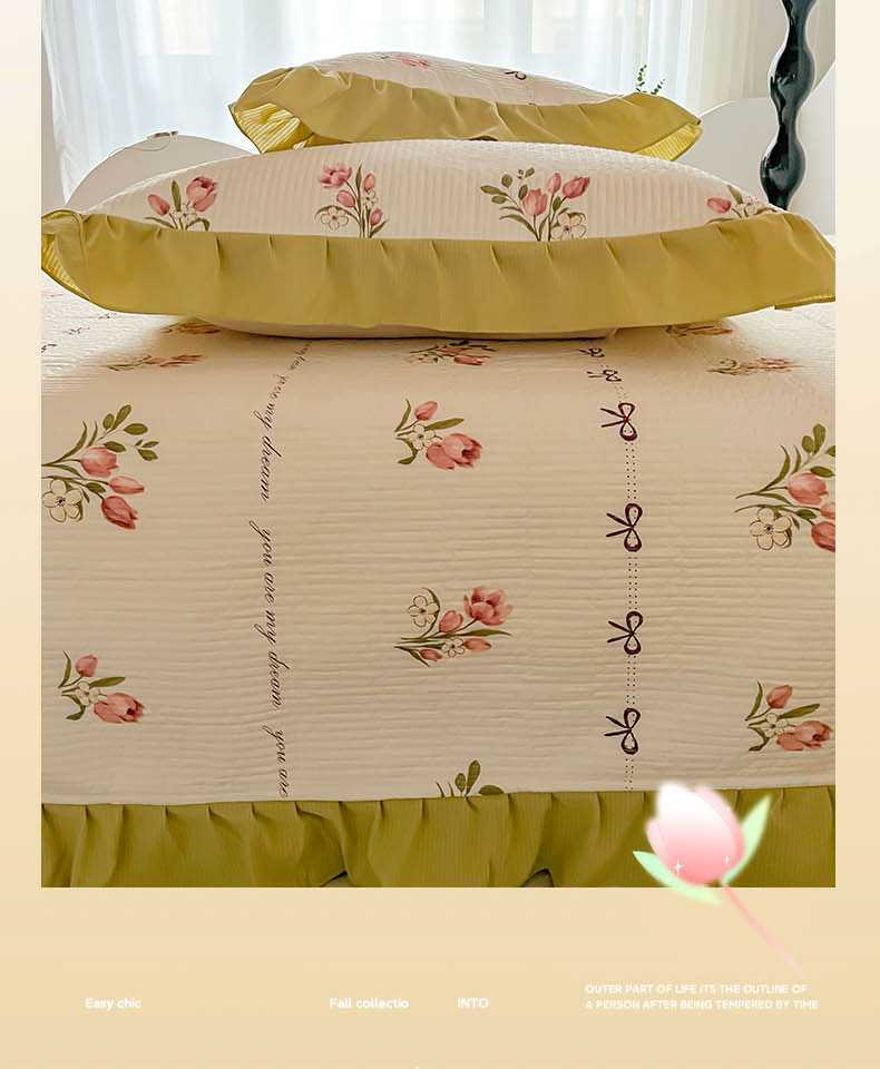(总)子曰 2024新款印花素色花边床盖三件套四件套