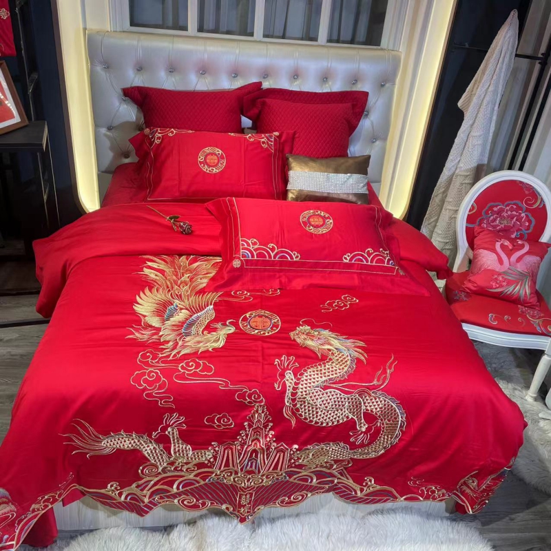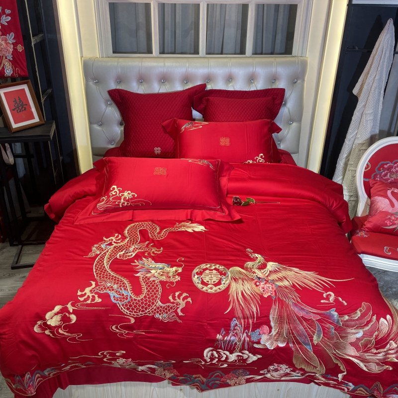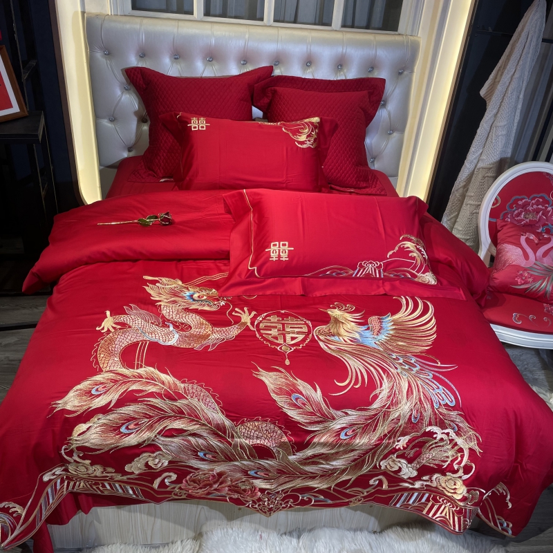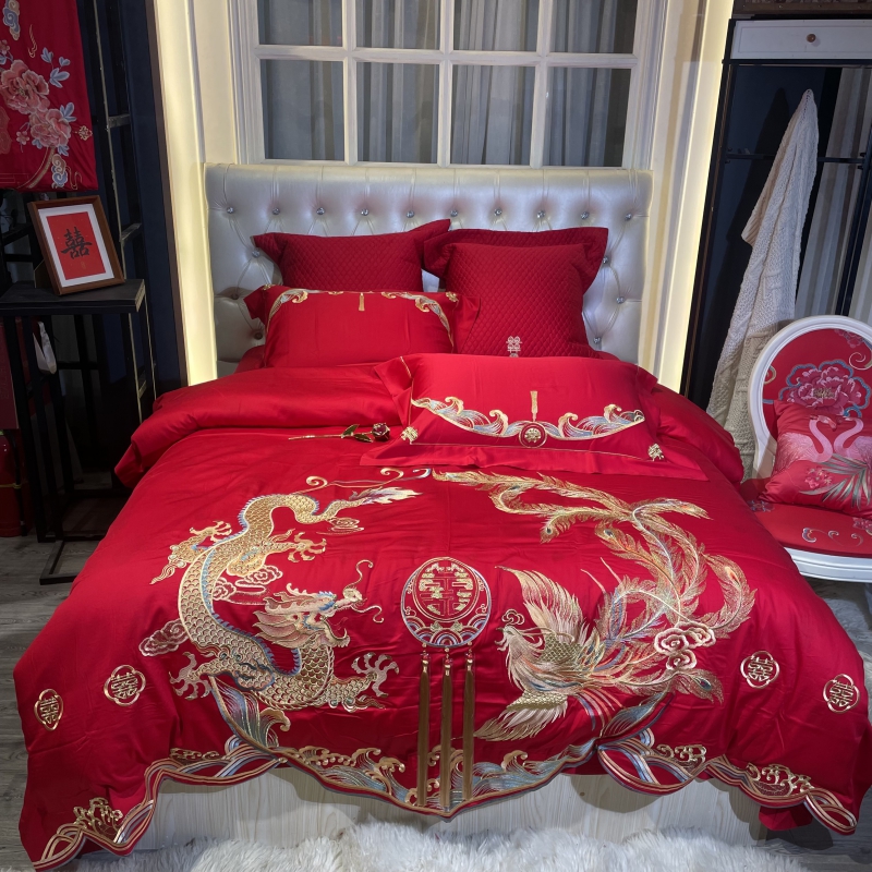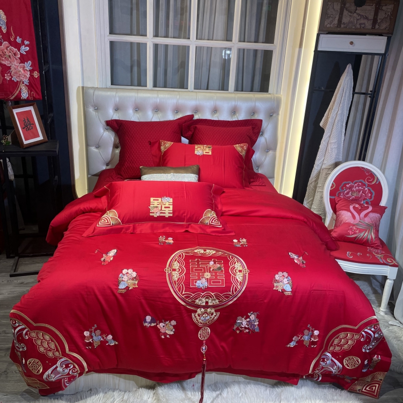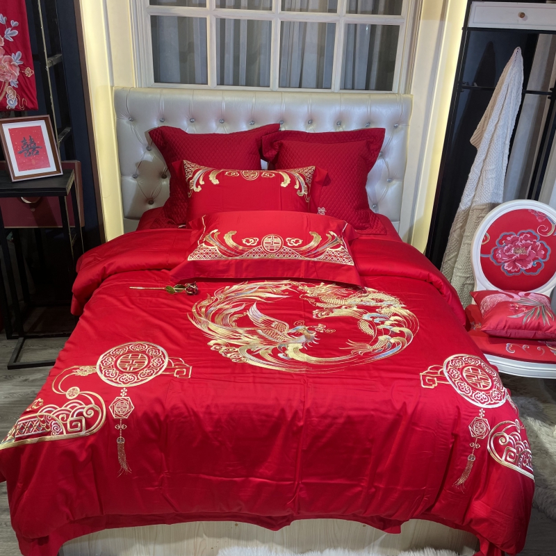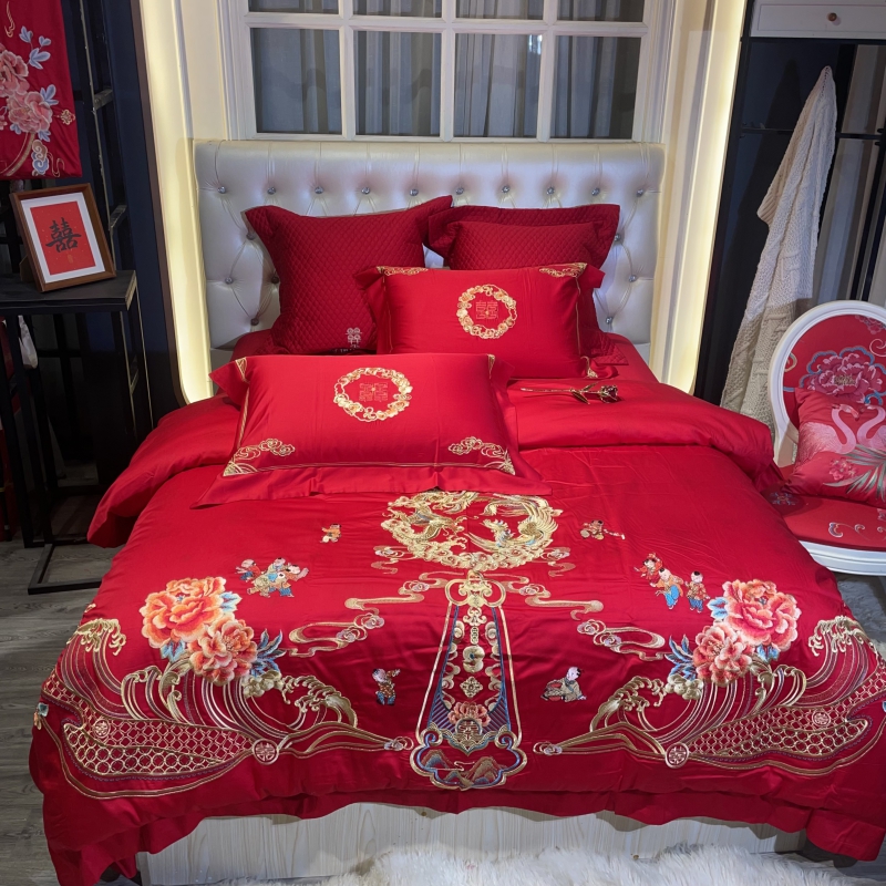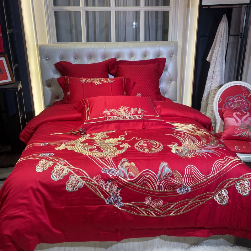 总玖玖爱家纺 新款轻奢风120支贡缎长绒棉高精密刺绣婚嫁系列四件套,欢喜人家,吉祥如意,金色婚典,情定一生,喜迎龙凤