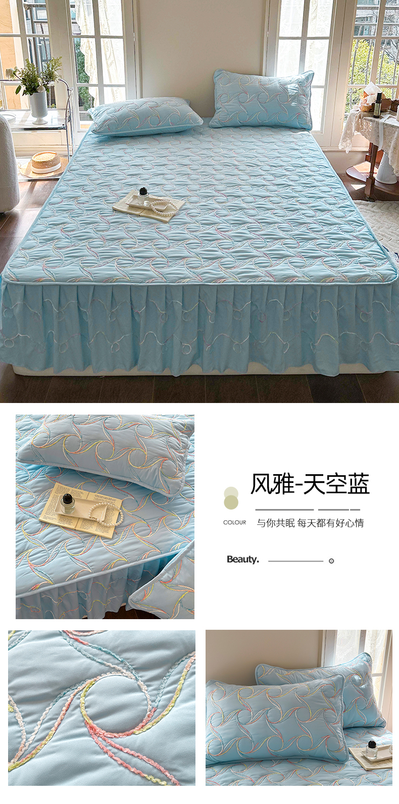 尊康家纺(原磊科) 2024新款亲肤奶昔棉夹棉床裙-风雅 风雅-天空蓝