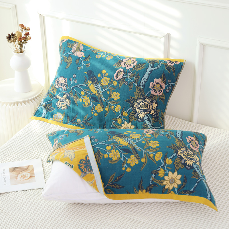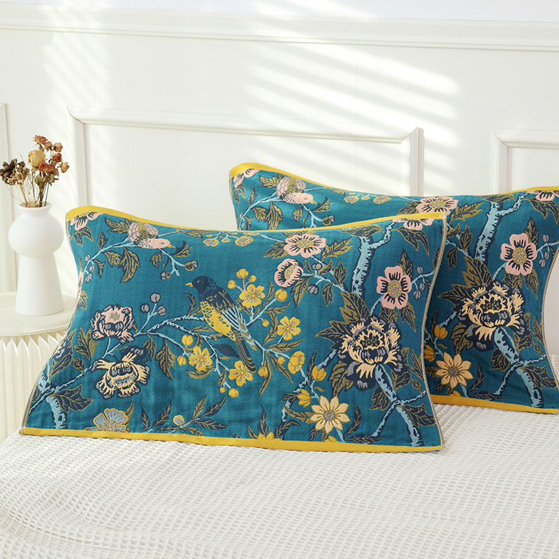 朴尔毛巾被2024新款彩棉国潮风全棉六层纱布枕巾 花间物语-蓝枕巾52*78cm