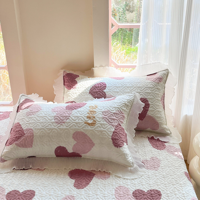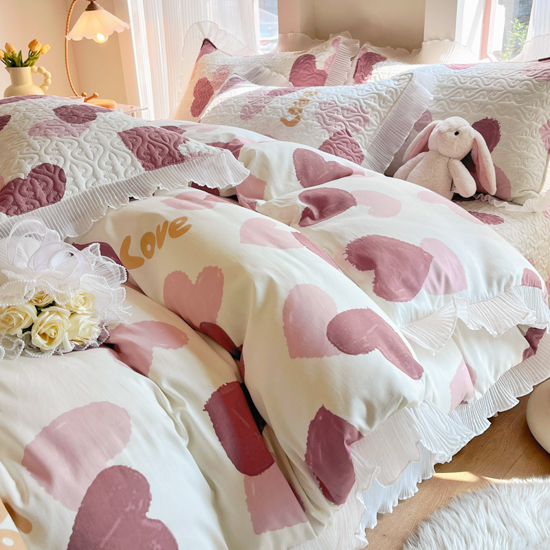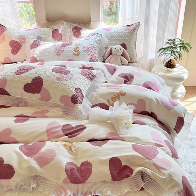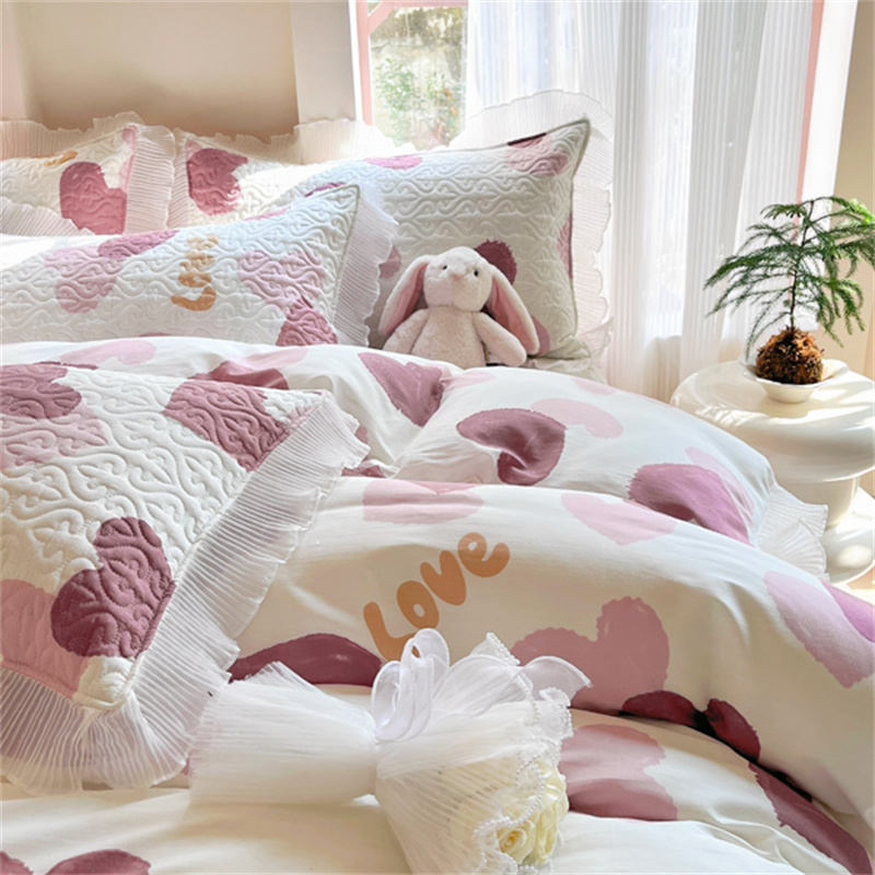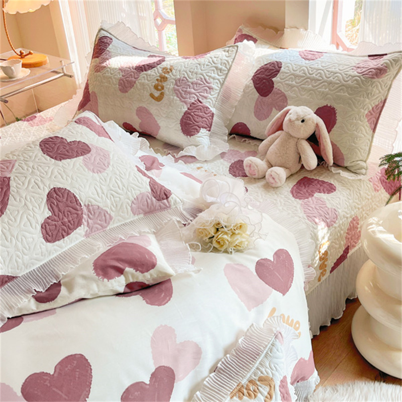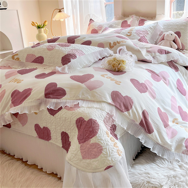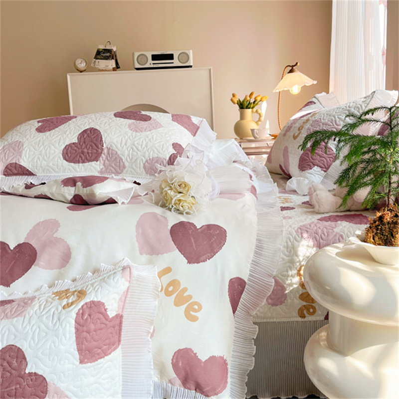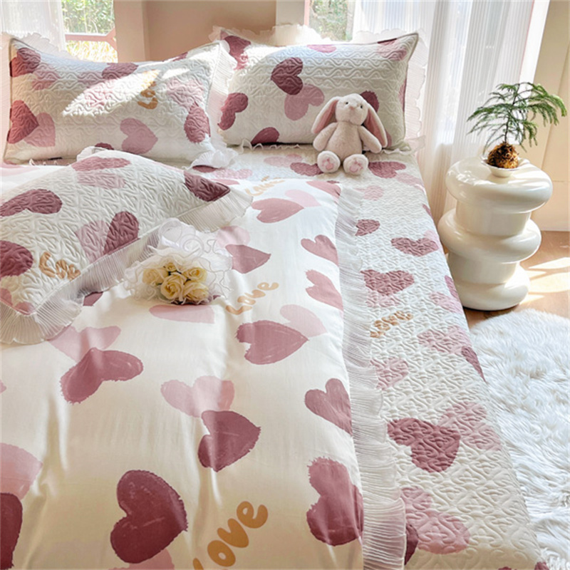 添越 2024小清新韩版蕾丝花边纯棉夹棉床盖三件套全棉-怦然心动-粉