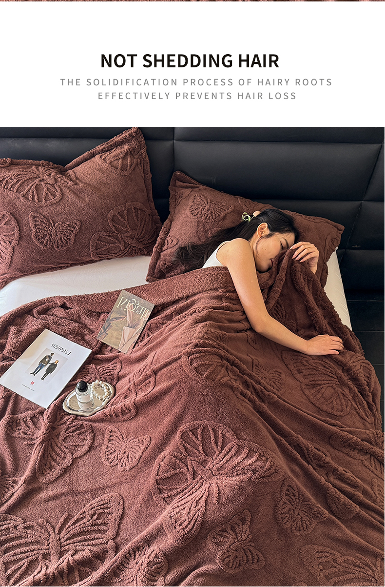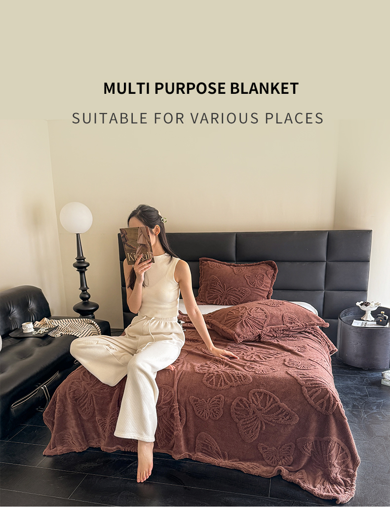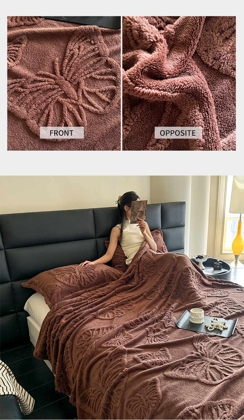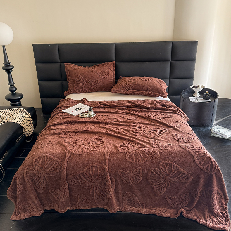 商品名称:2025款塔芙绒蝴蝶提花毛毯 纯色多功能休闲盖毯 爆款花型 电商/直播/外贸/跨境专供 蝴蝶棕