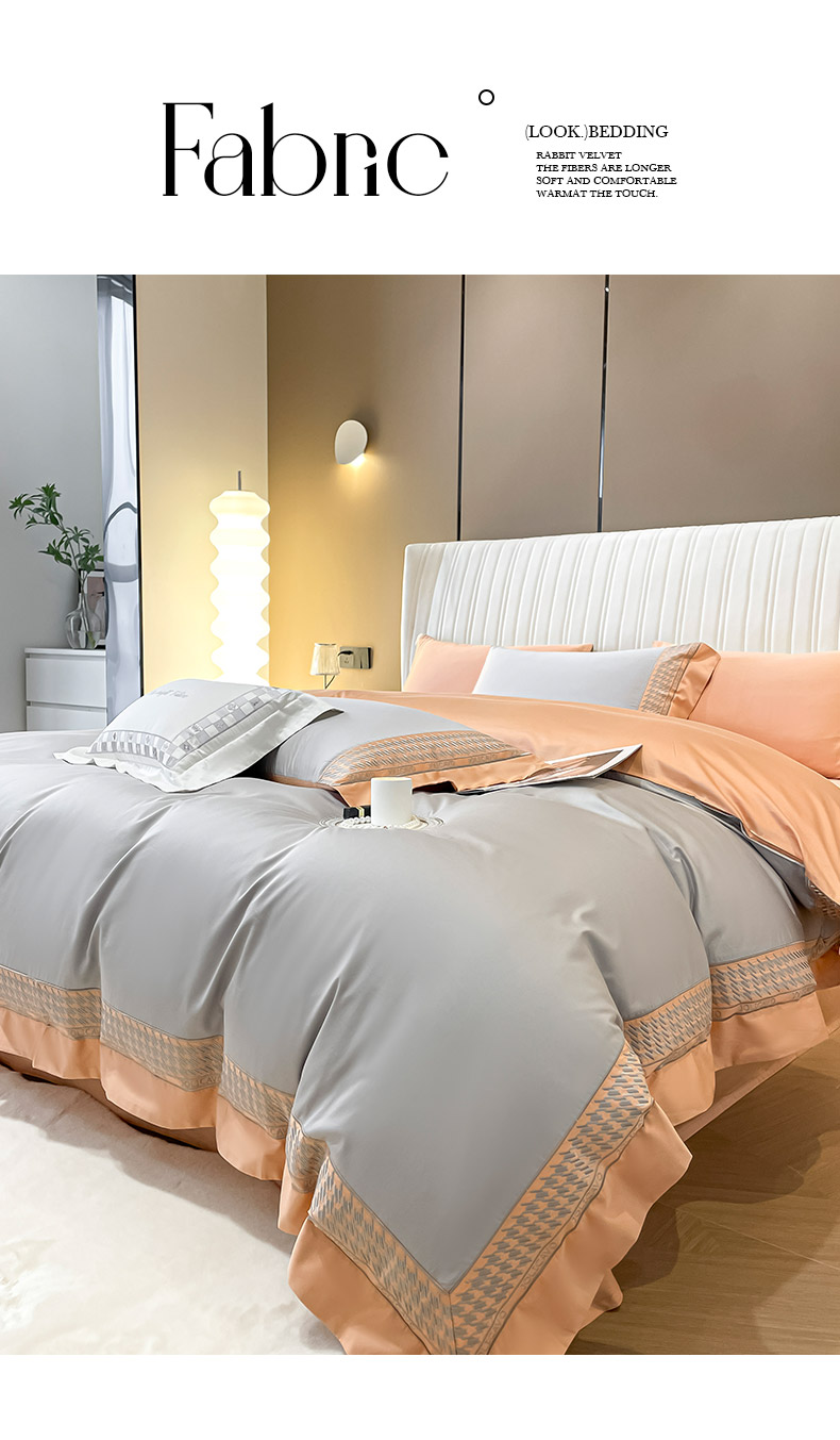 60支贡缎长绒棉四件套2023新款全棉纯棉千鸟格刺绣床单被套新疆棉100支床上用品床笠款 千鸟格-雾霾银
