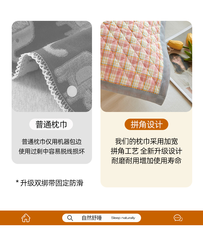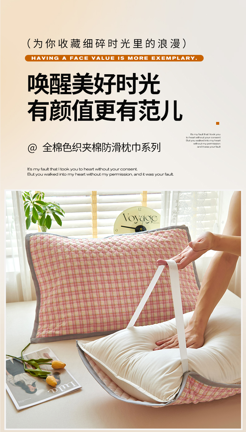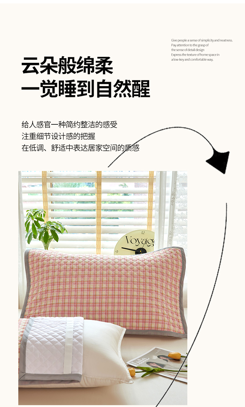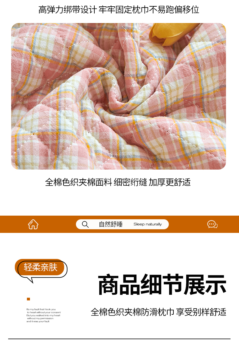 商品名称:美宜家 2025枕巾全棉水洗色织绗缝绑带防滑枕巾,加厚夹棉透气隔脏防头油拼角枕巾 明古粉