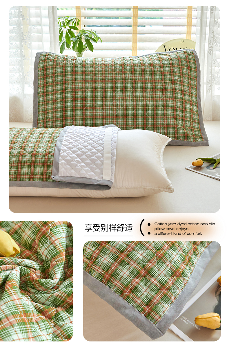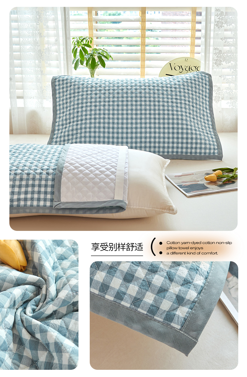 美宜家 2025枕巾全棉水洗色织绗缝绑带防滑枕巾,加厚夹棉透气隔脏防头油拼角枕巾 明古粉
