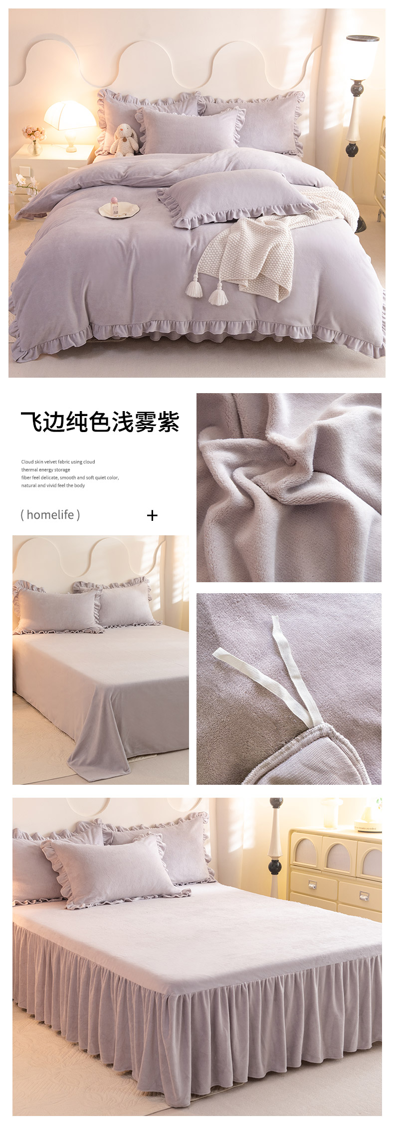 当前位置: 91家纺网 > 商品网购 > 床品套件 > 四件套 > 牛奶绒四件套 > 恩和家纺 2024新款高克重200g牛奶绒飞边款四件套 飞边纯色浅雾紫