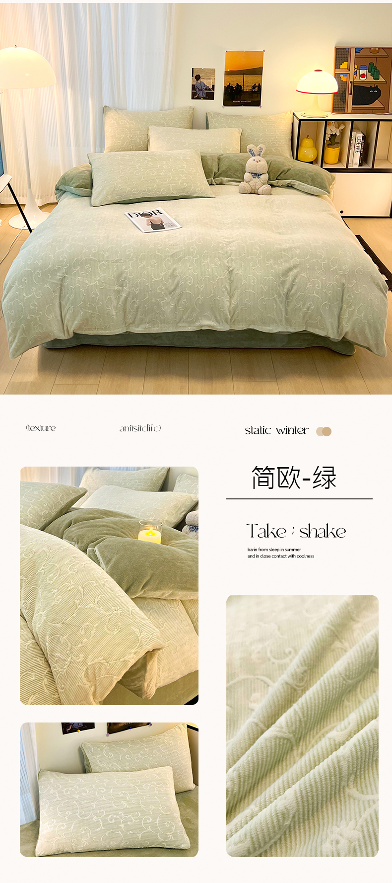 当前位置: 91家纺网 > 商品网购 > 床品套件 > 四件套 > 牛奶绒四件套 > 2024新款原创白色小清新场景雕花牛奶绒单被套四件套 简欧-绿