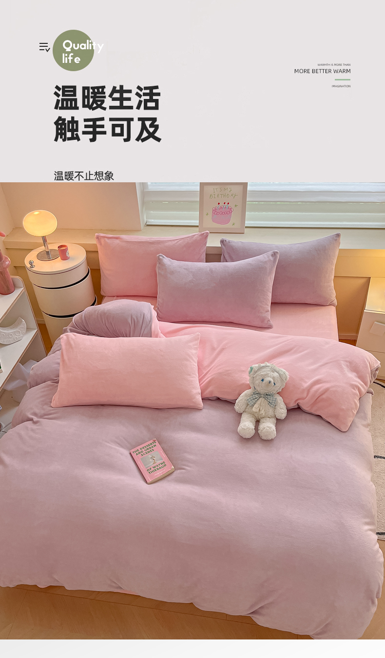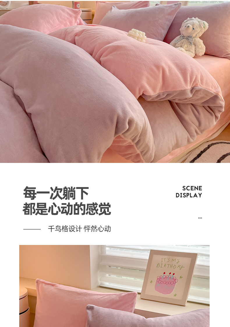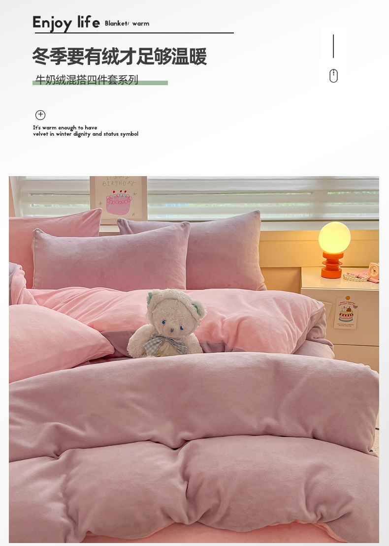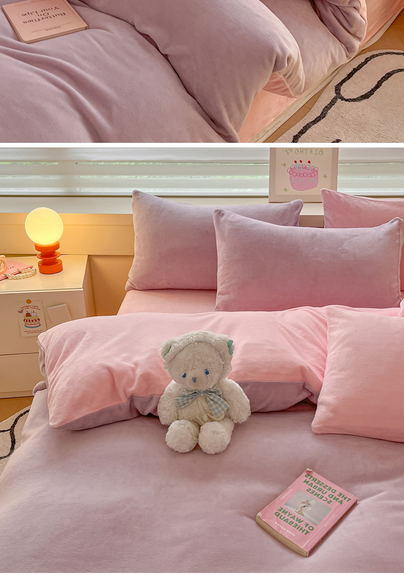 当前位置: 91家纺网 > 商品网购 > 床品套件 > 四件套 > 牛奶绒四件套 > 三朵家纺 2024新款加厚保暖牛奶绒混搭系列四件套 淡紫+粉玉