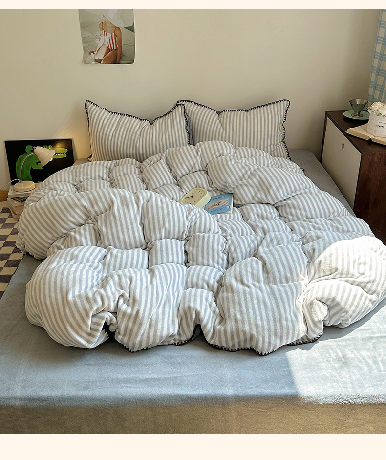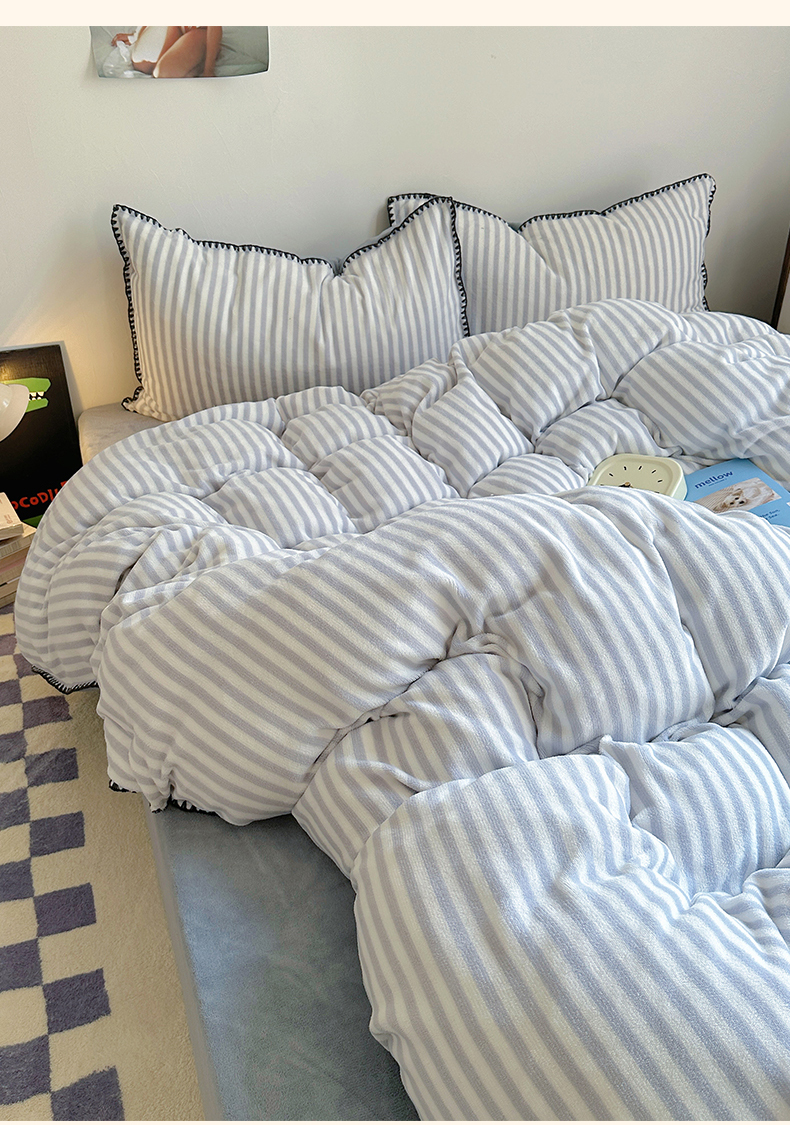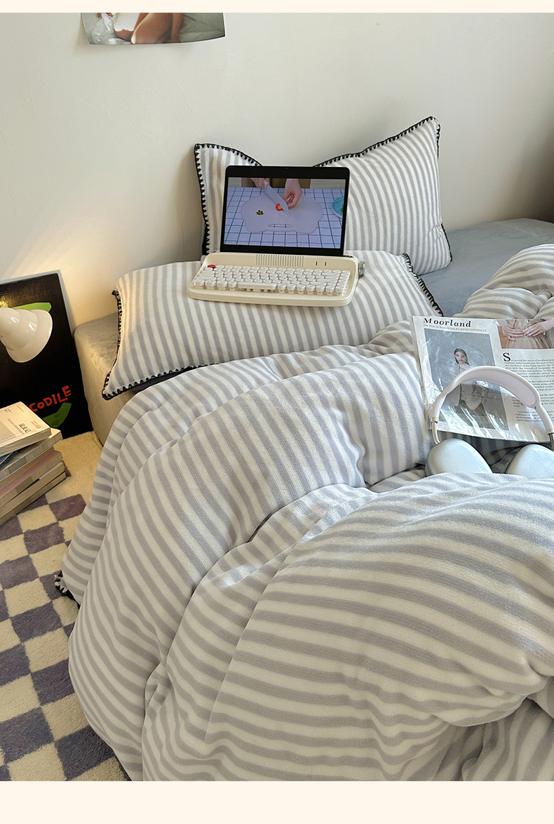 三朵 2024新款无印风牛奶绒四件套 淡雅灰细条