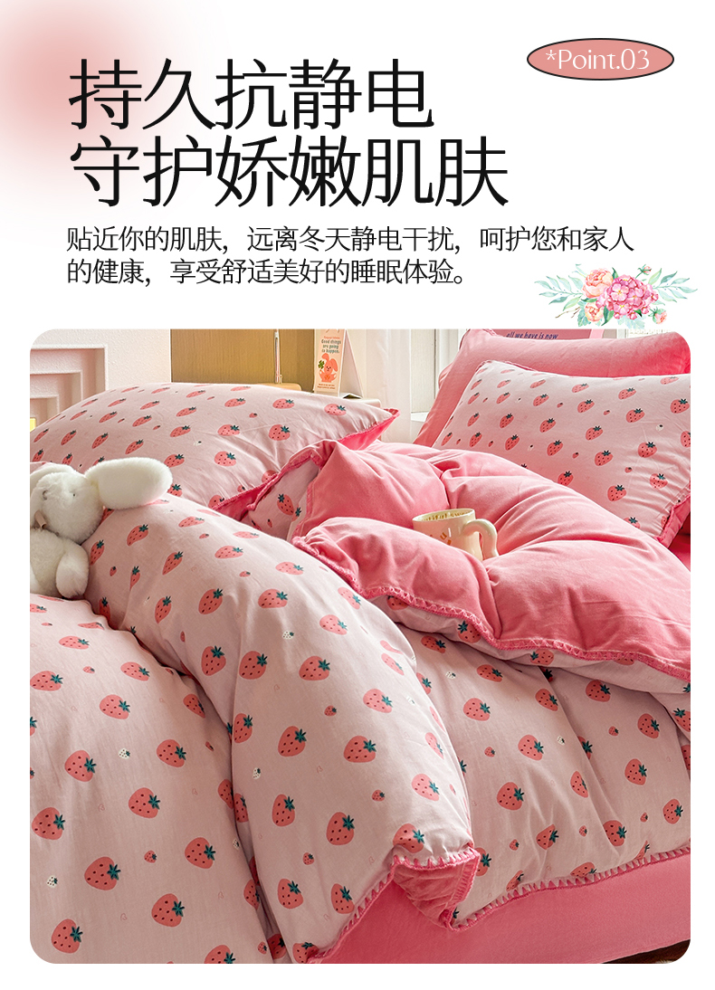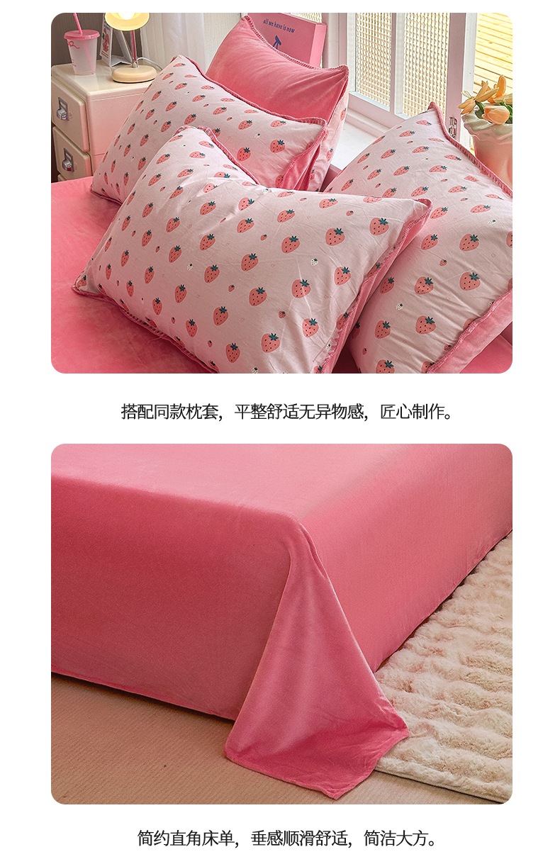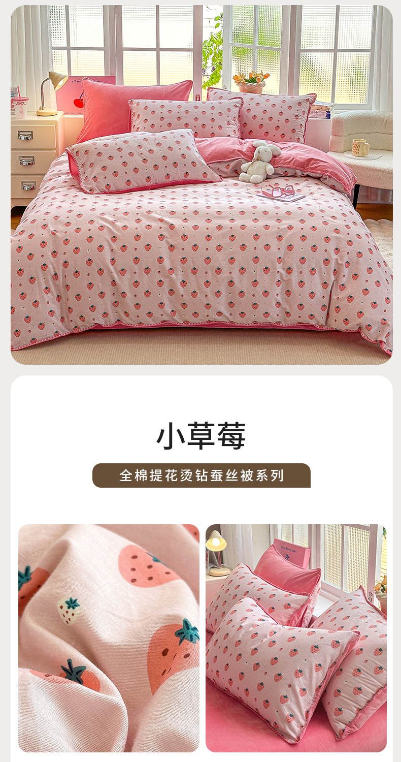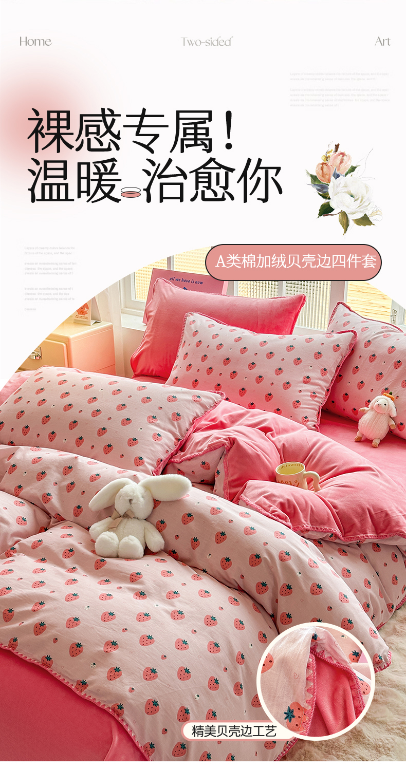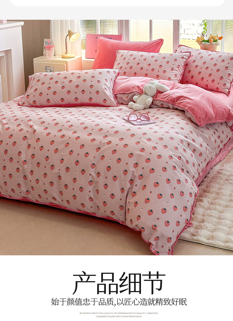 当前位置: 91家纺网 > 商品网购 > 床品套件 > 四件套 > 牛奶绒四件套 > 2025新款三角针贝壳边棉加牛奶绒工艺款四件套 小草莓