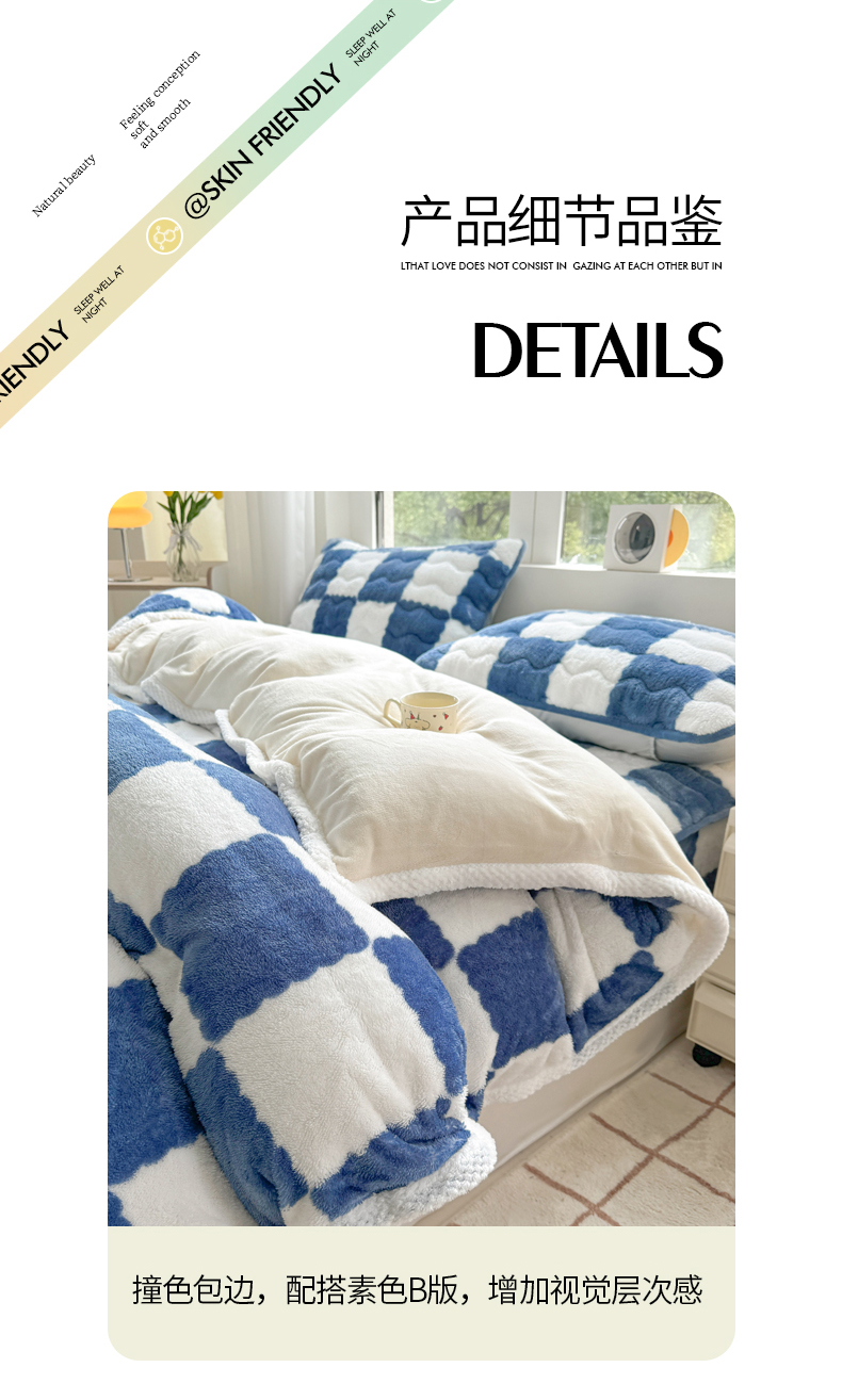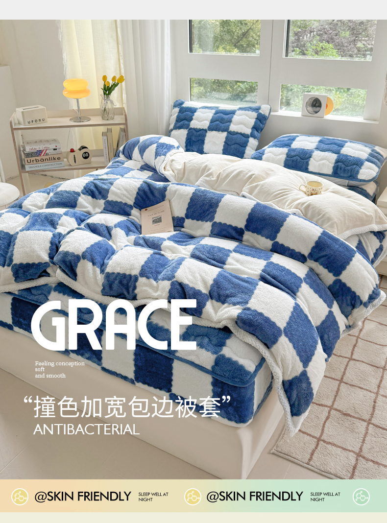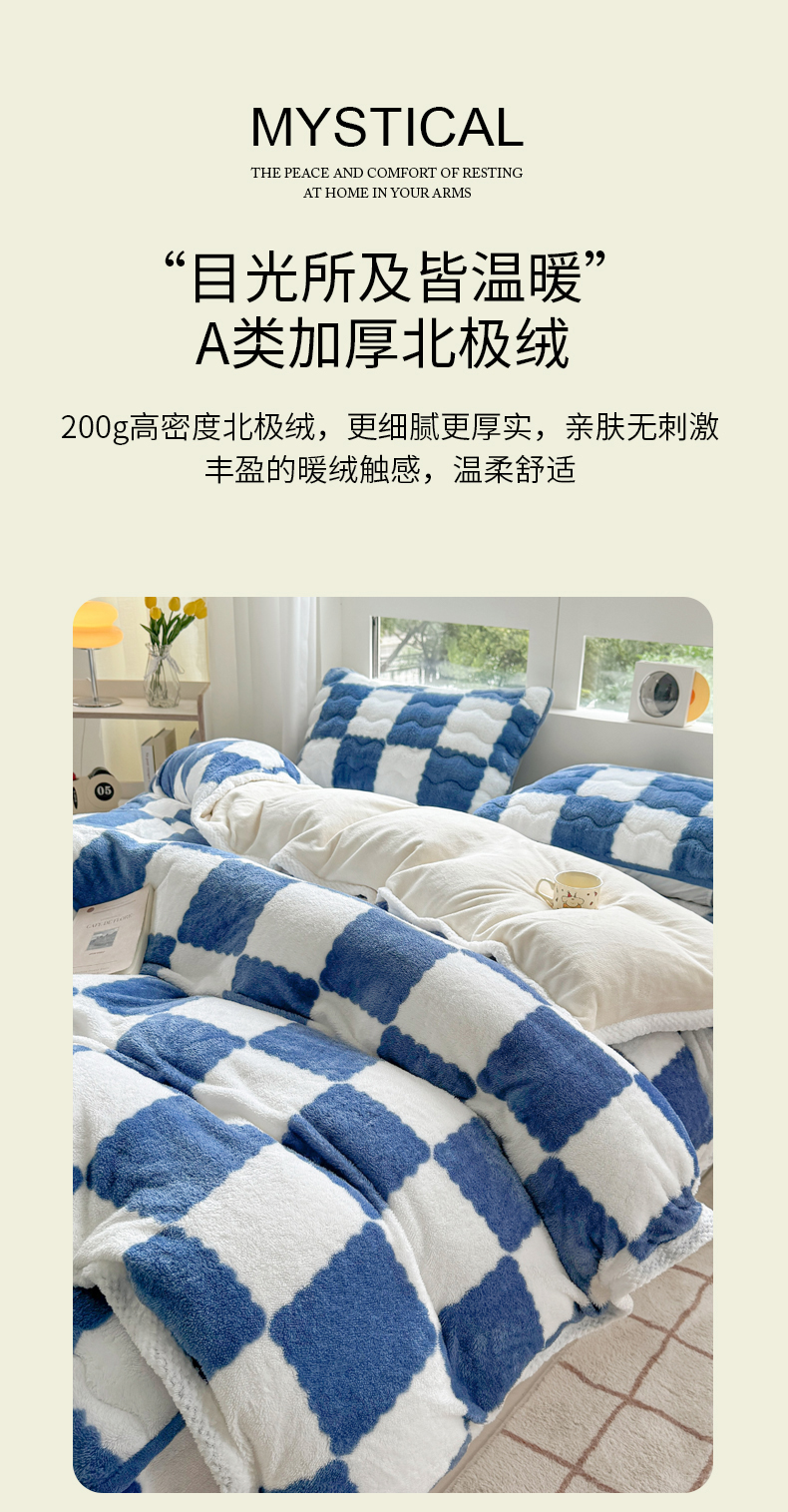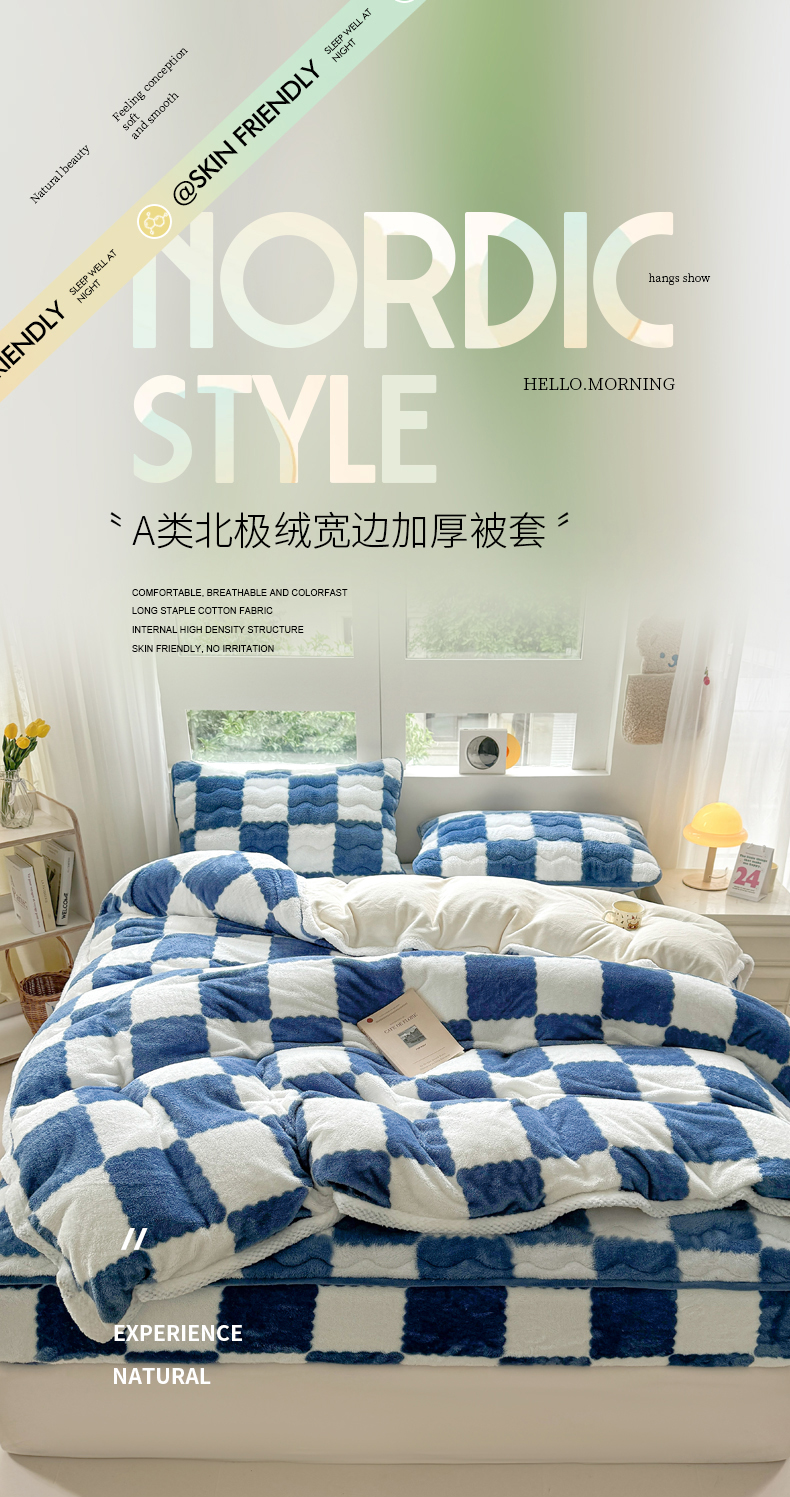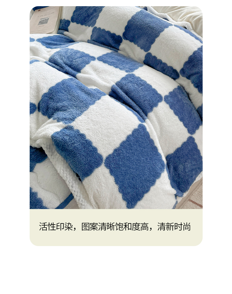 商品名称:2024新款A类北极绒格子-条纹系列宽包边加厚被套(自然光图) 棋盘格-高贵蓝