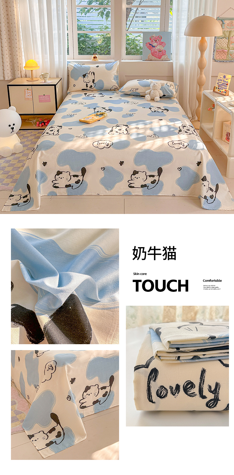 吉象家纺 2024新款高支密全棉印花单床单 奶牛猫