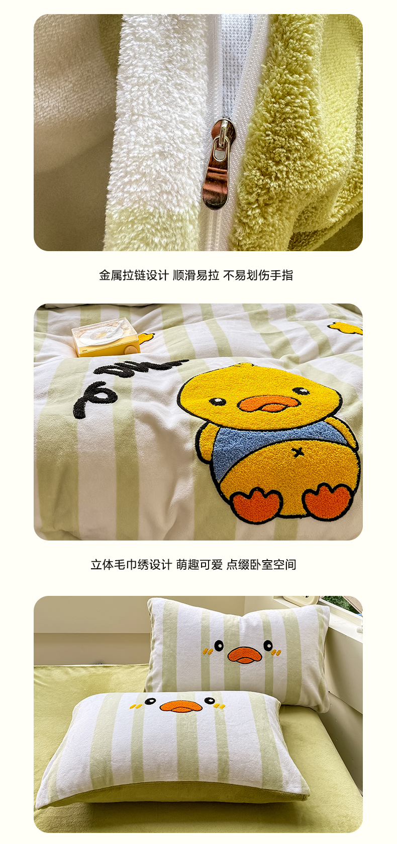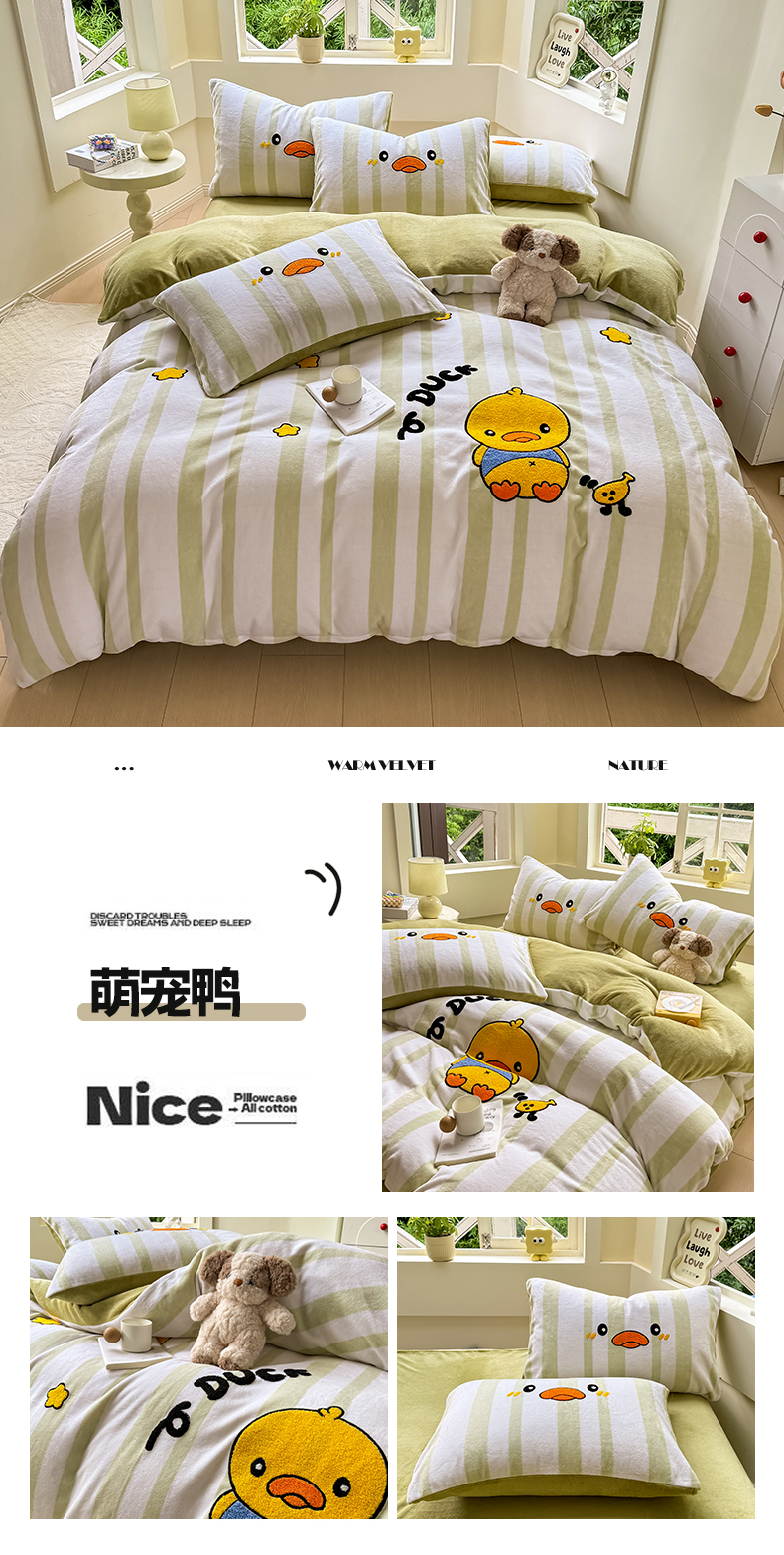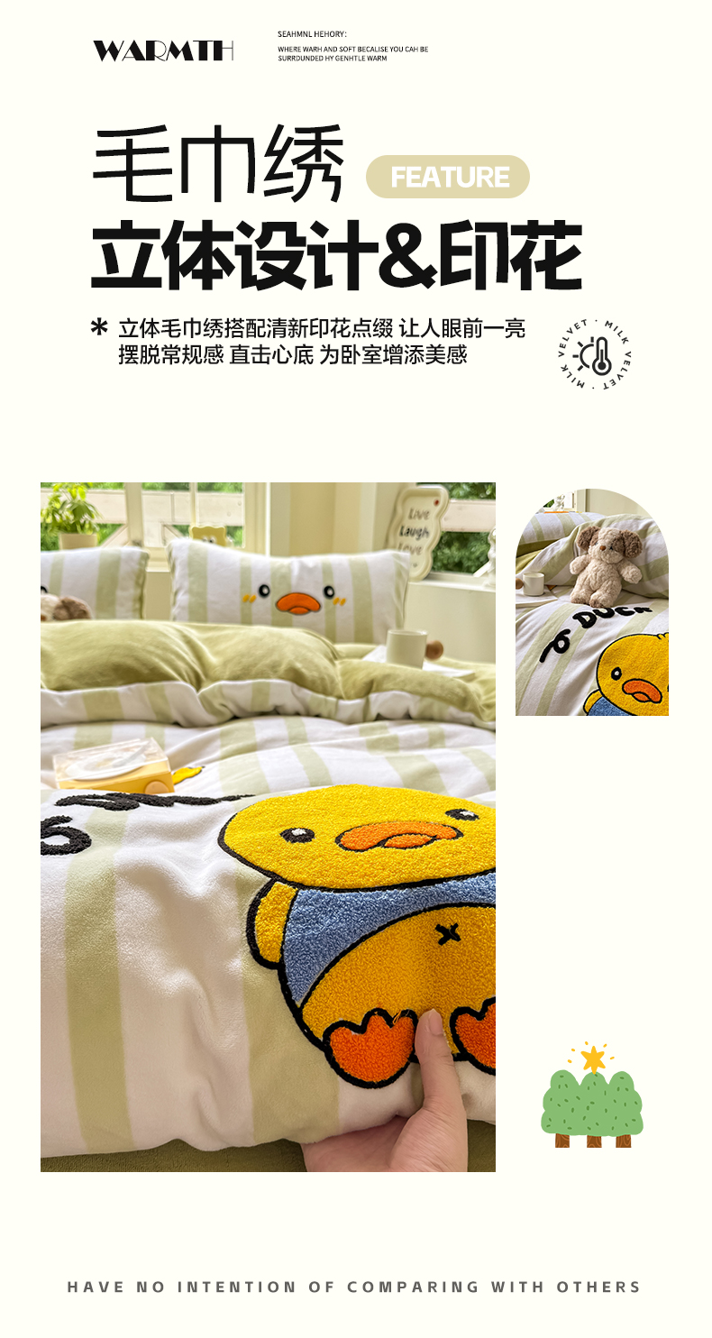 商品名称:帅露家纺 2024新款高克重牛奶绒数码印花毛巾绣四件套 萌宠鸭