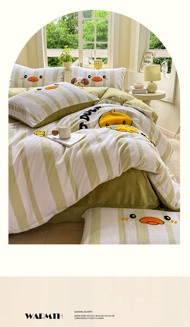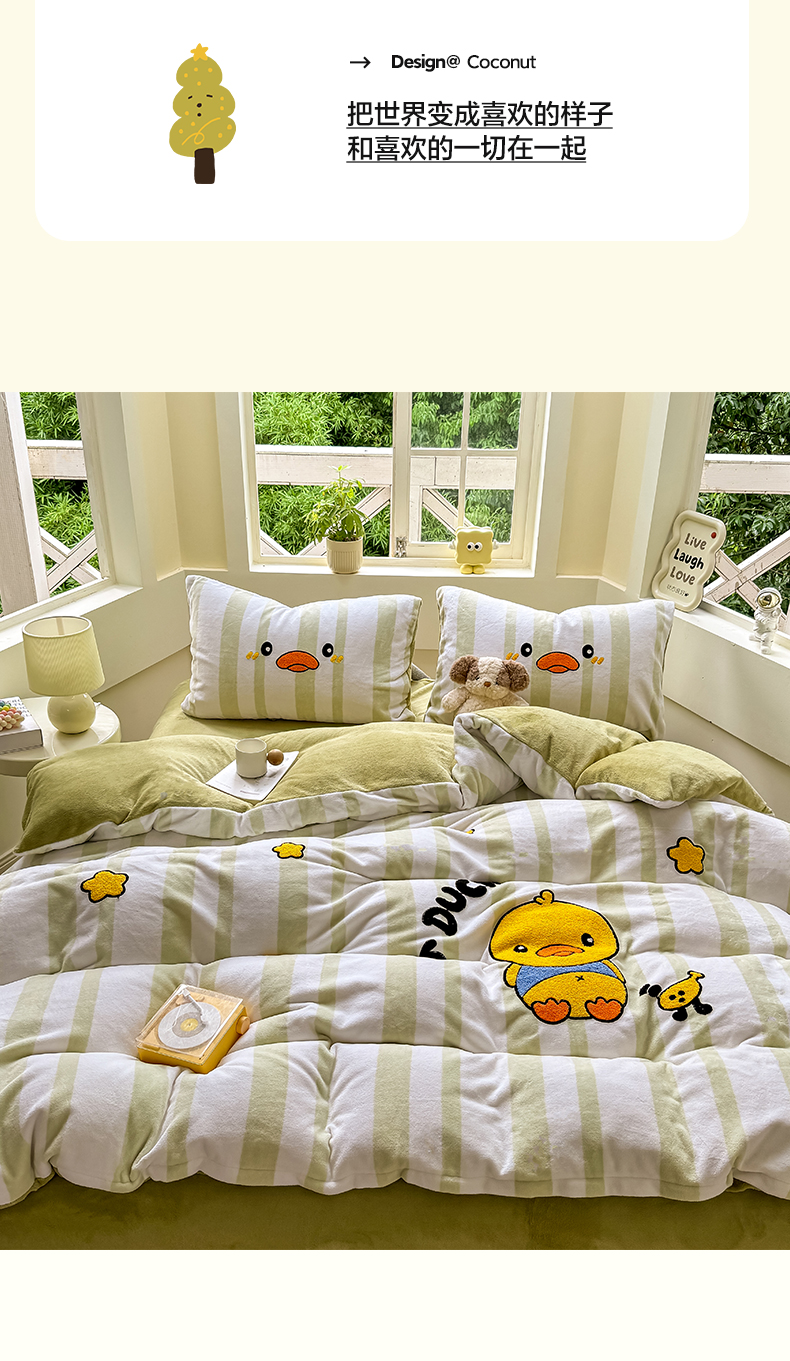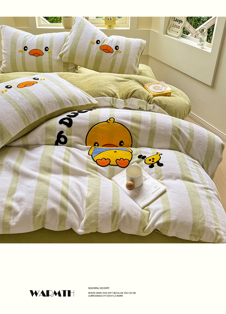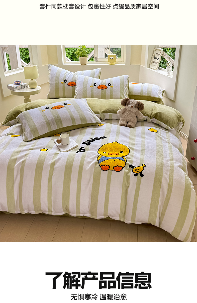 商品名称:帅露家纺 2024新款高克重牛奶绒数码印花毛巾绣四件套 萌宠鸭