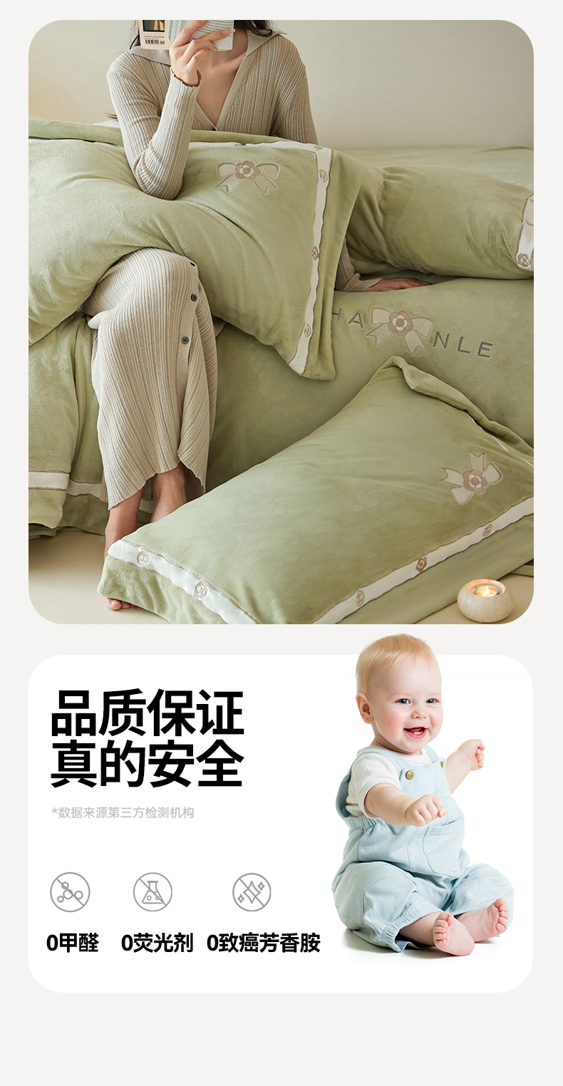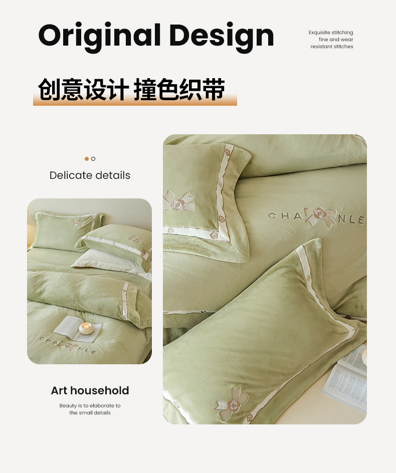 商品名称:名品优仓 2024新款高克重牛奶绒绣花撞色织带四件套-贝琳娜 贝琳娜-绿矾